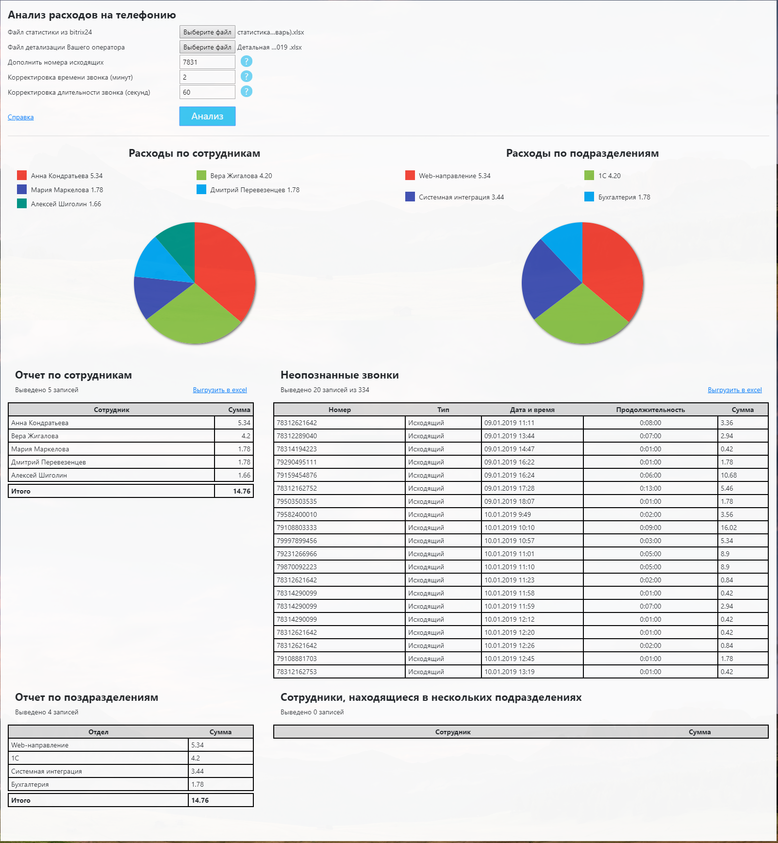 Обратите внимание на 2 дополнительные таблицы: Неопознанные звонки и Сотрудники в нескольких подразделениях.