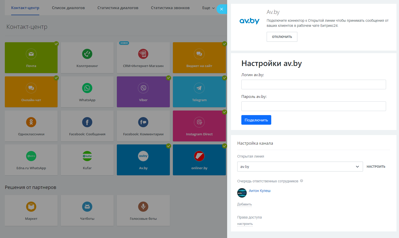 Приложение позволяет вести коммуникации c клиентами площадки автообъявлений av.by с помощью открытых линий Битрикс24.