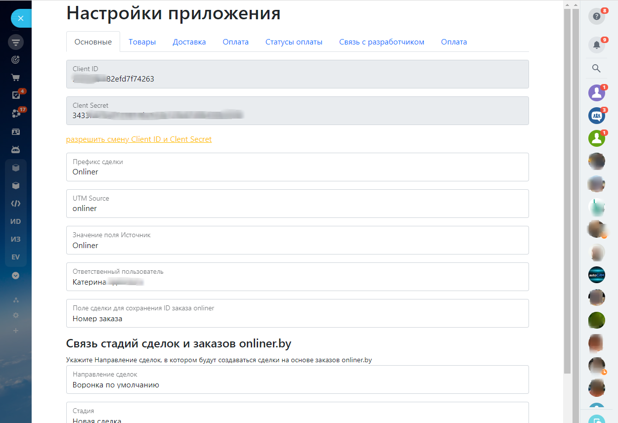 Передача данных о способе доставки, оплаты и статусу оплаты прямо в карточку сделки;