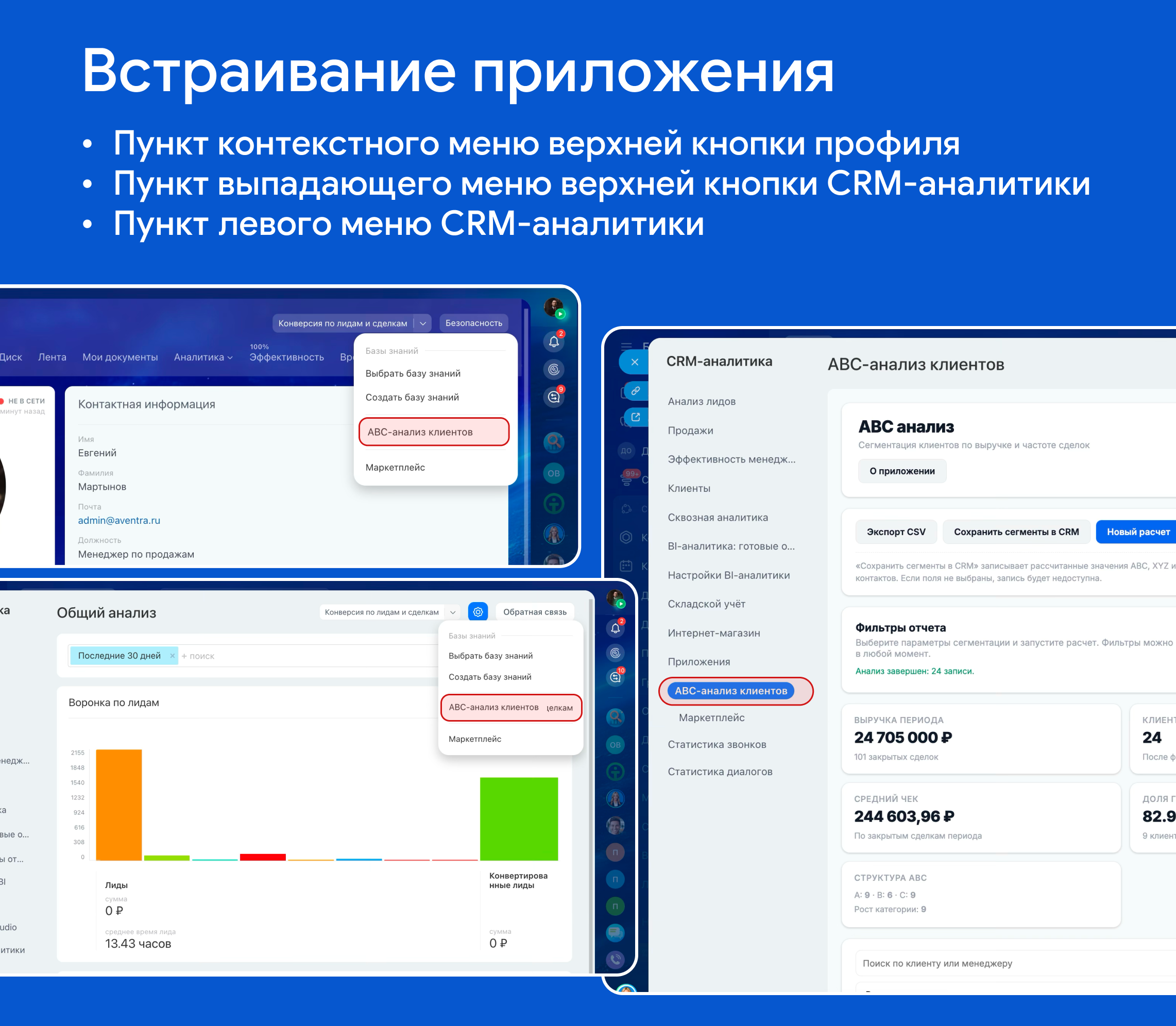 • Запись рассчитанных значений (ABC, XYZ, выручка) в выбранные поля CRM.
