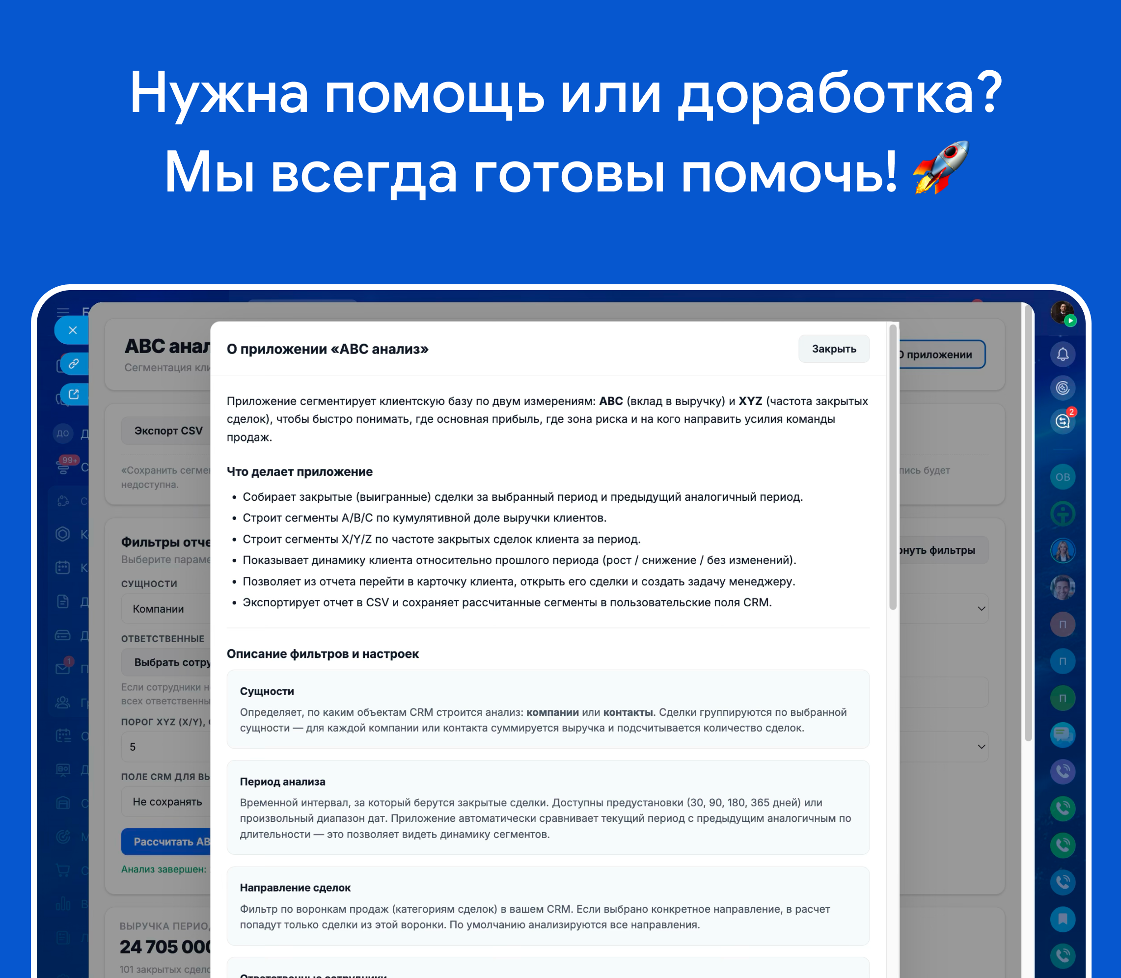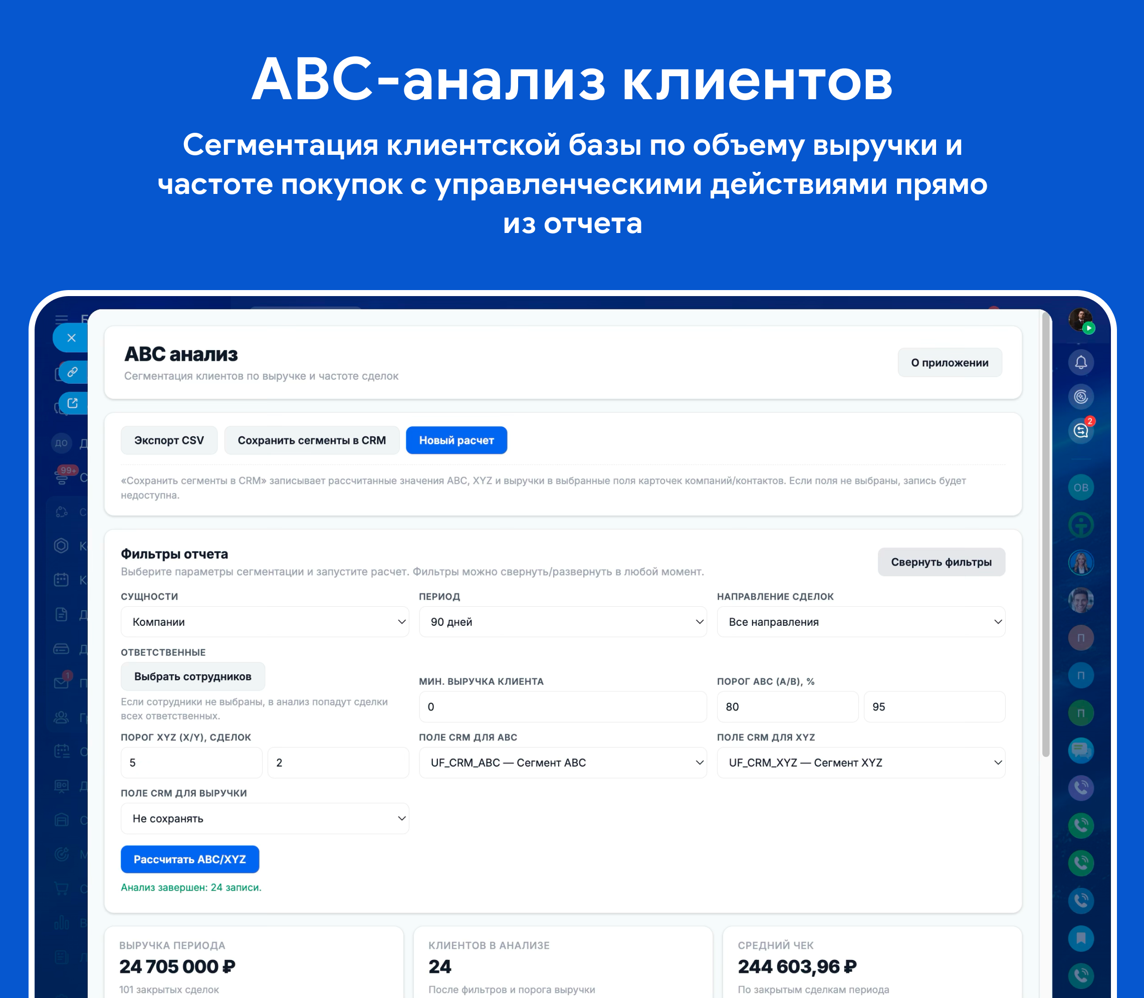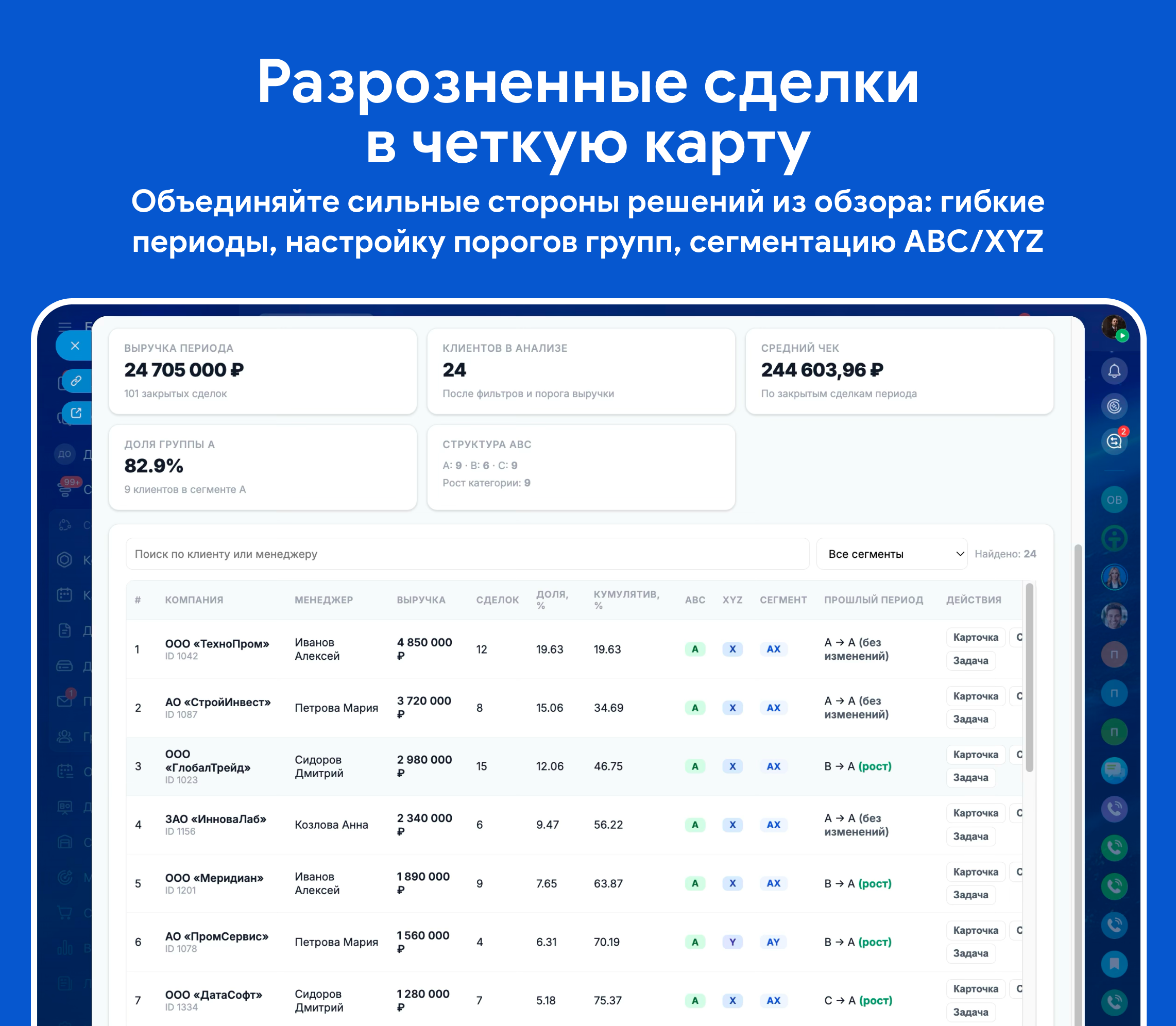 Приложение объединяет сильные стороны решений из обзора: гибкие периоды, настройку порогов групп, сегментацию ABC/XYZ, сравнение с прошлым периодом, быстрые переходы к карточкам и сделкам, постановку задач менеджерам и сохранение результатов анализа в поля CRM.