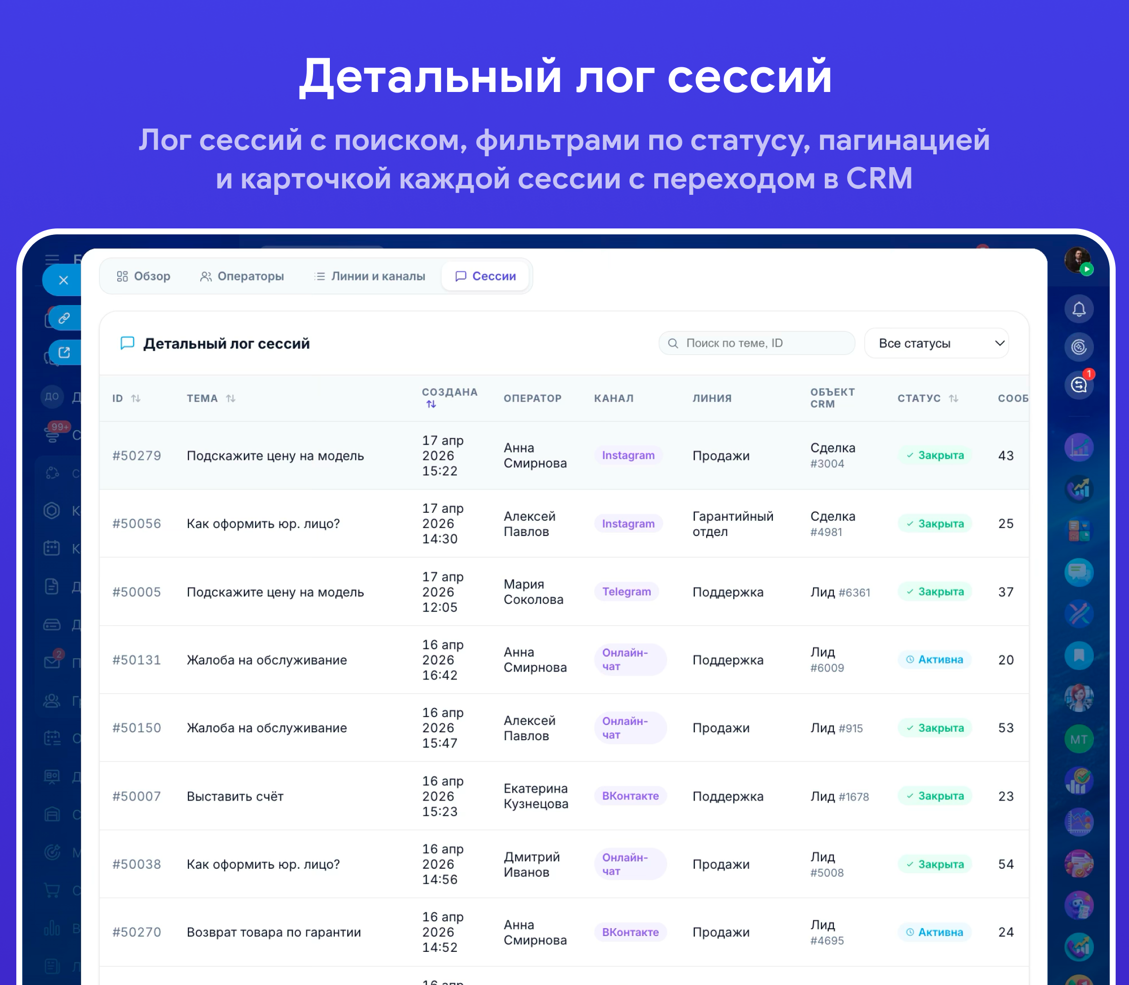 • Детальный лог сессий с поиском, фильтрами по статусу, пагинацией и карточкой каждой сессии с переходом в CRM.
