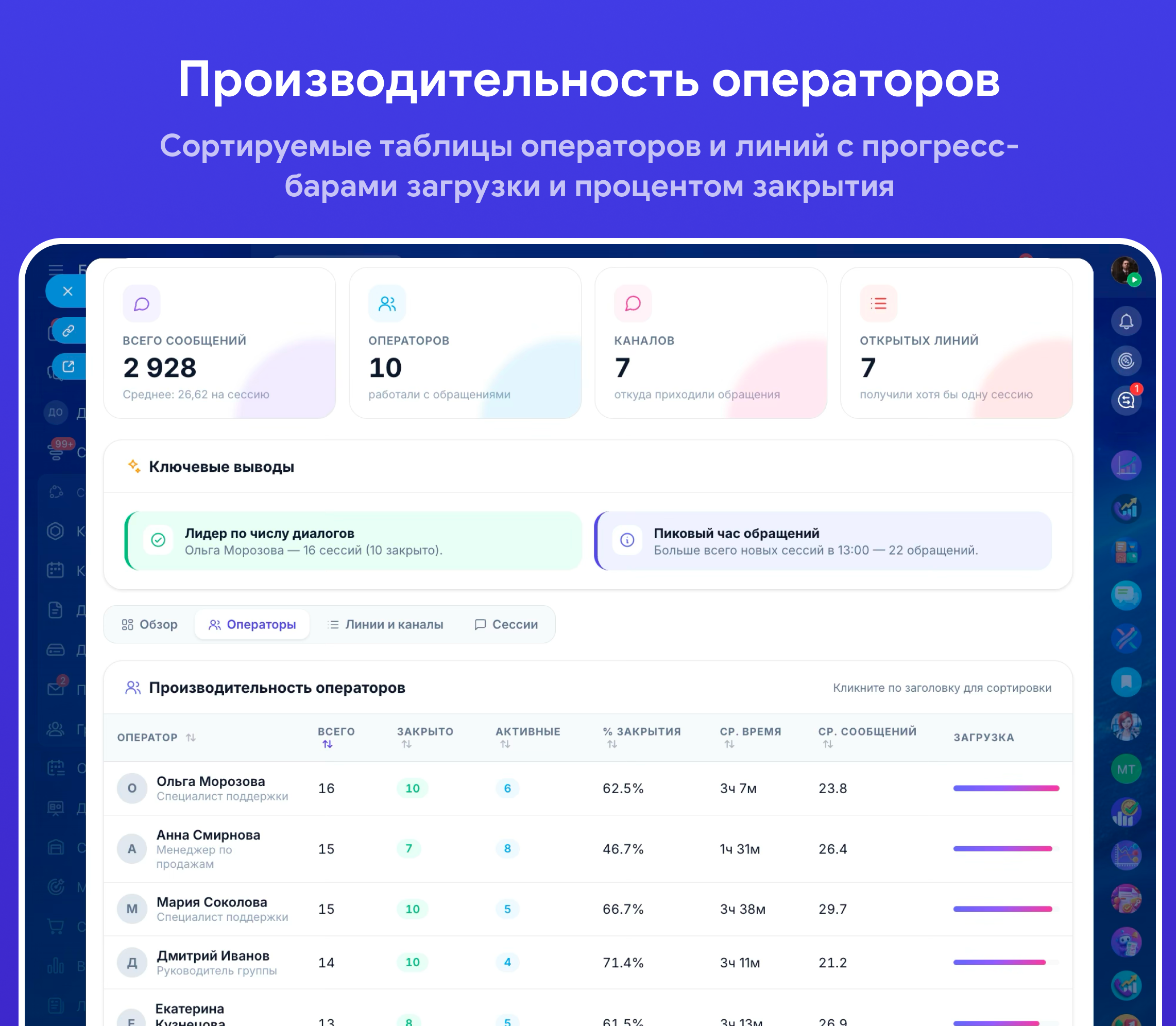 • Ключевые выводы: приложение автоматически подсвечивает проблемные зоны (низкий процент закрытия, перегруженных операторов, долго «висящие» диалоги и т. д.).