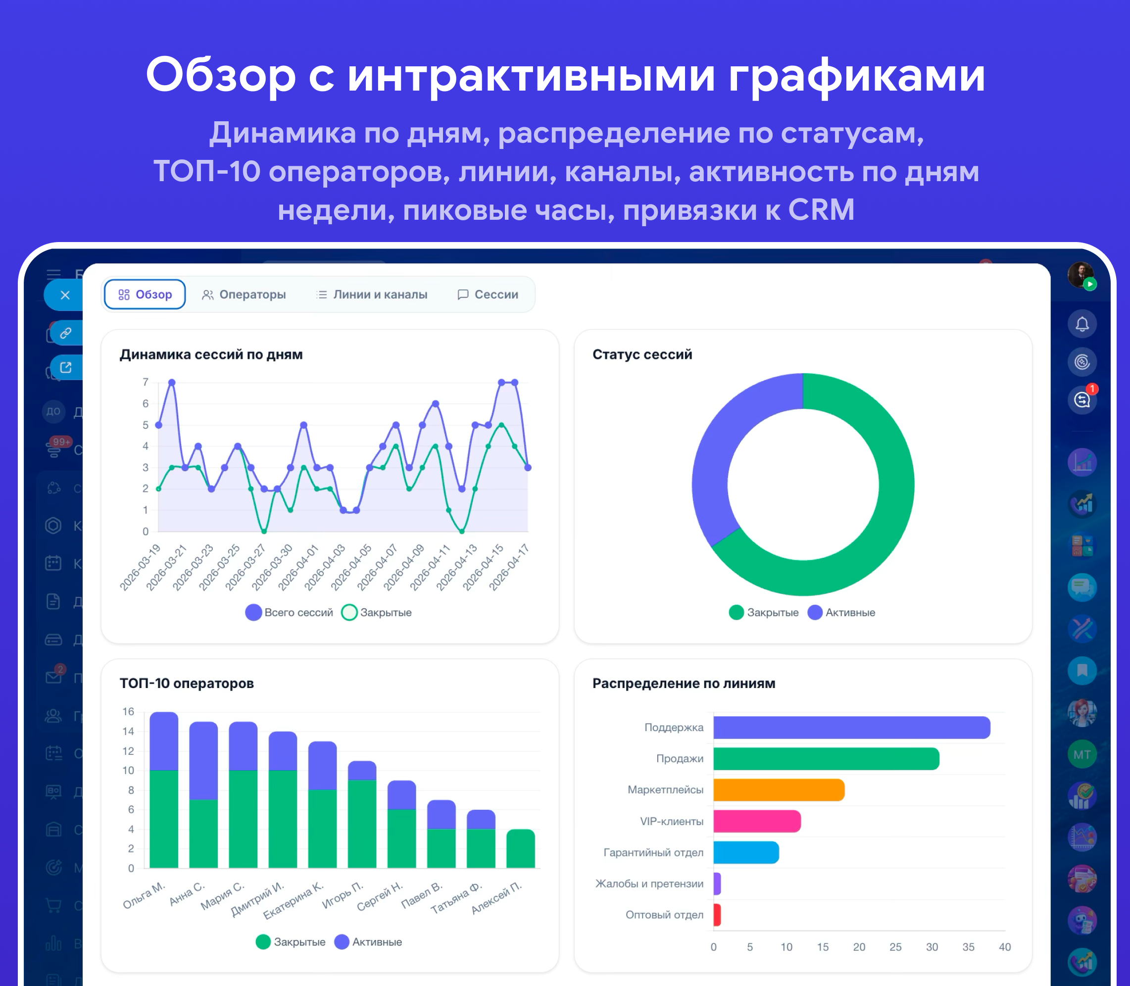 • 8 KPI-плиток: всего сессий, закрытые, активные, среднее время жизни, сообщения, операторы, каналы, линии.