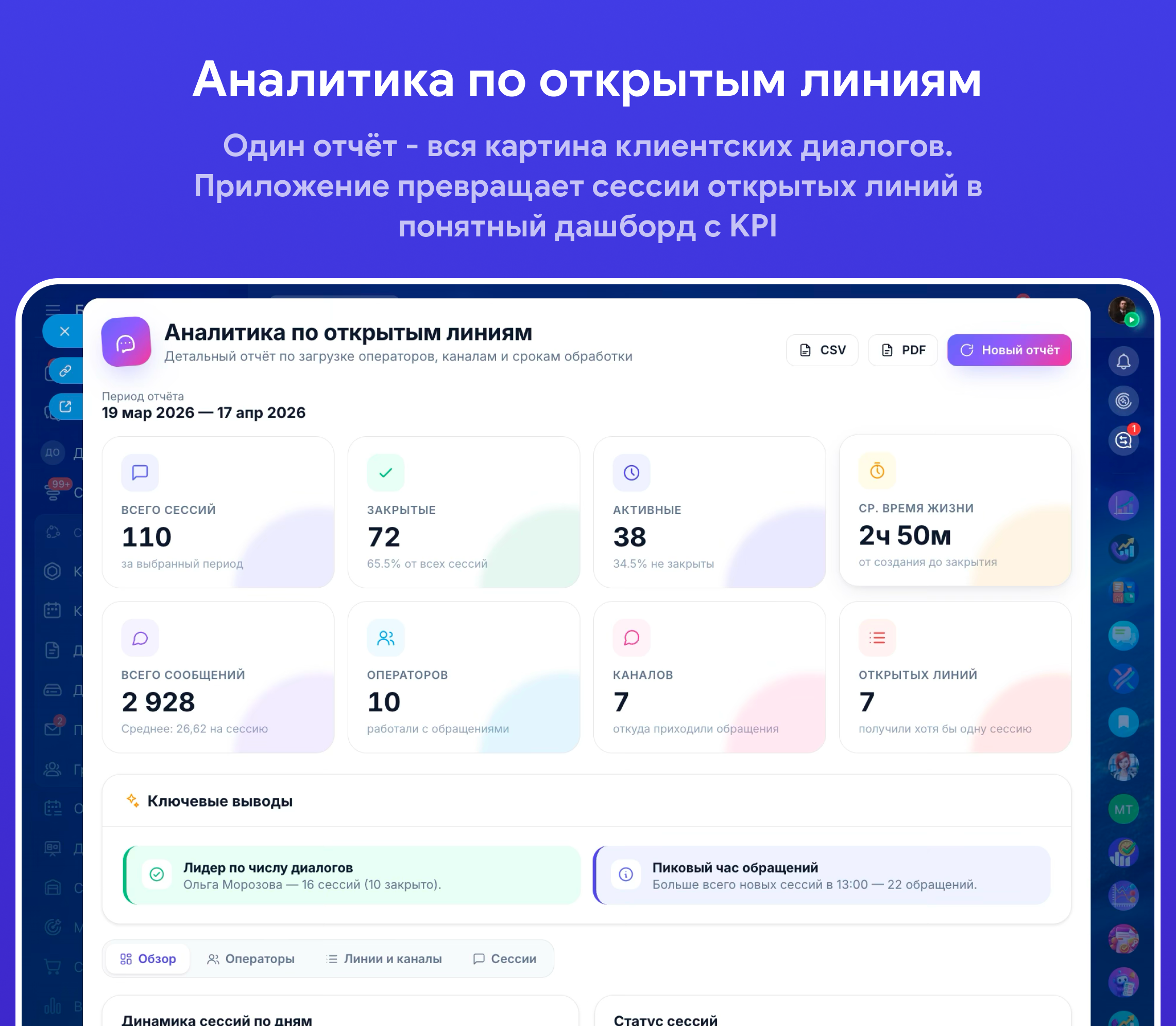 Один отчёт - вся картина клиентских диалогов. Приложение превращает сессии открытых линий в понятный дашборд с KPI, графиками и готовым PDF-отчётом - чтобы руководитель видел загрузку операторов, эффективность каналов и узкие места обслуживания за любой период.