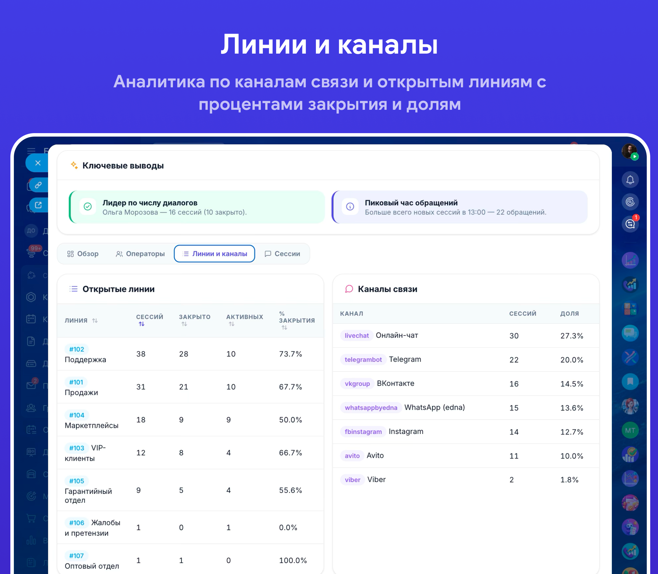• Сравнивает эффективность каналов (Онлайн-чат, Telegram, WhatsApp, Viber, Instagram, ВКонтакте и др.).