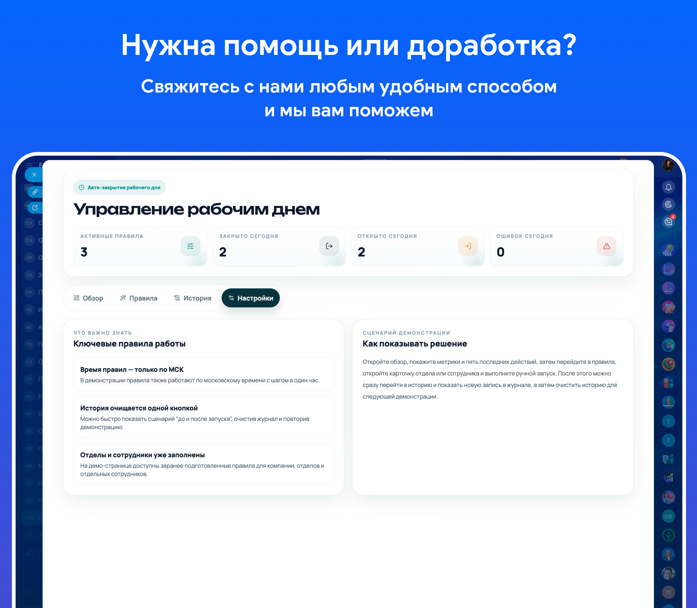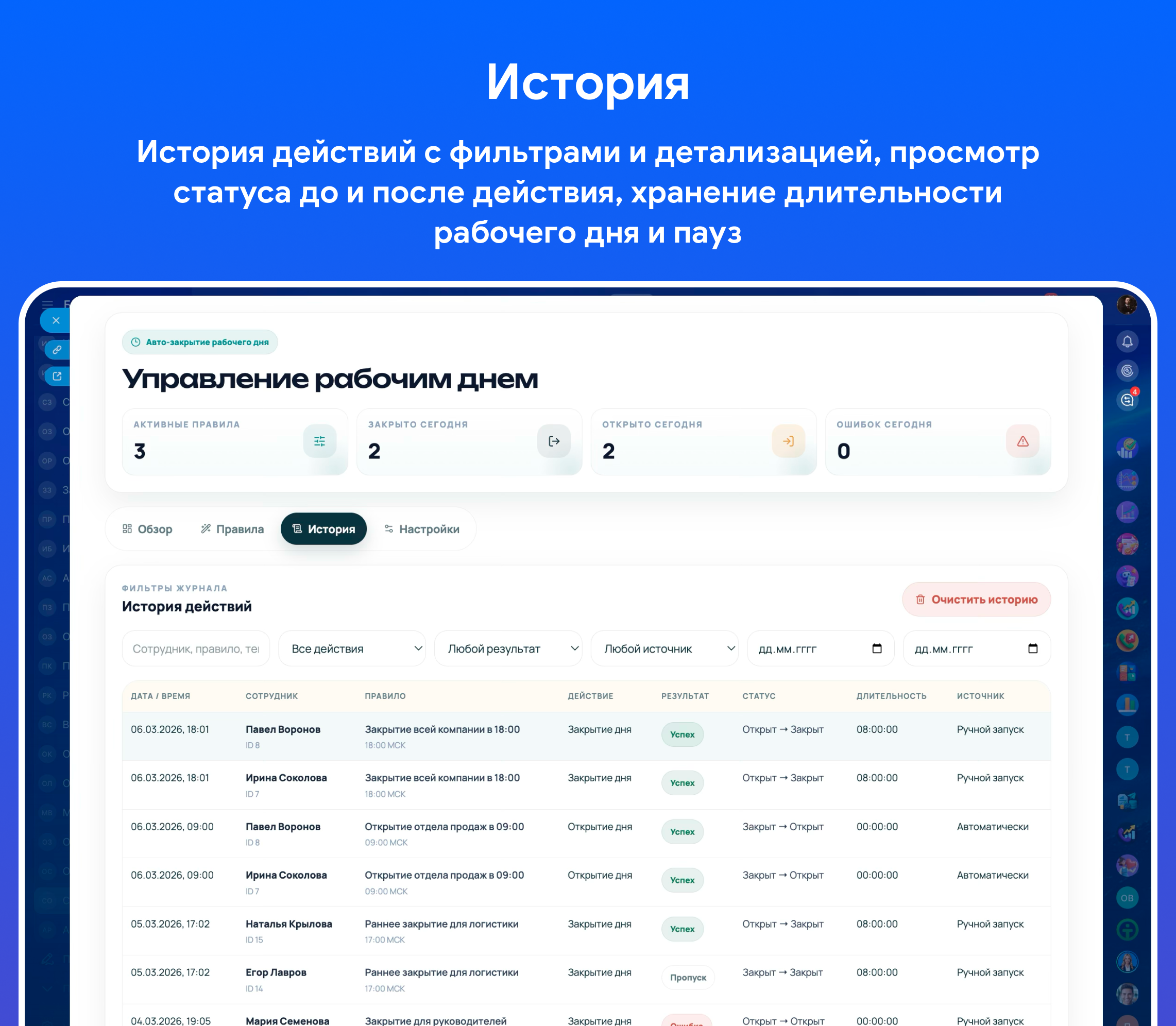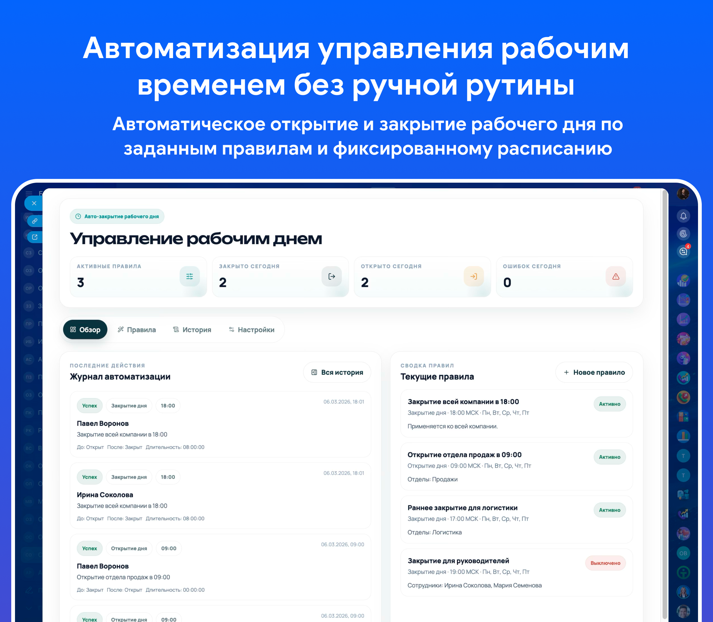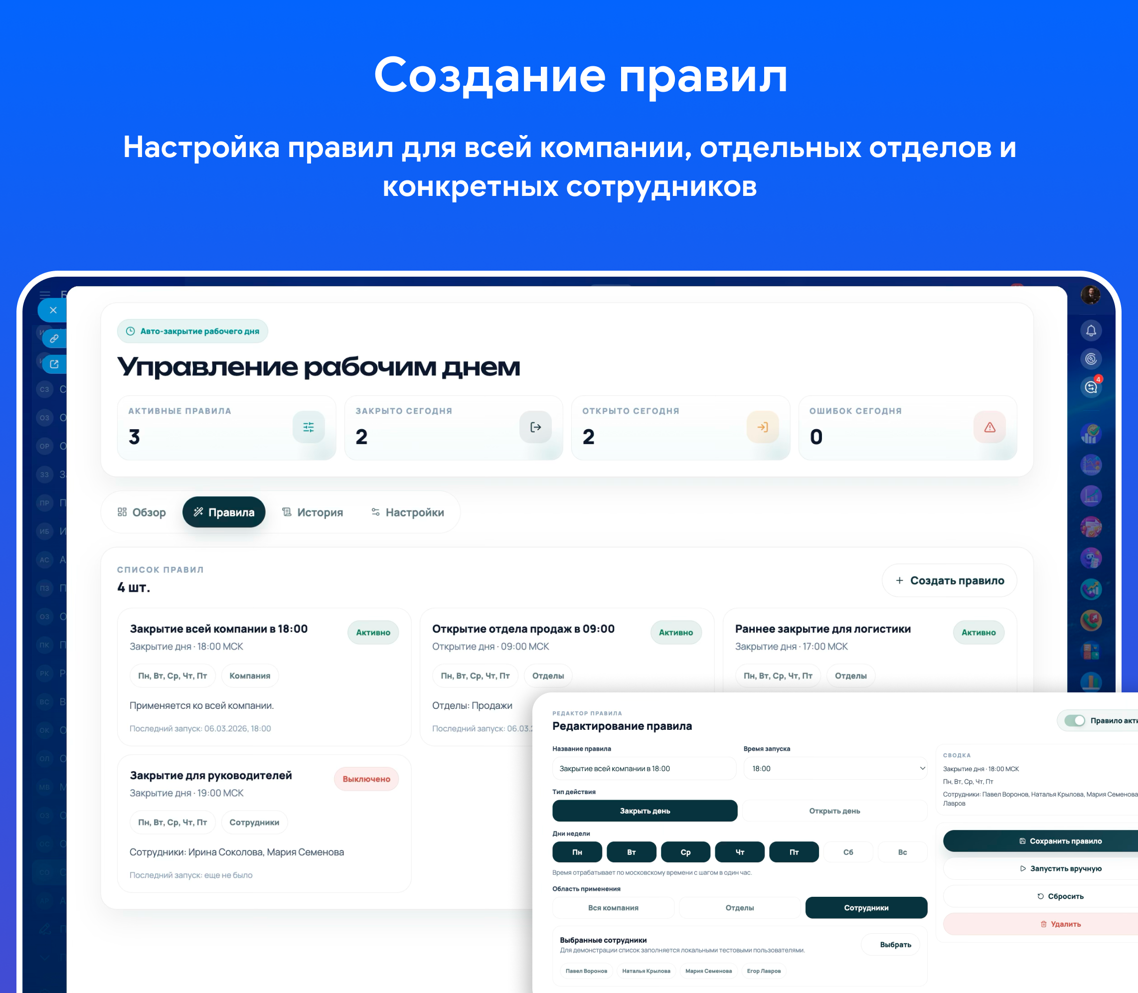 • создание правил на открытие и закрытие рабочего дня