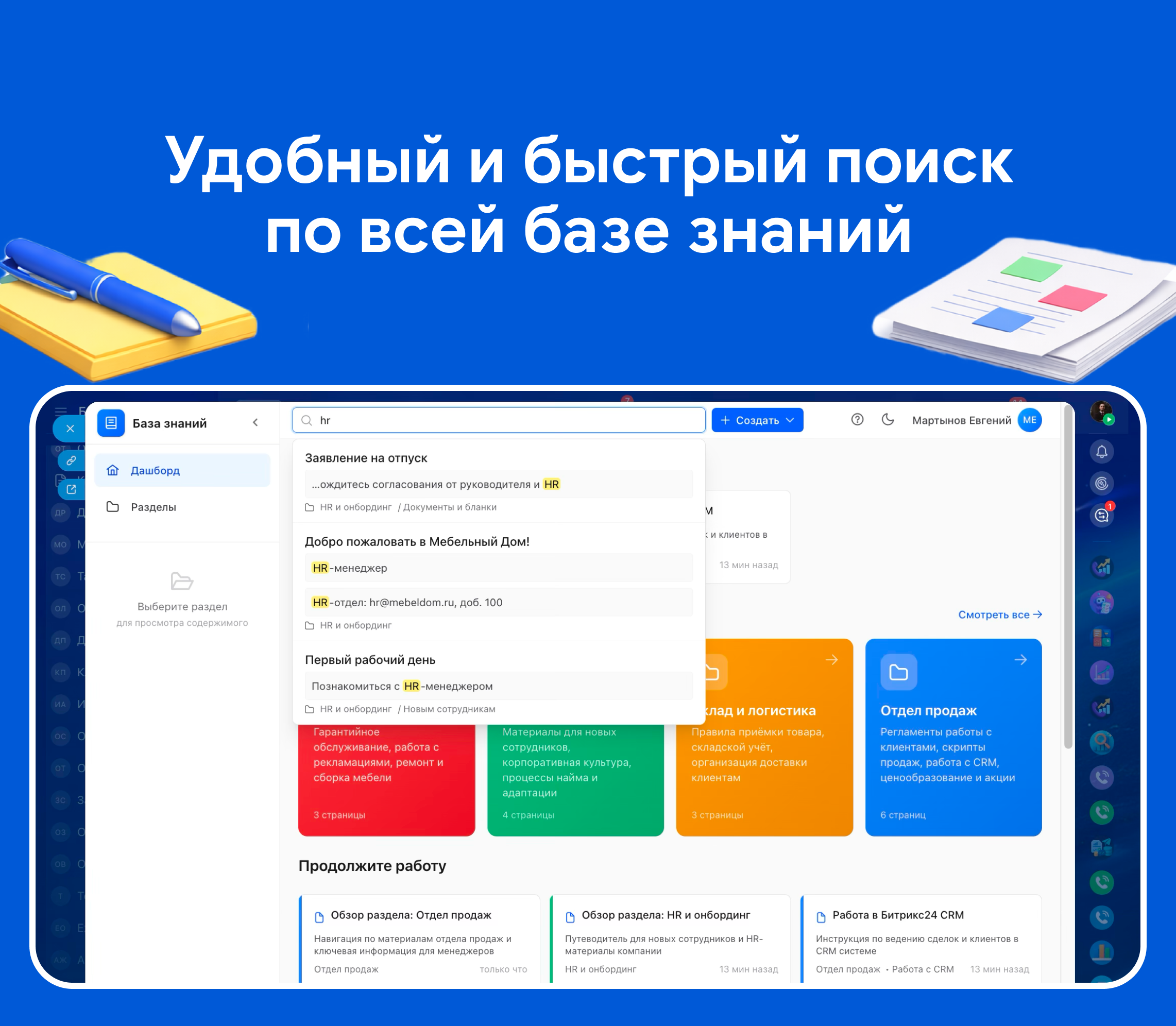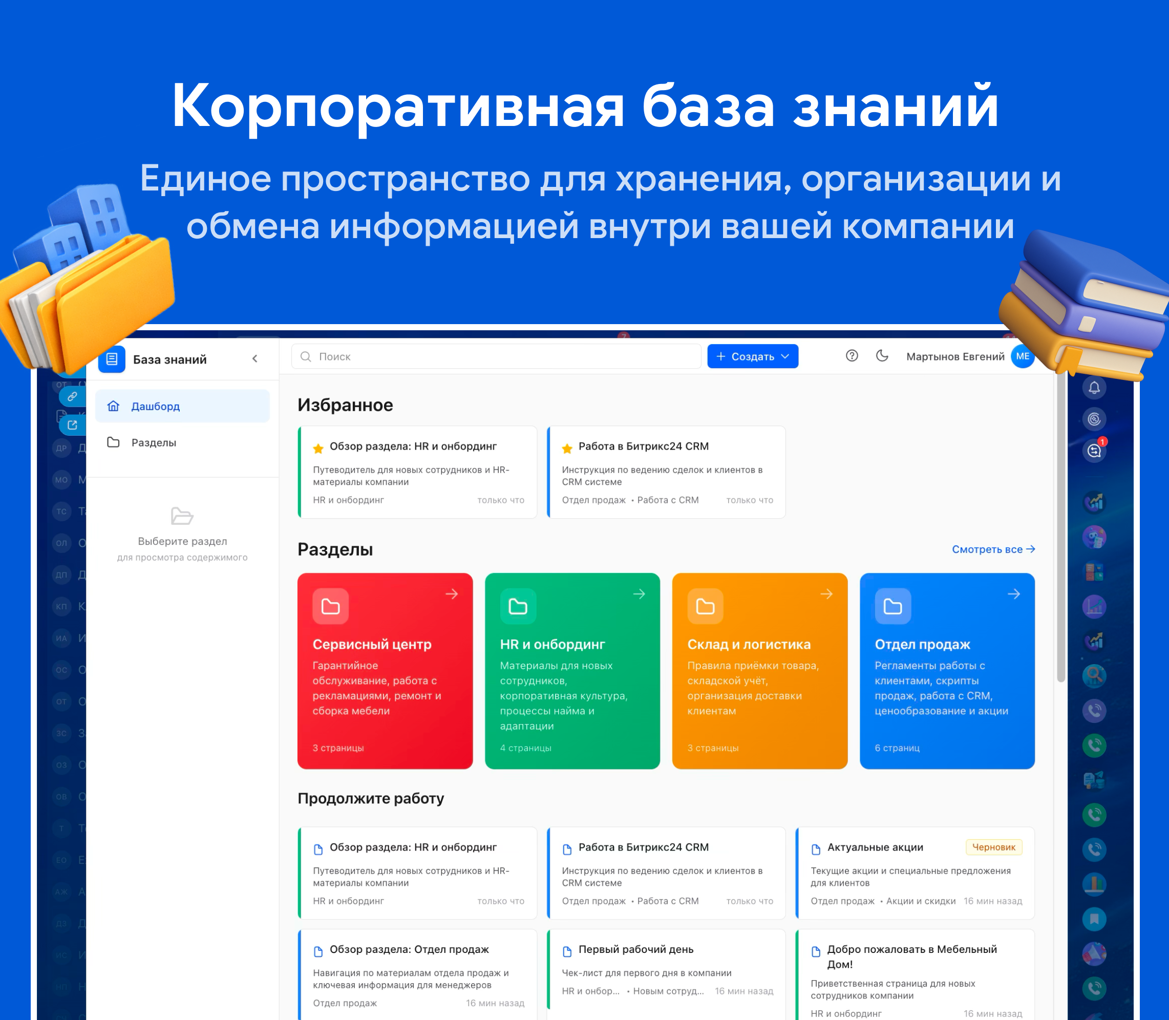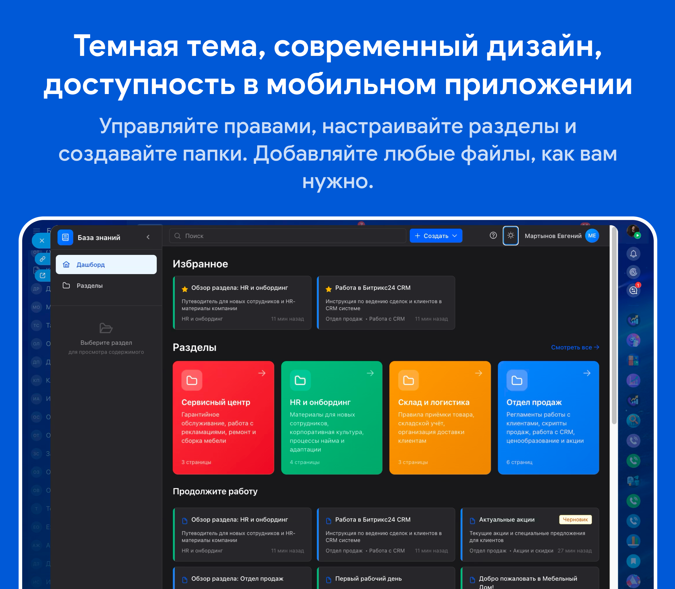• Лента активности — отслеживание изменений и обновлений в базе знаний