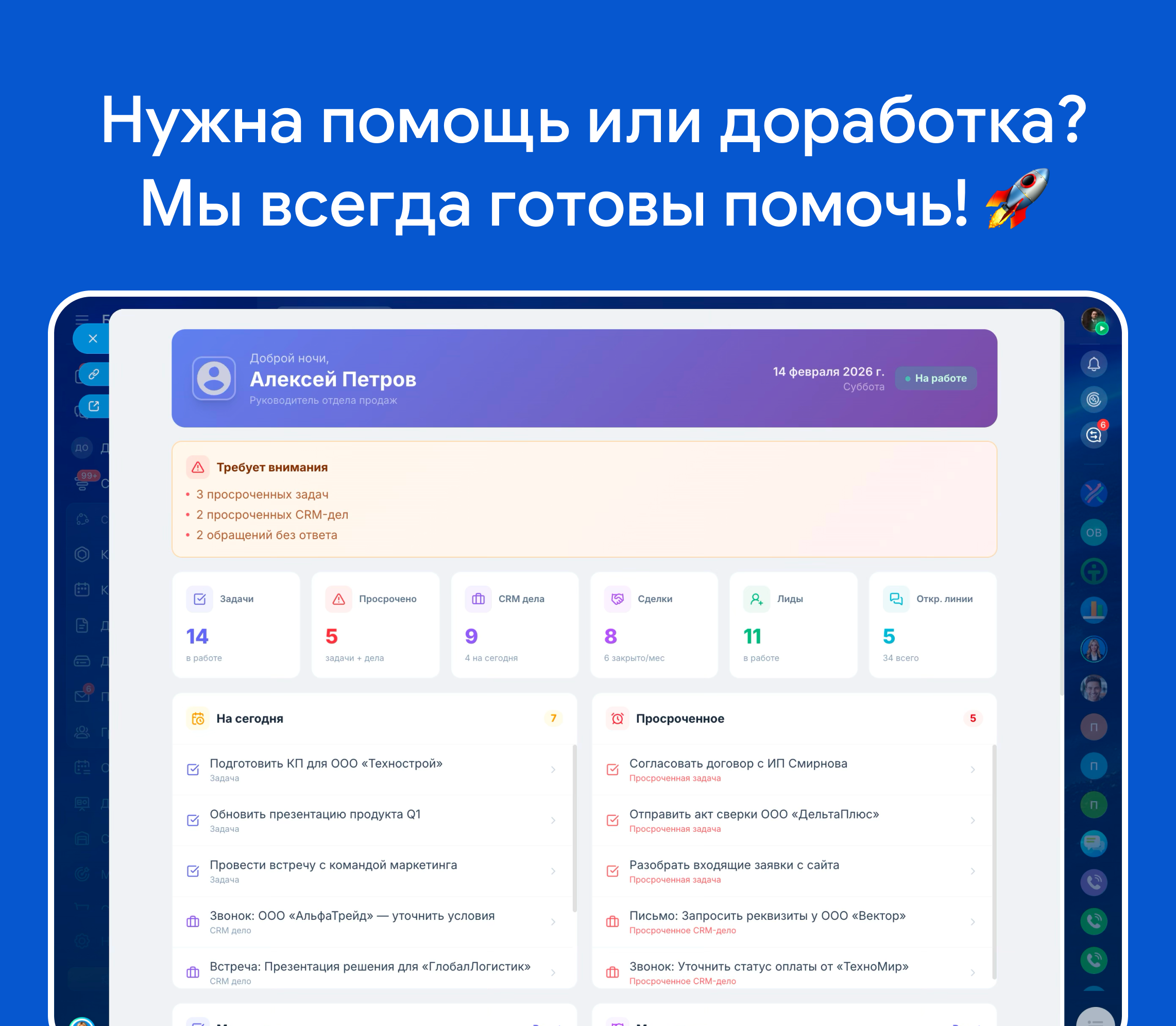 • Алерты - автоматические уведомления о просроченных задачах, CRM-делах, неотвеченных обращениях и незапущенном рабочем дне.