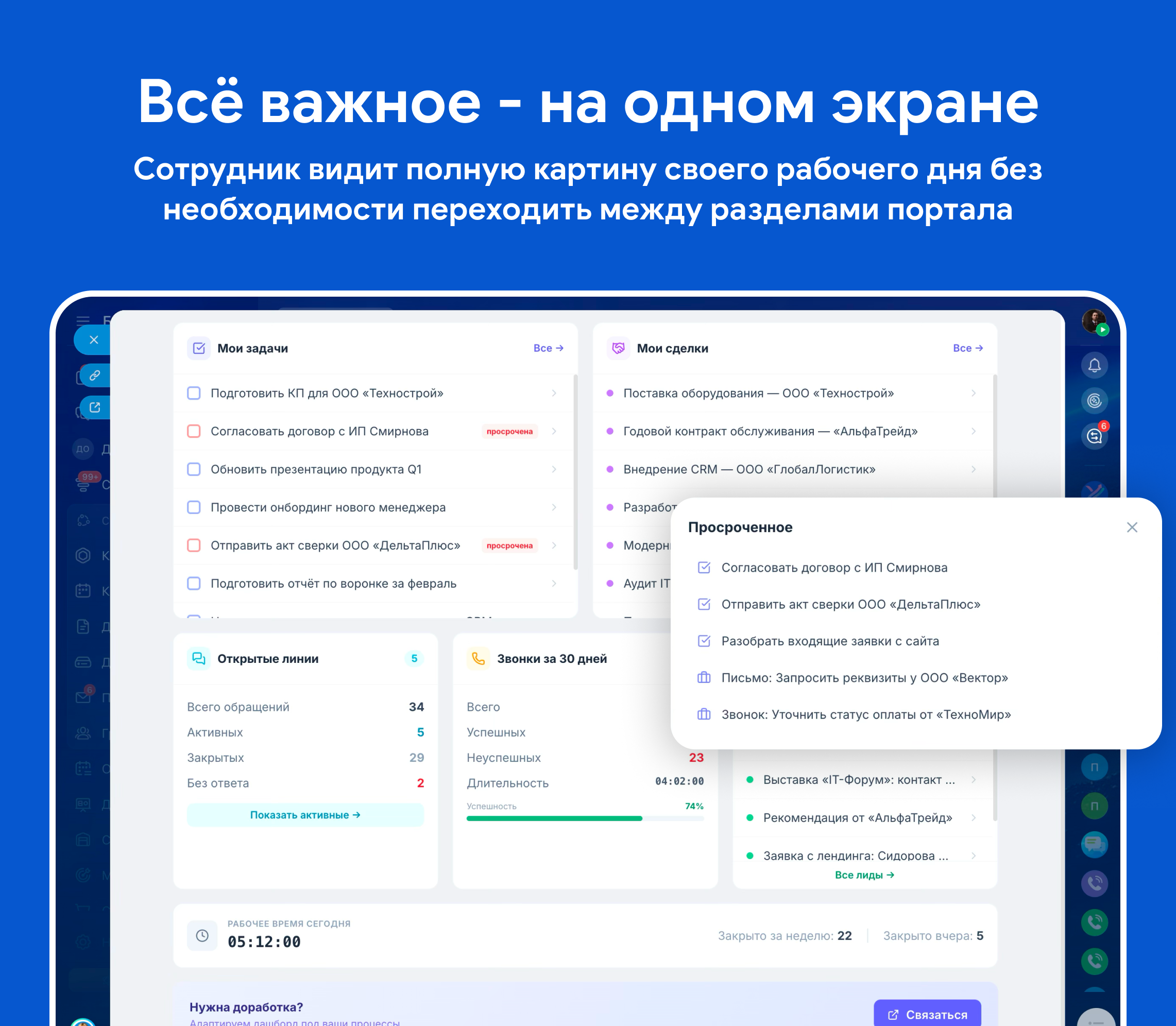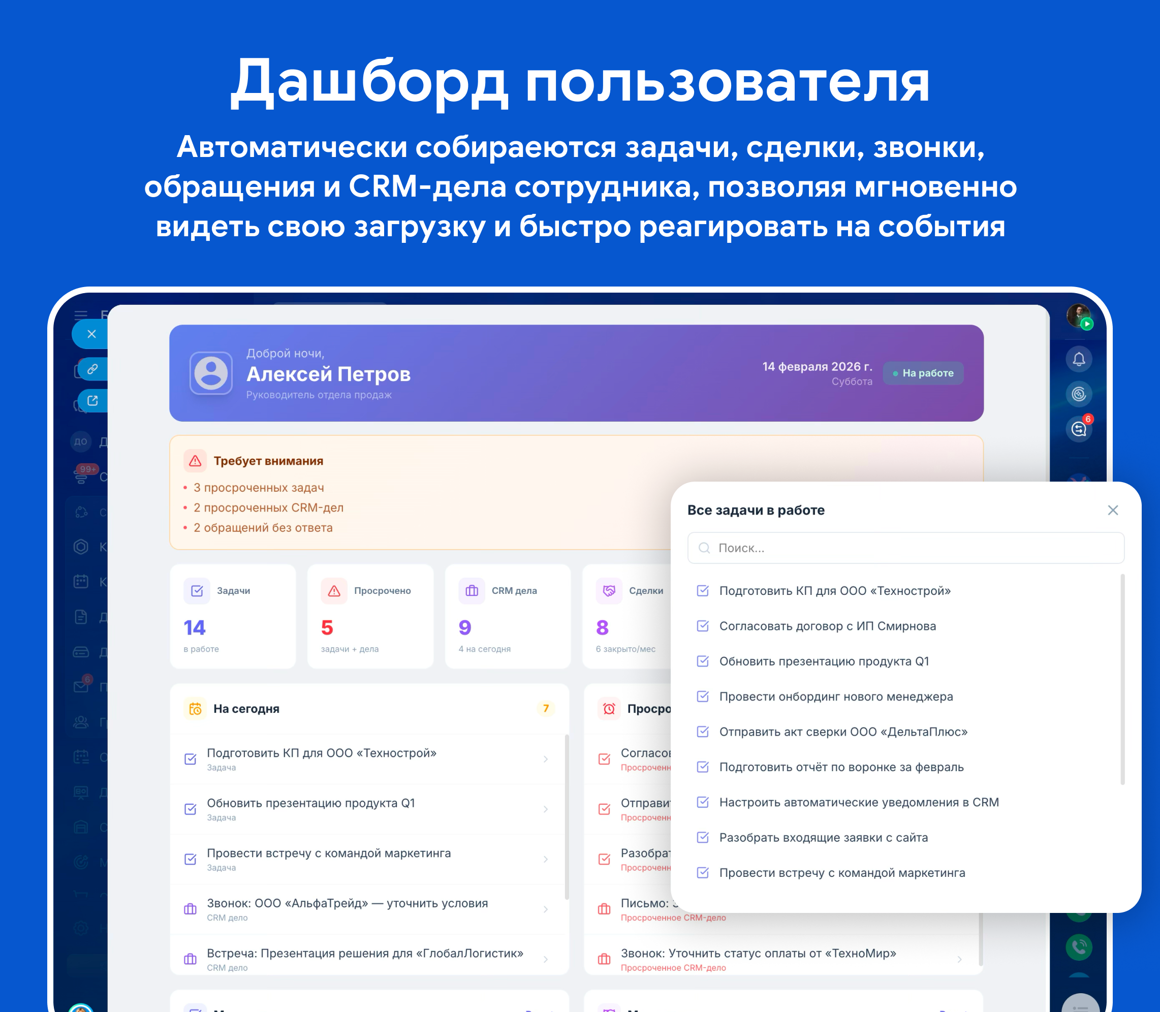 Всё важное - на одном экране. Персональный дашборд автоматически собирает задачи, сделки, звонки, обращения и CRM-дела сотрудника, позволяя мгновенно видеть свою загрузку и быстро реагировать на просрочки и новые события.