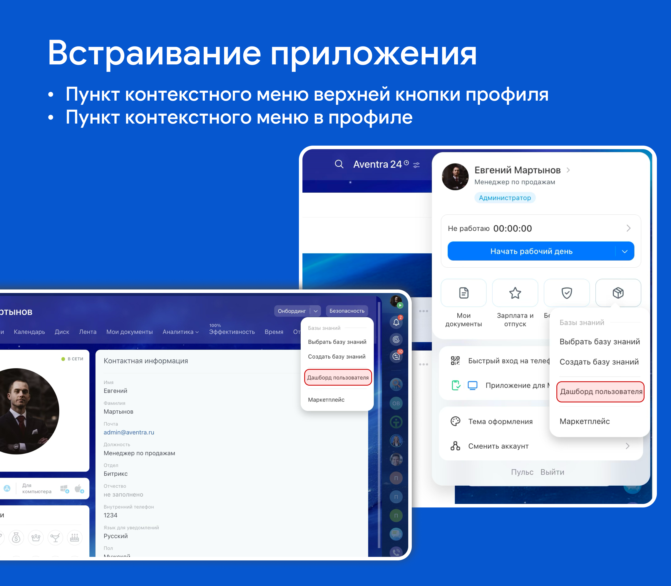 Приложение, которое при открытии автоматически формирует индивидуальную сводку по текущему пользователю. Сотрудник видит полную картину своего рабочего дня без необходимости переходить между разделами портала.