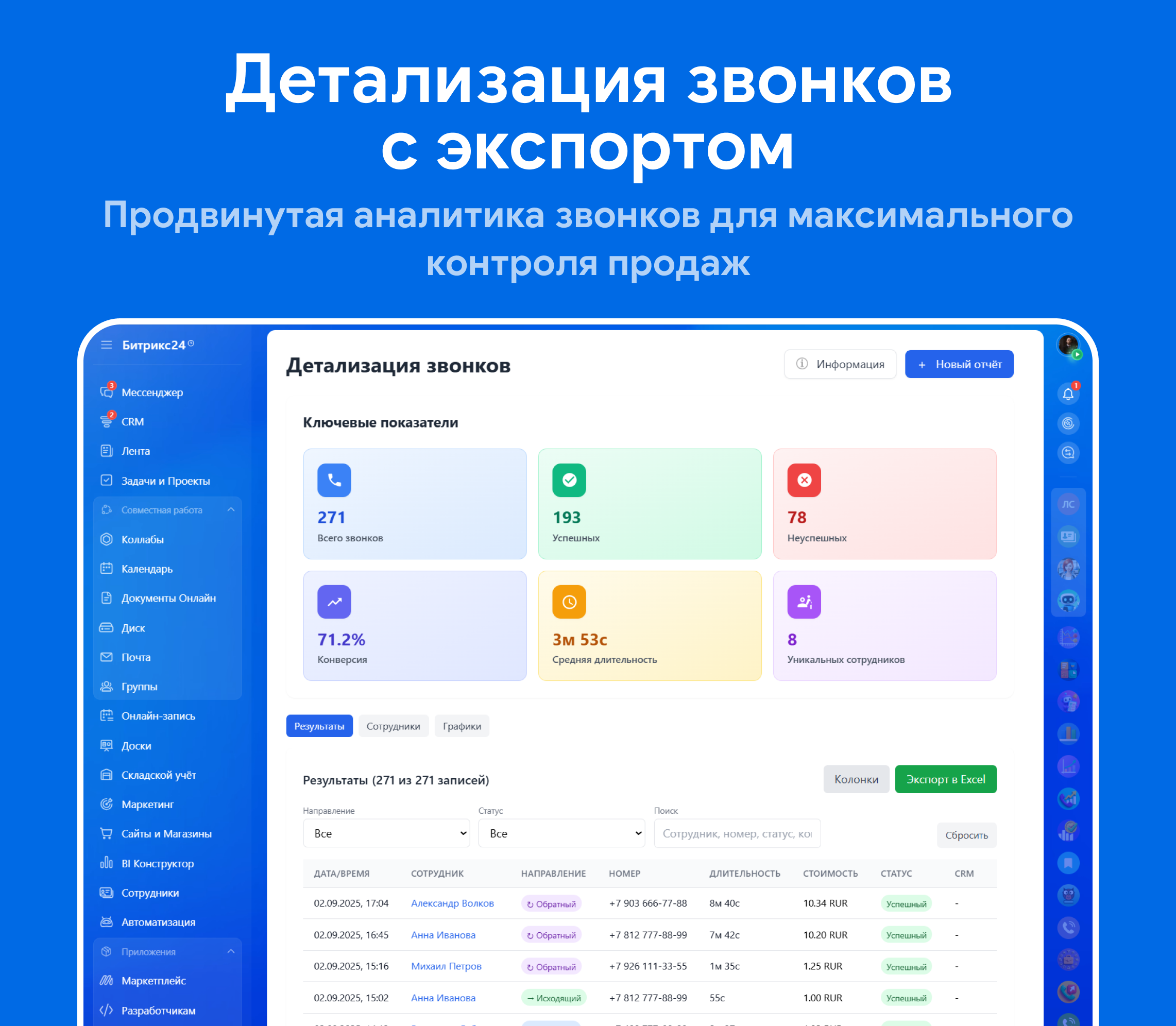 Продвинутая аналитика звонков для максимального контроля продаж. Превратите каждый звонок в детальный отчет с графиками, метриками и экспортом в Excel.
