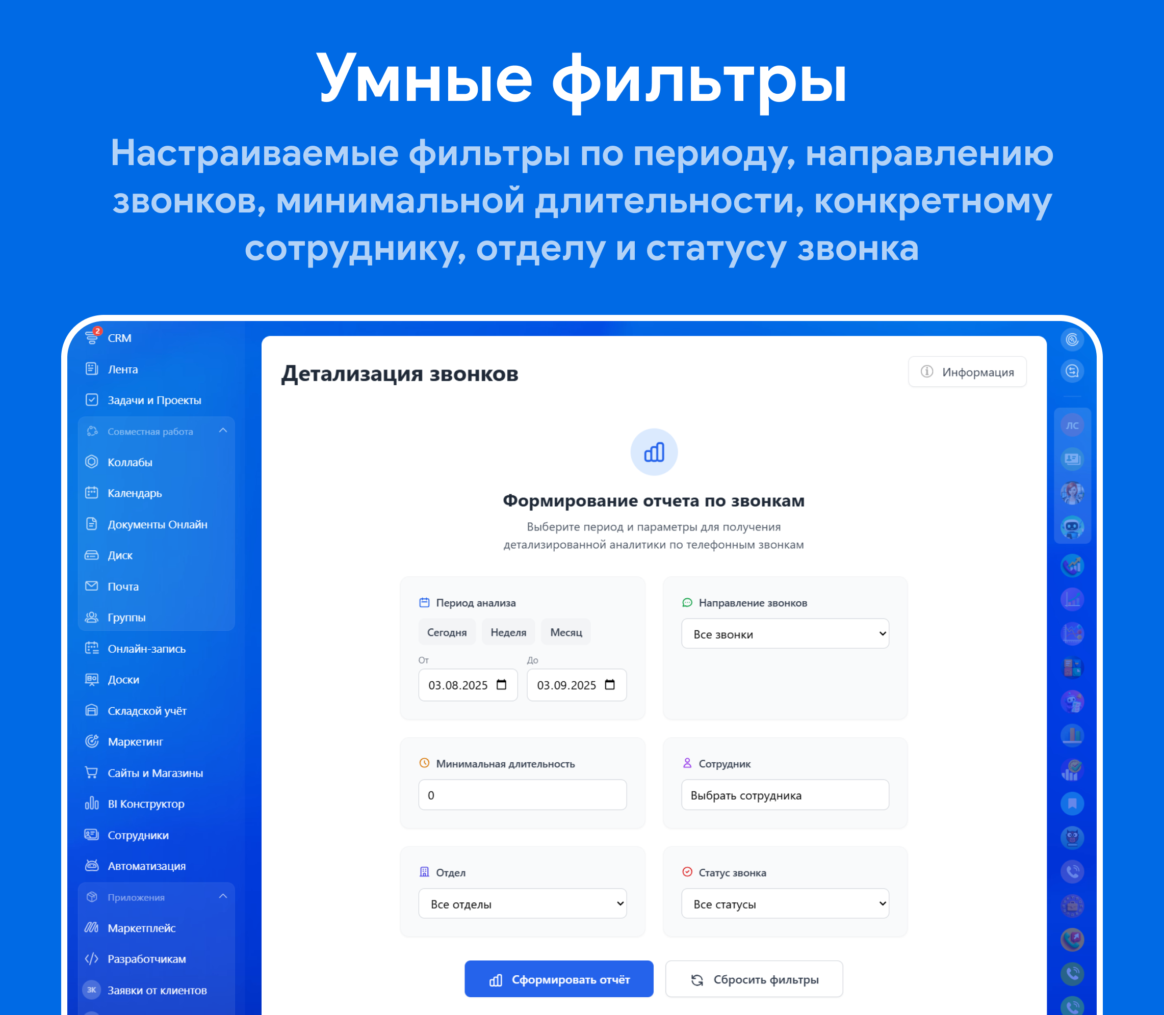 • Формировать детализированные отчеты по любому периоду с фильтрацией по сотрудникам, отделам, статусам и длительности звонков
