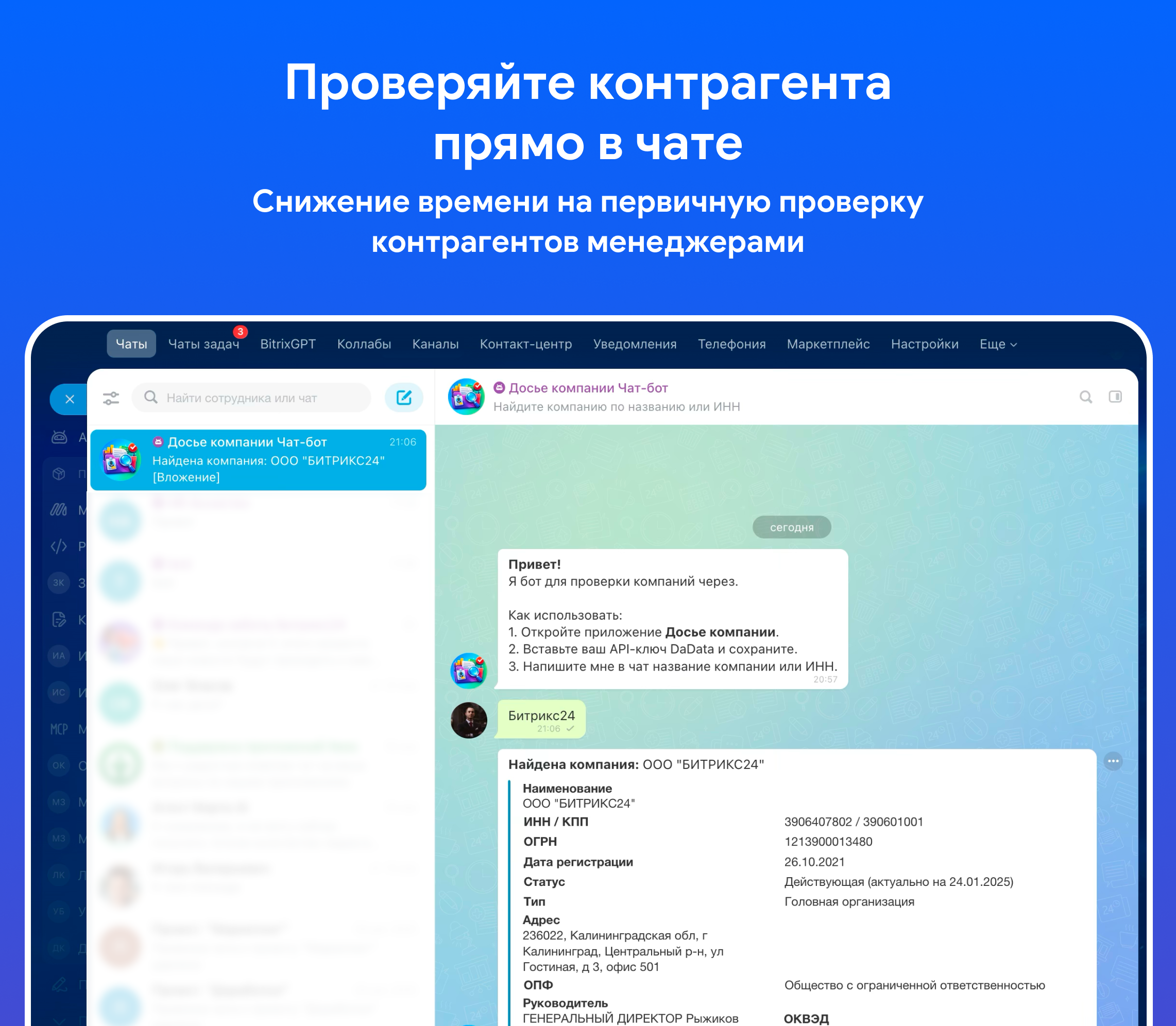 • Чат-бот в мессенджере для быстрого поиска компании по ИНН/названию.