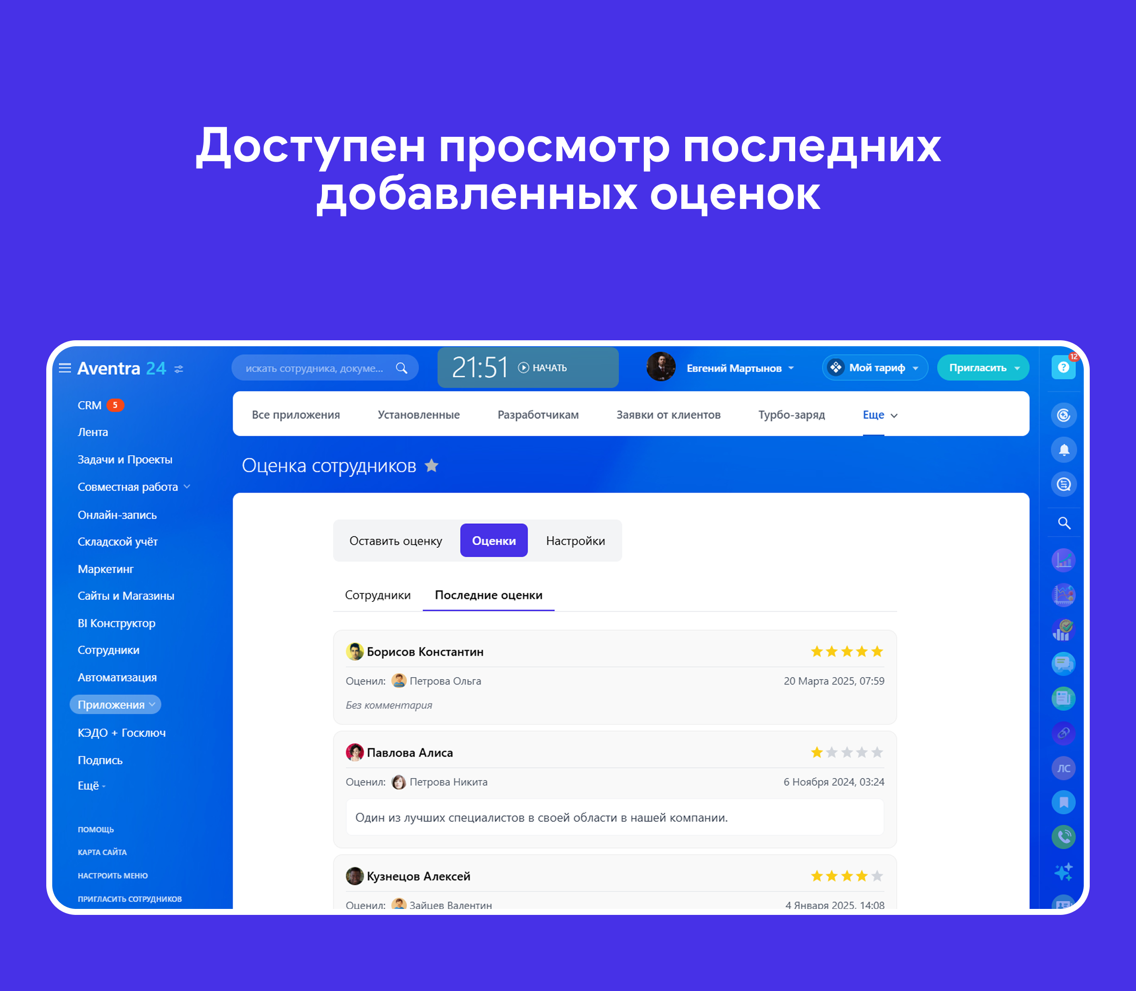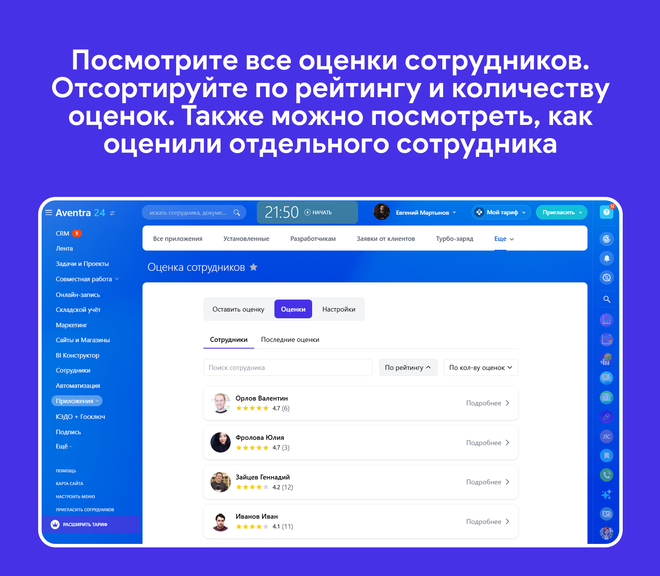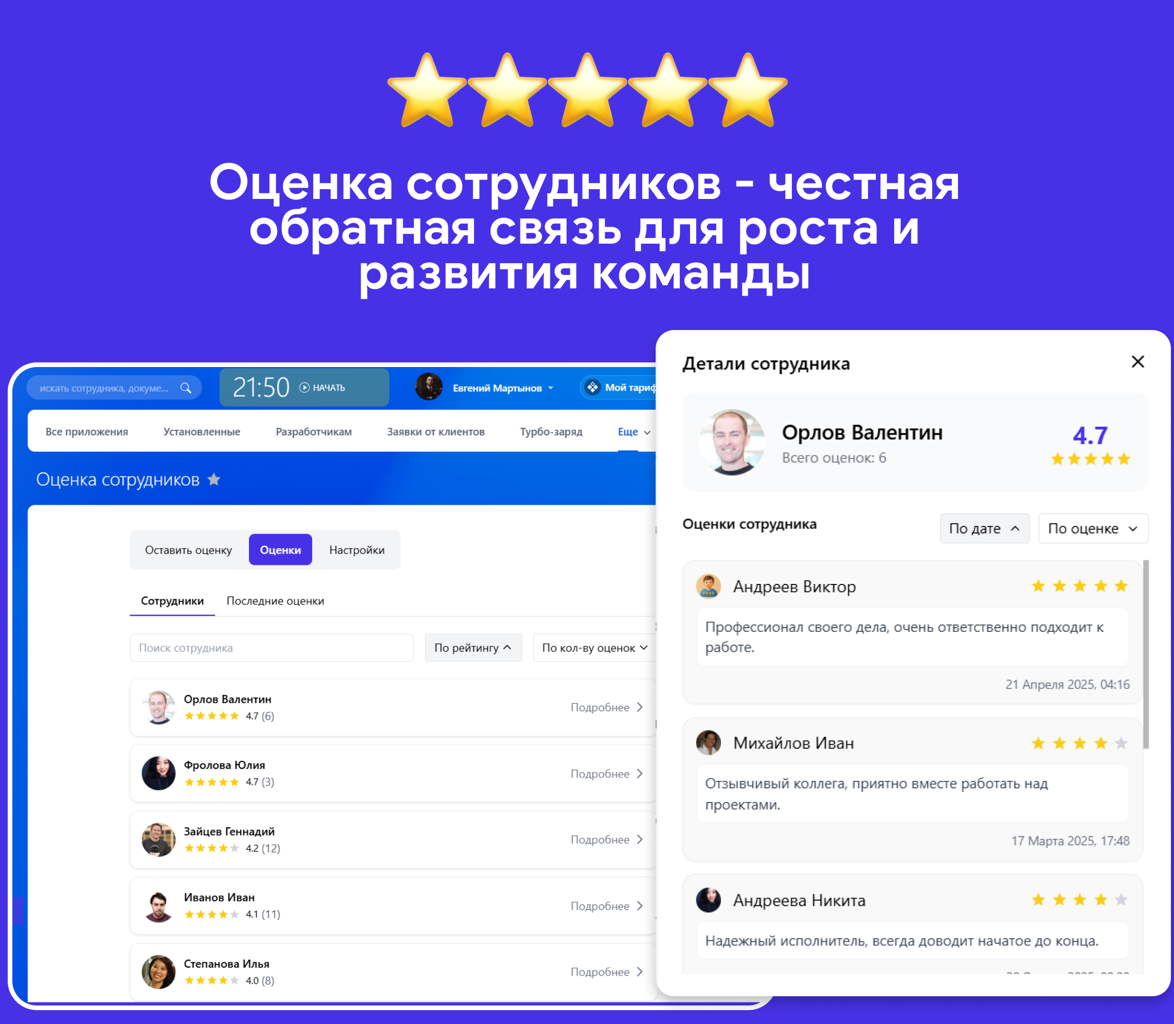 Руководитель может зайти в приложение и увидеть оценки сотрудников в разрезе сотрудника и его среднюю оценку