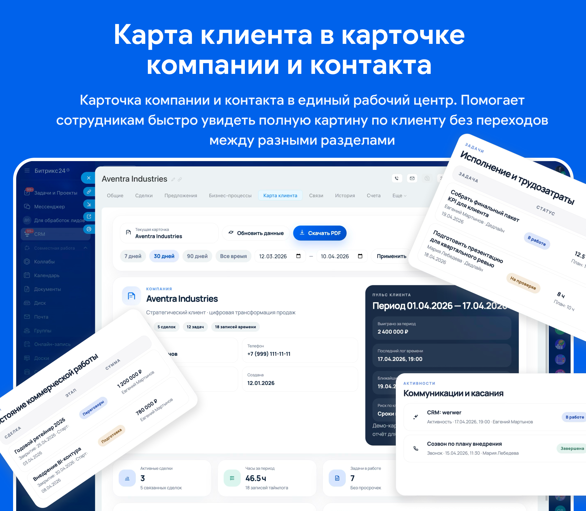 помогает менеджерам, аккаунт-командам, руководителям и проектным специалистам быстро увидеть полную картину по клиенту без переходов между разными разделами. Решение собирает в одном экране основные CRM-связи, связанные сделки, задачи, активность команды, учёт времени по задачам и клиентский отчёт по выполненным работам.