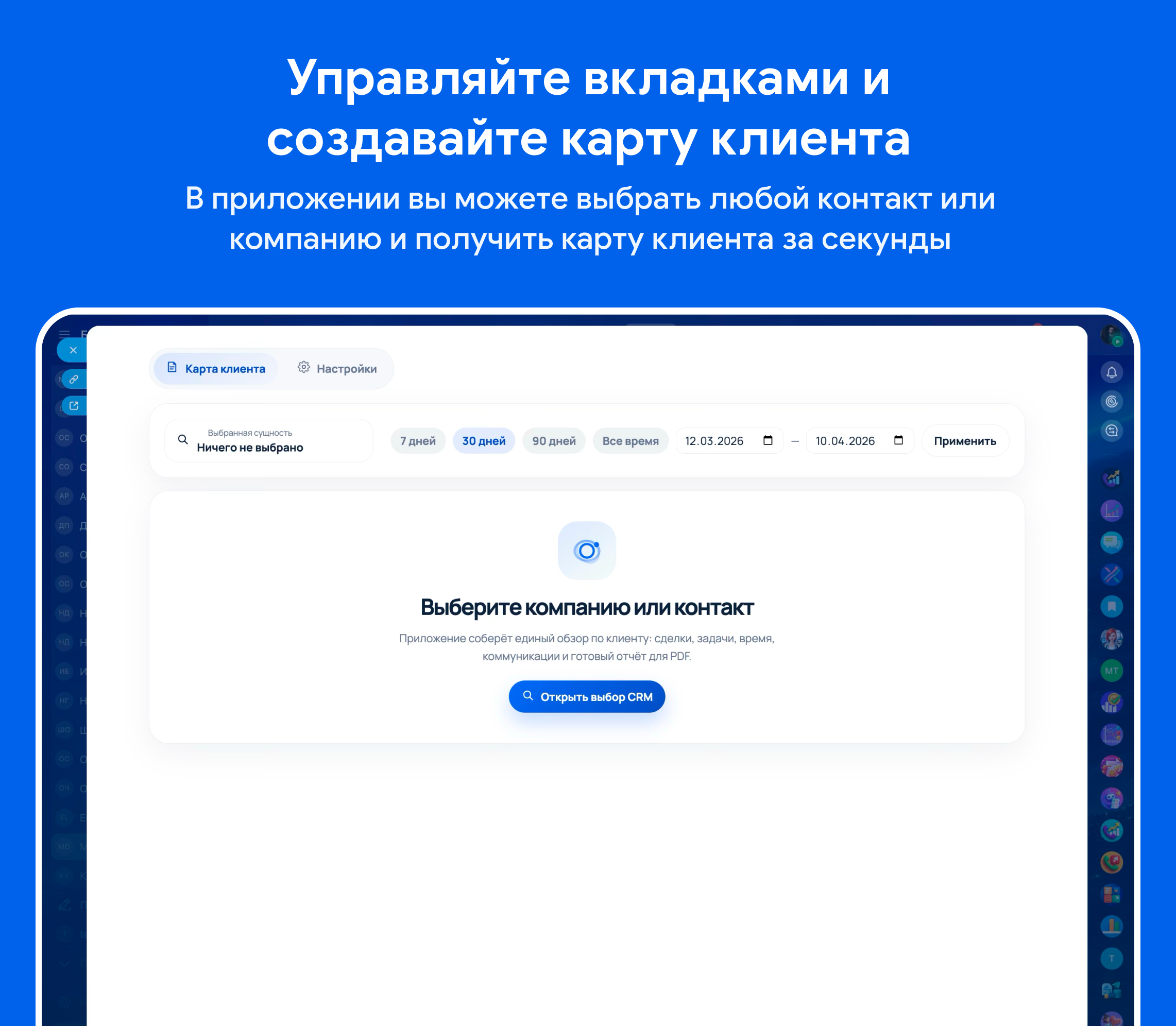 Приложение автоматически встраивается в карточку сделки и компании