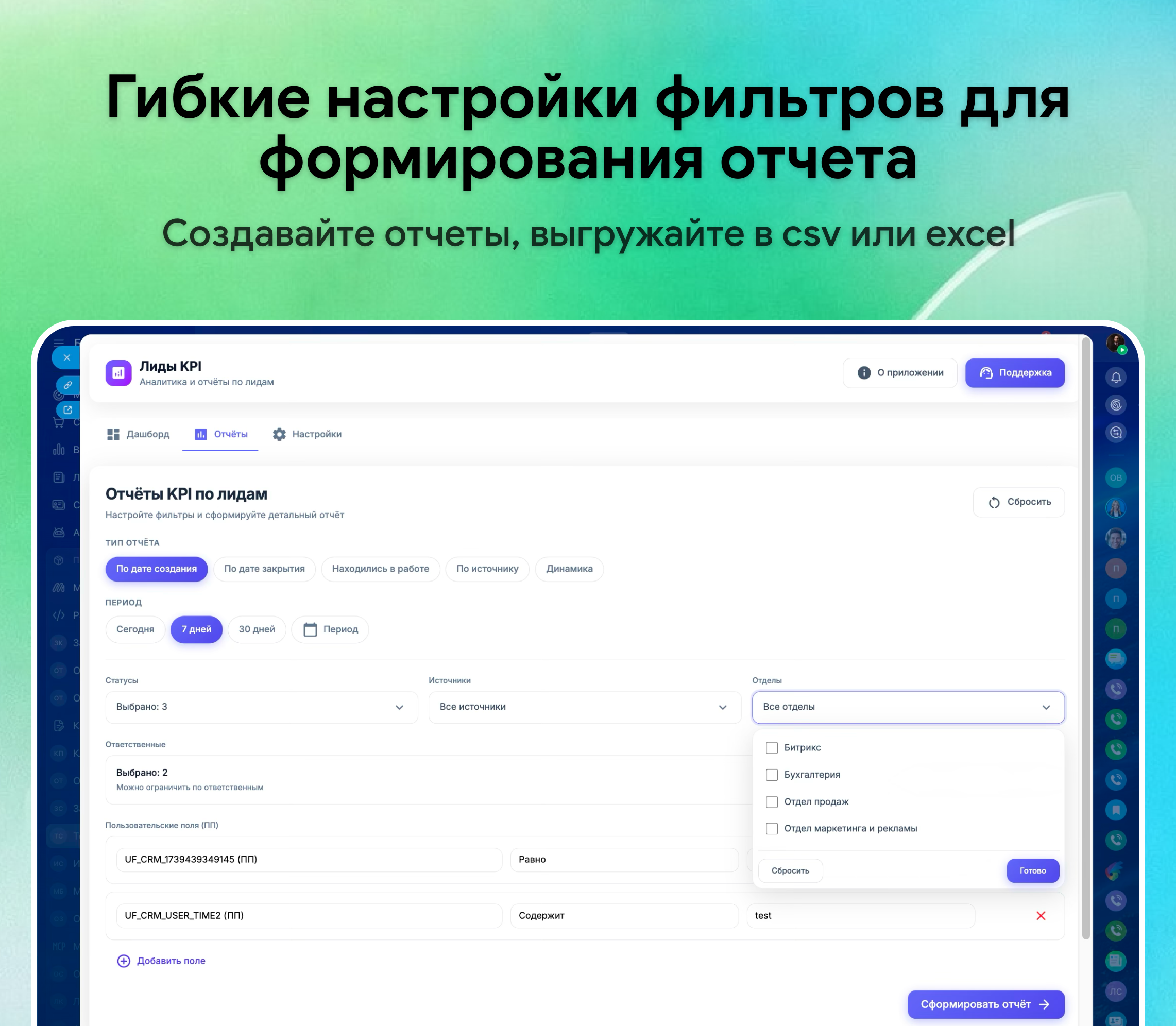 - Пользовательские поля (мультиусловия: равно/не равно/содержит/диапазон и т.д.).