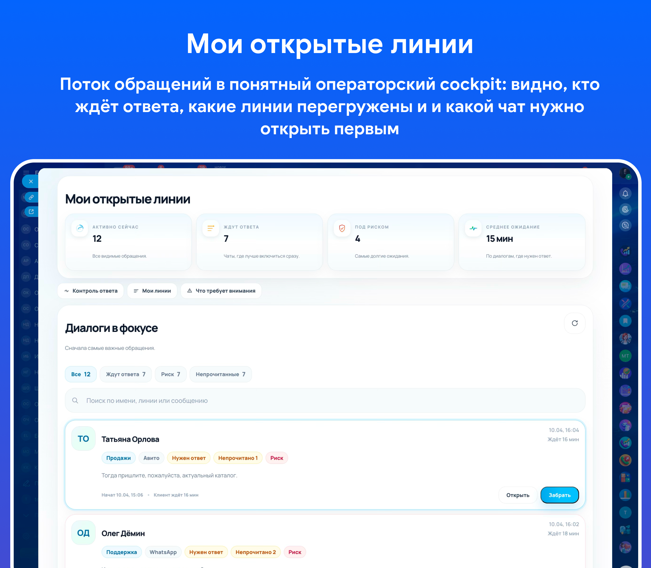 Персональное рабочее пространство оператора поддержки и продаж, которое собирает в одном интерфейсе активные диалоги, риски по ожиданию ответа, нагрузку по линиям и быстрый доступ к переписке. Решение устанавливается в профиль пользователя и помогает сотруднику сразу понять, где есть непрочитанные сообщения, какие обращения висят дольше нормы и в какой линии растёт перегрузка.