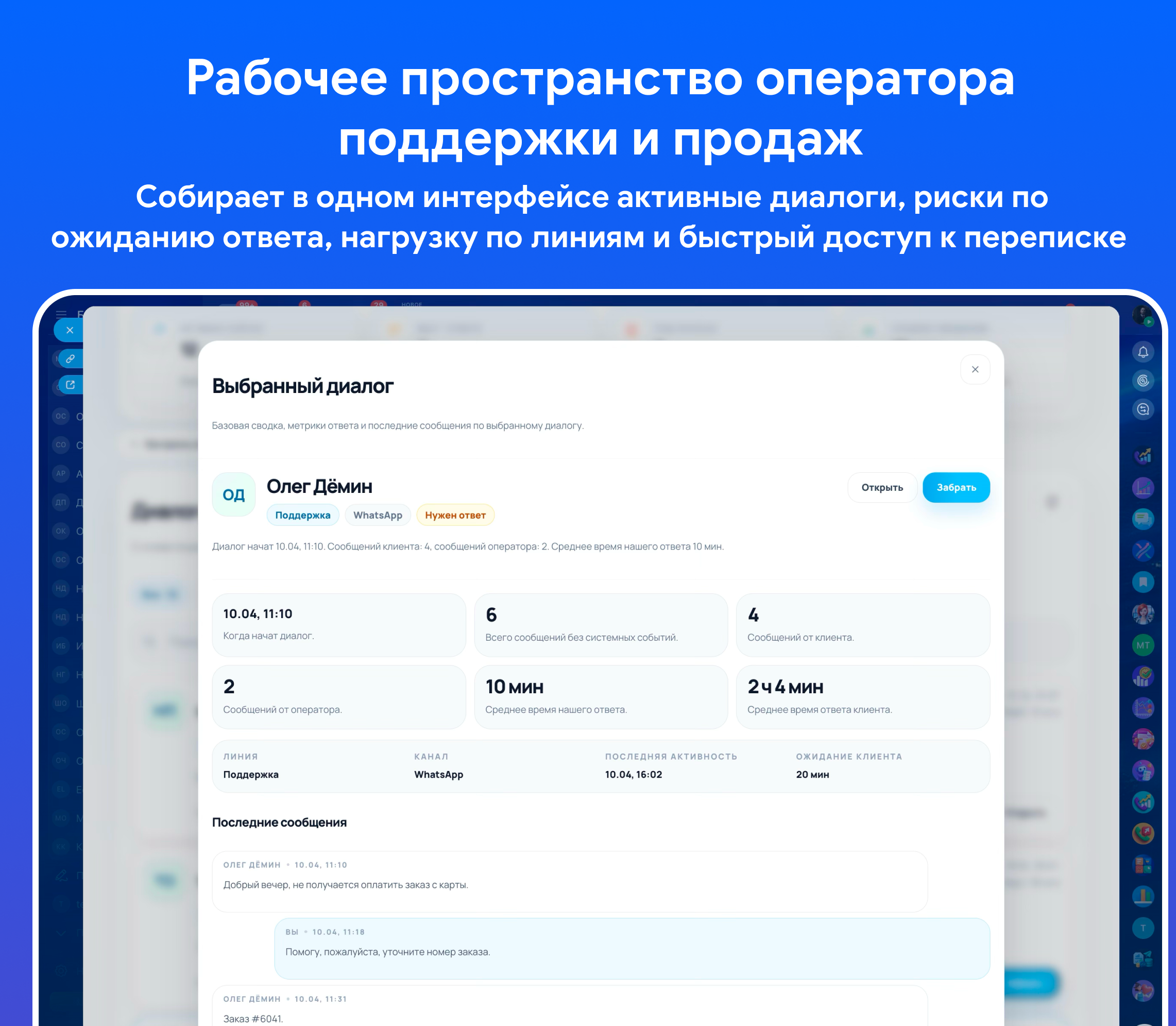 • позволяет быстро открыть нужный диалог в мессенджере и, при наличии прав, забрать чат на себя;