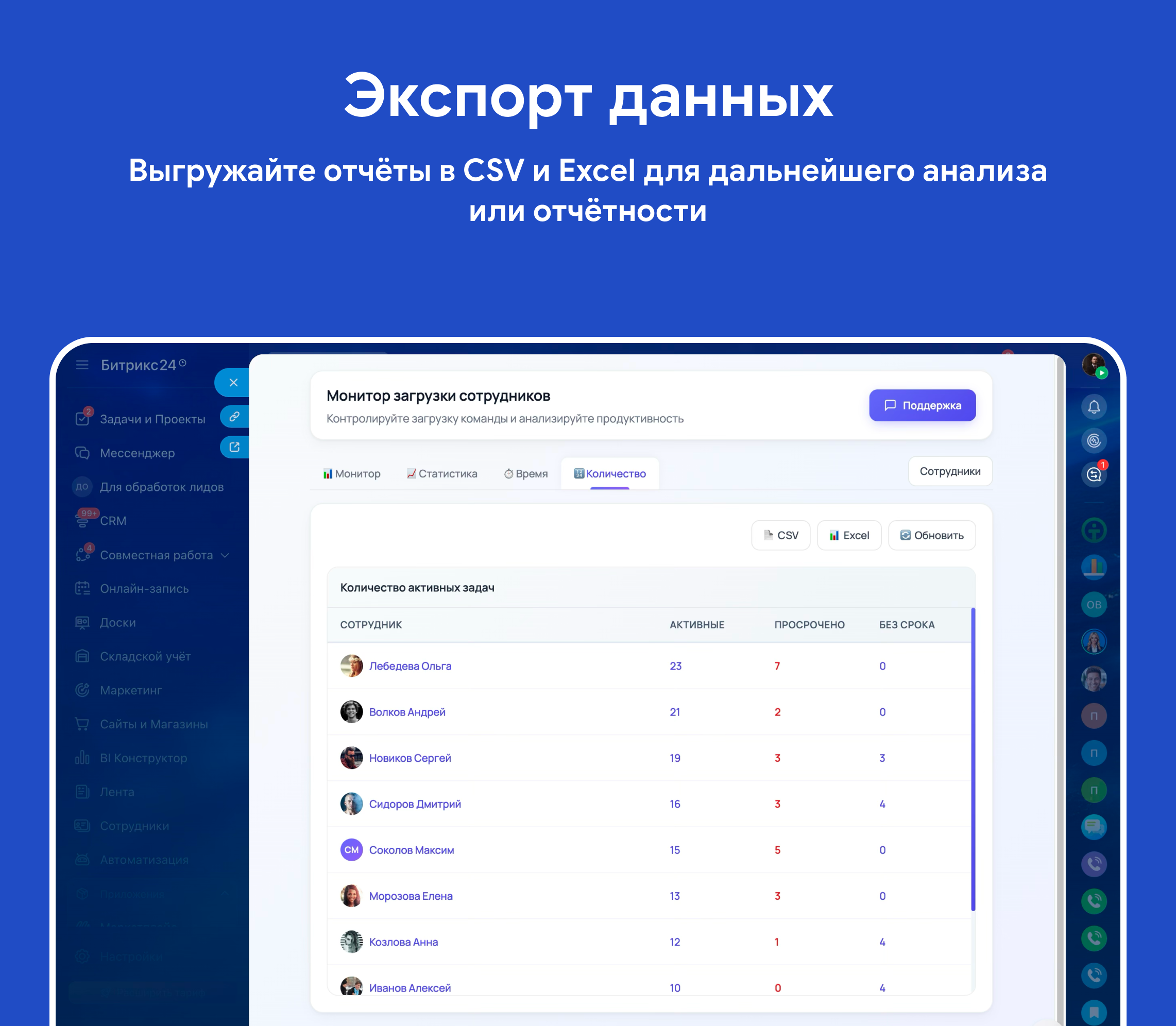 • Экспорт любого отчёта в CSV и Excel