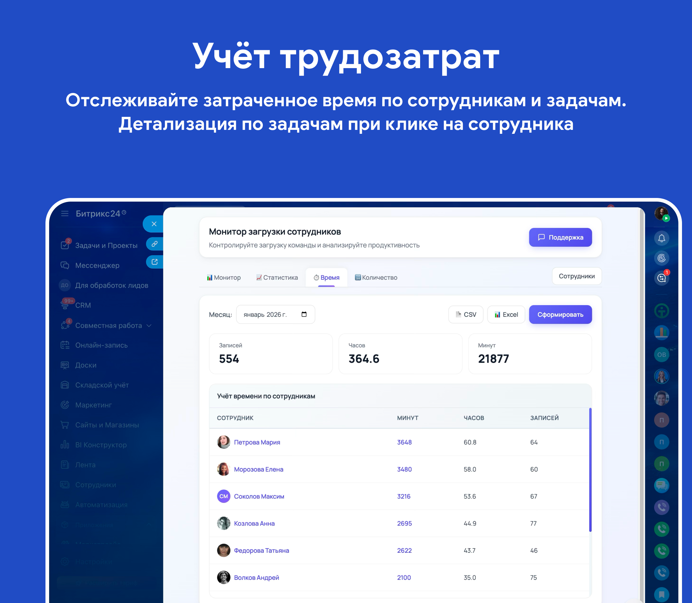 • Учёт трудозатрат — отслеживайте затраченное время по сотрудникам и задачам