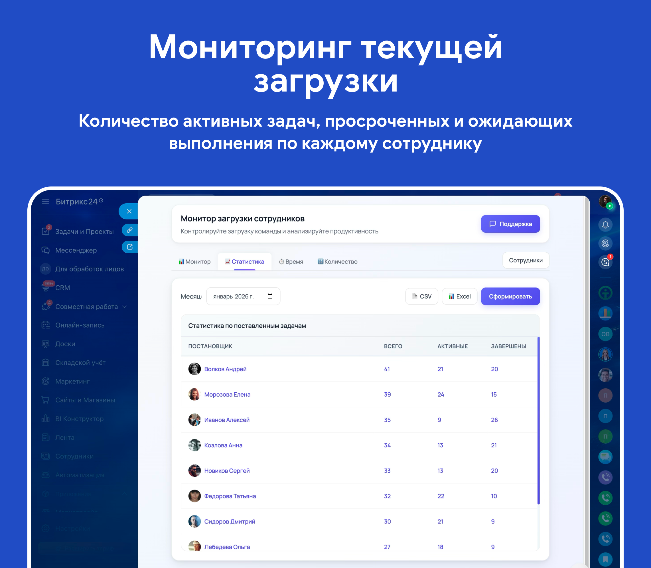 • Мониторинг текущей загрузки — видите количество активных задач, просроченных и ожидающих выполнения по каждому сотруднику