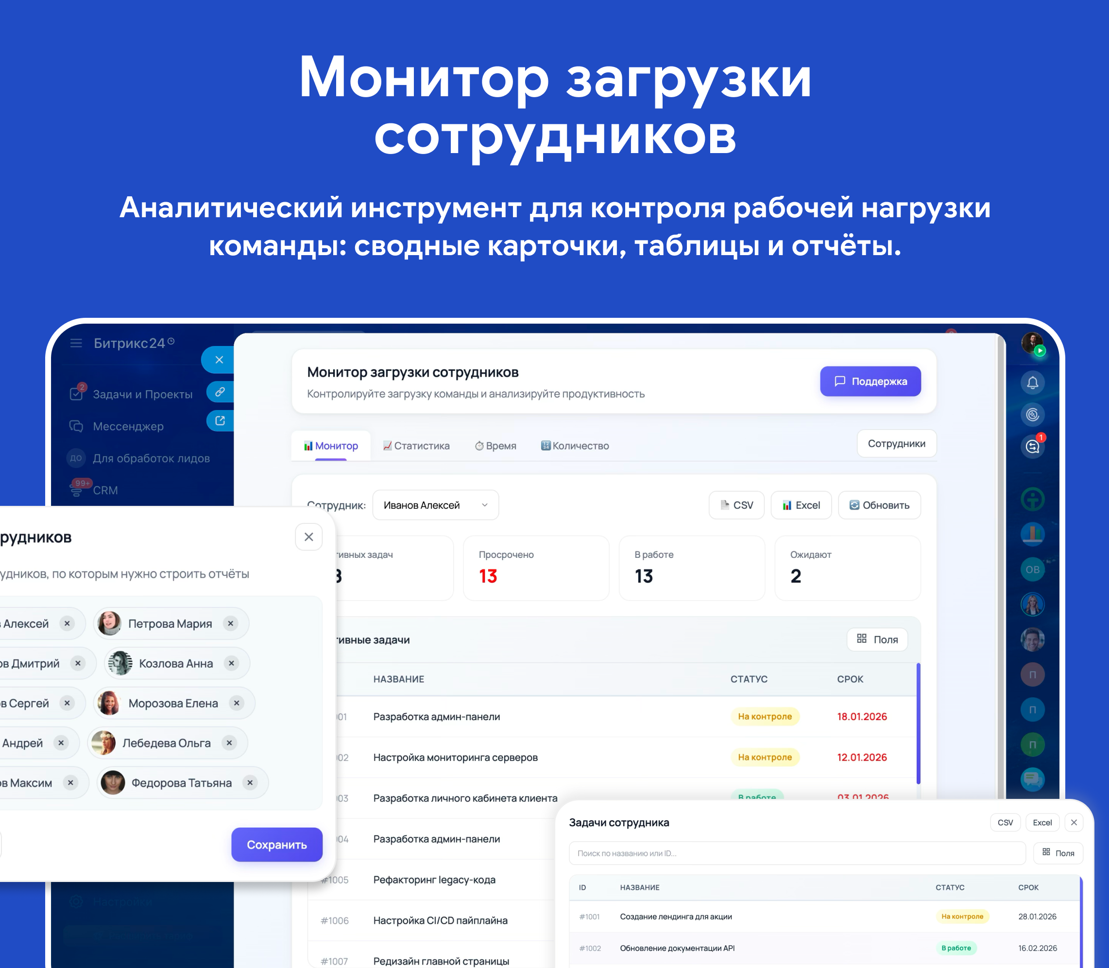 Аналитический инструмент для контроля рабочей нагрузки команды. Приложение собирает данные по задачам выбранных сотрудников и представляет их в удобном виде: сводные карточки, таблицы и отчёты с возможностью экспорта.