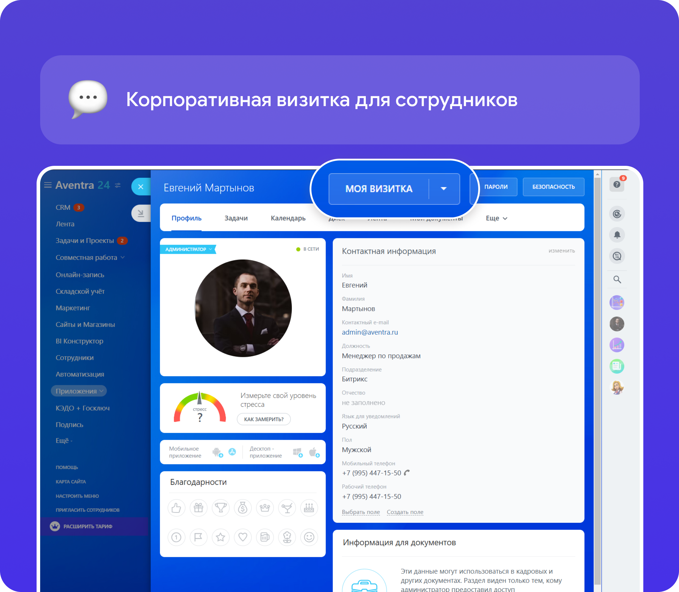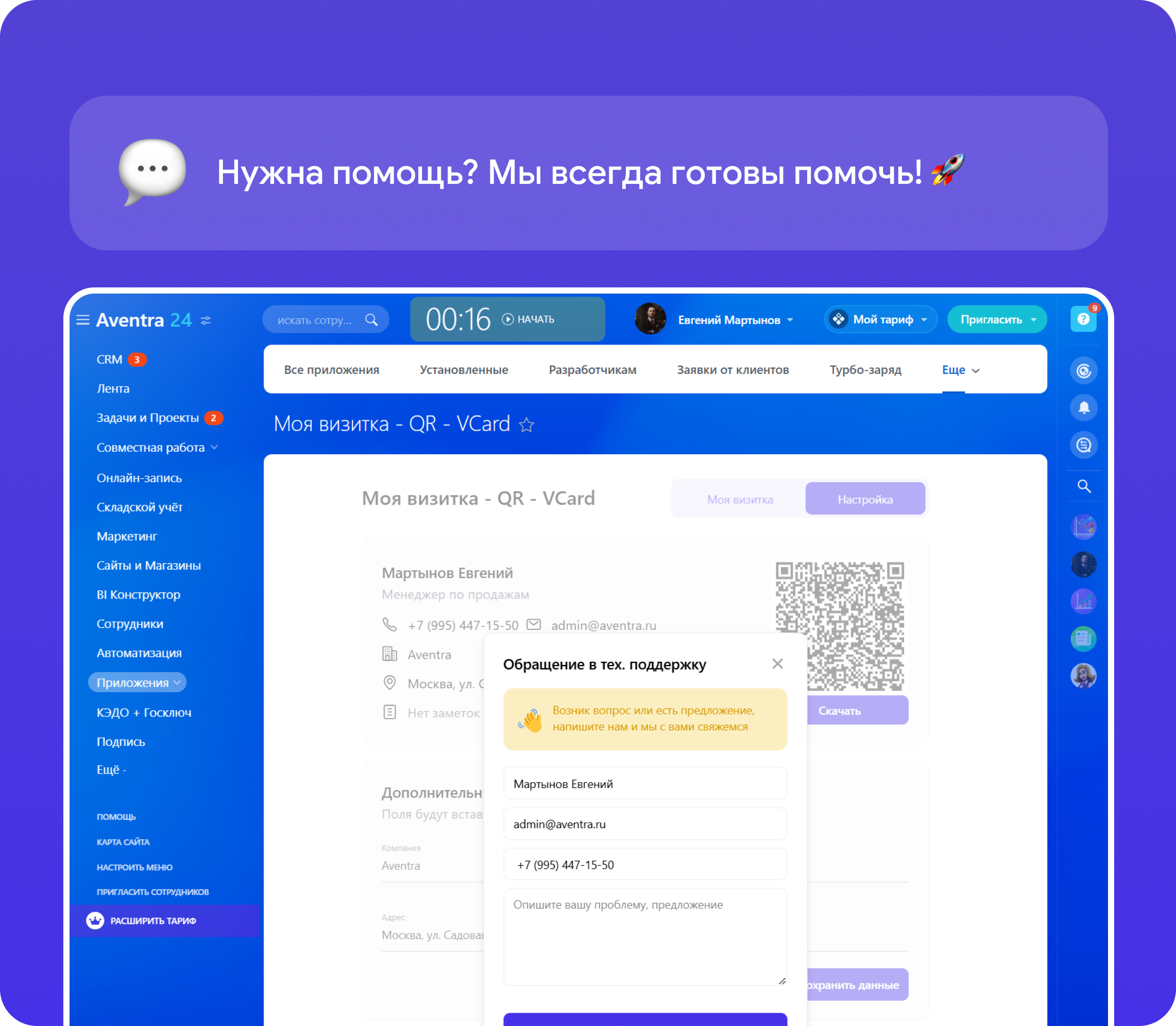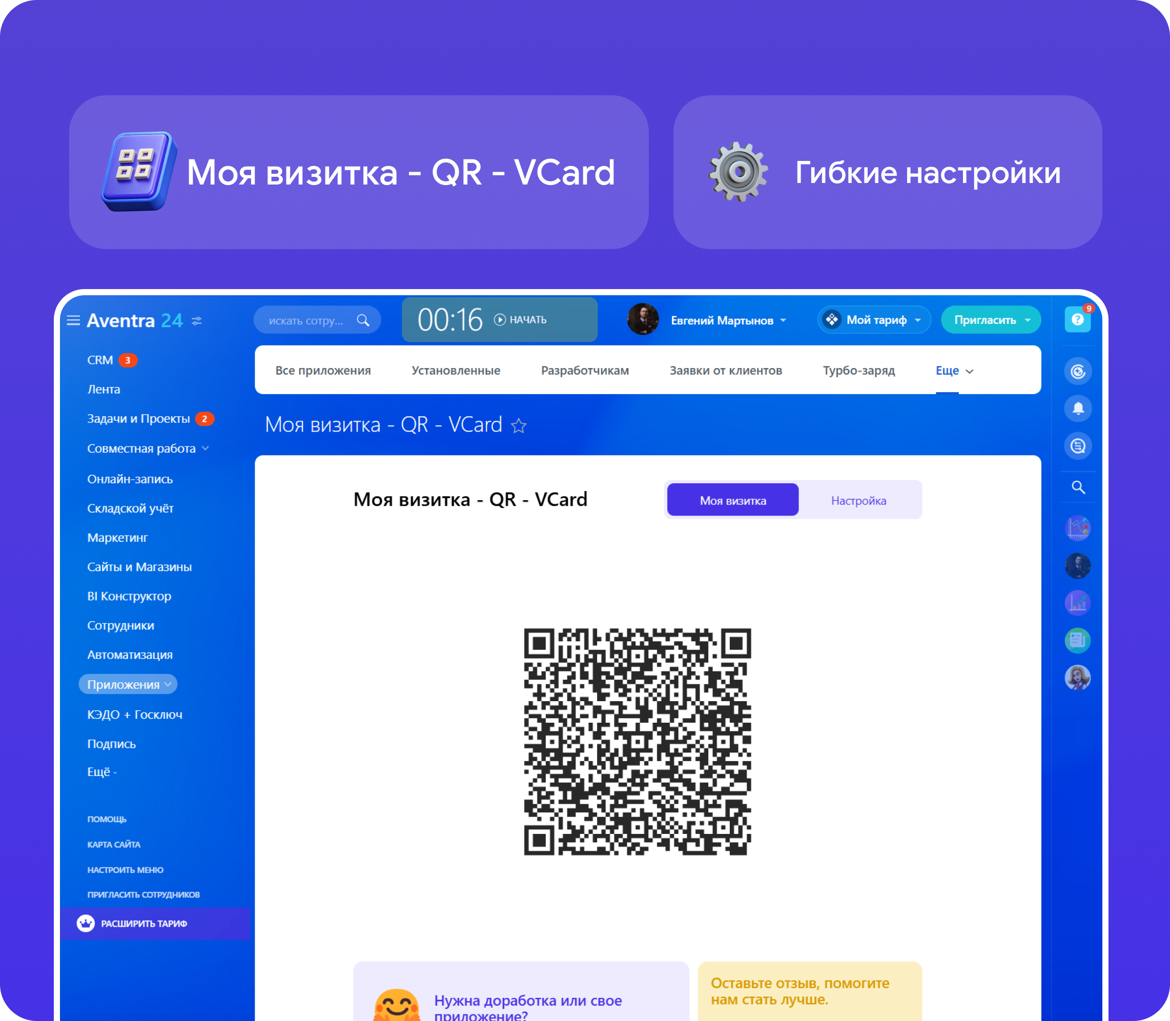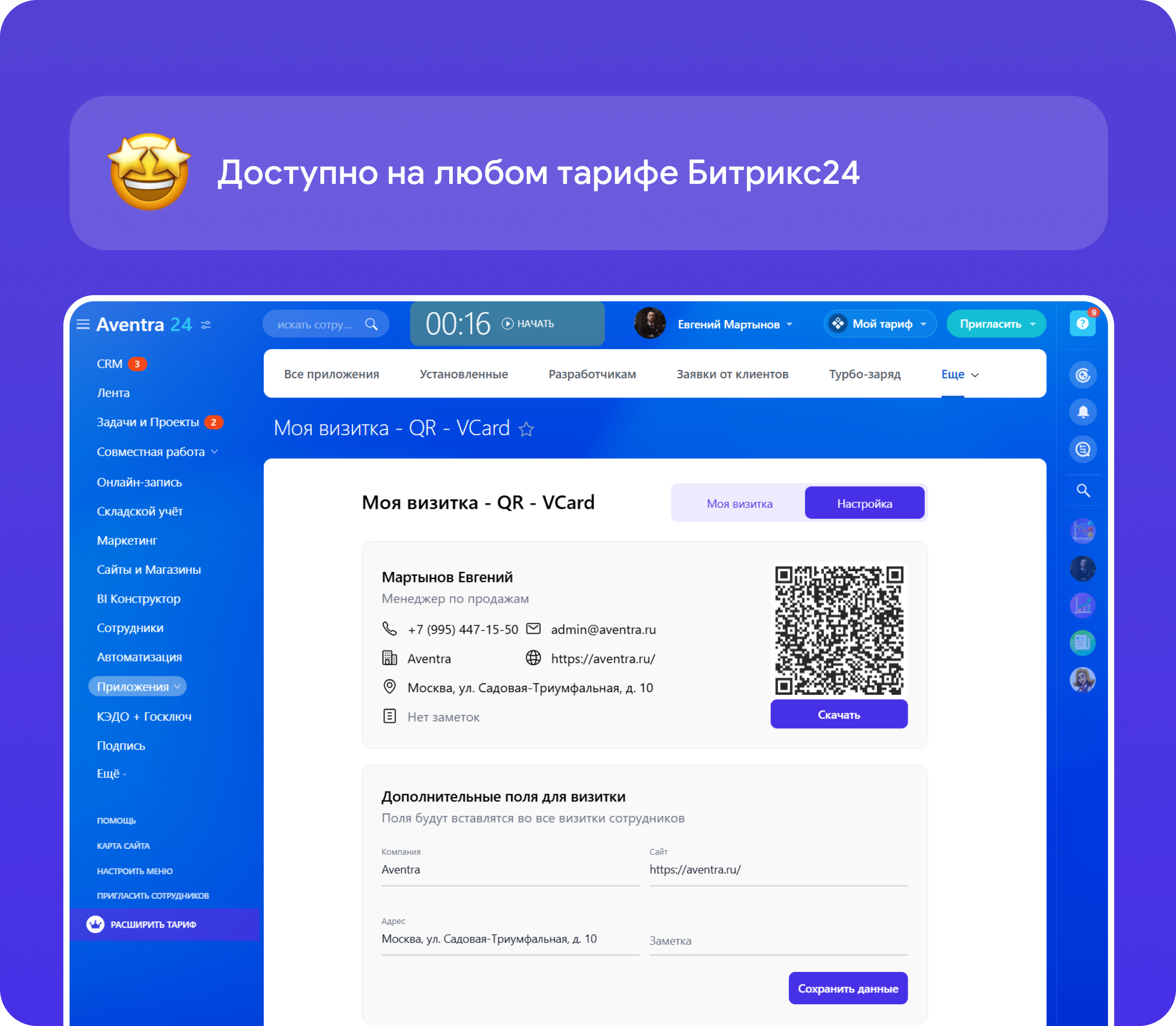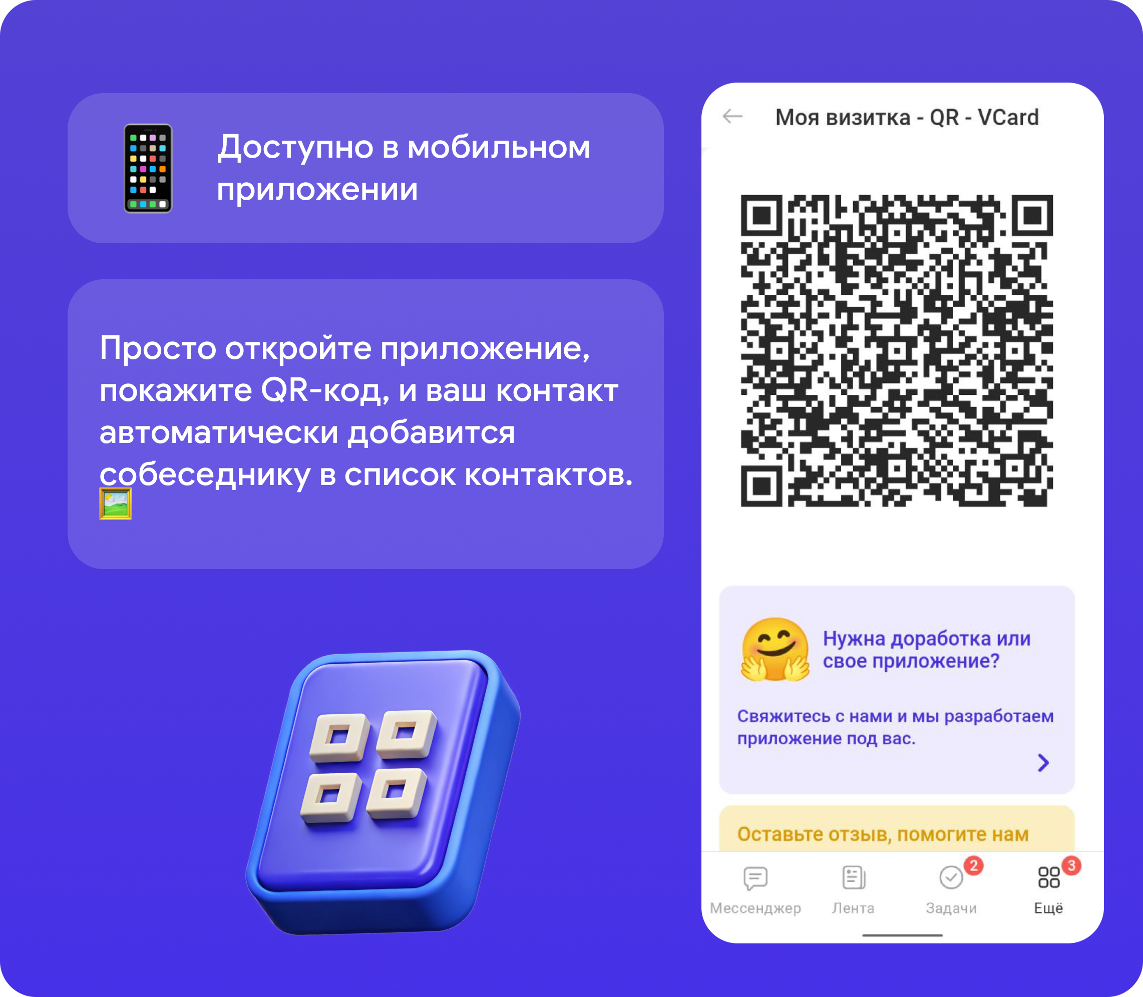 Как это работает?После установки приложения в карточке сотрудника появится вкладка «Моя визитка». Перейдите на нее - и система автоматически создаст QR-код с вашими данными.