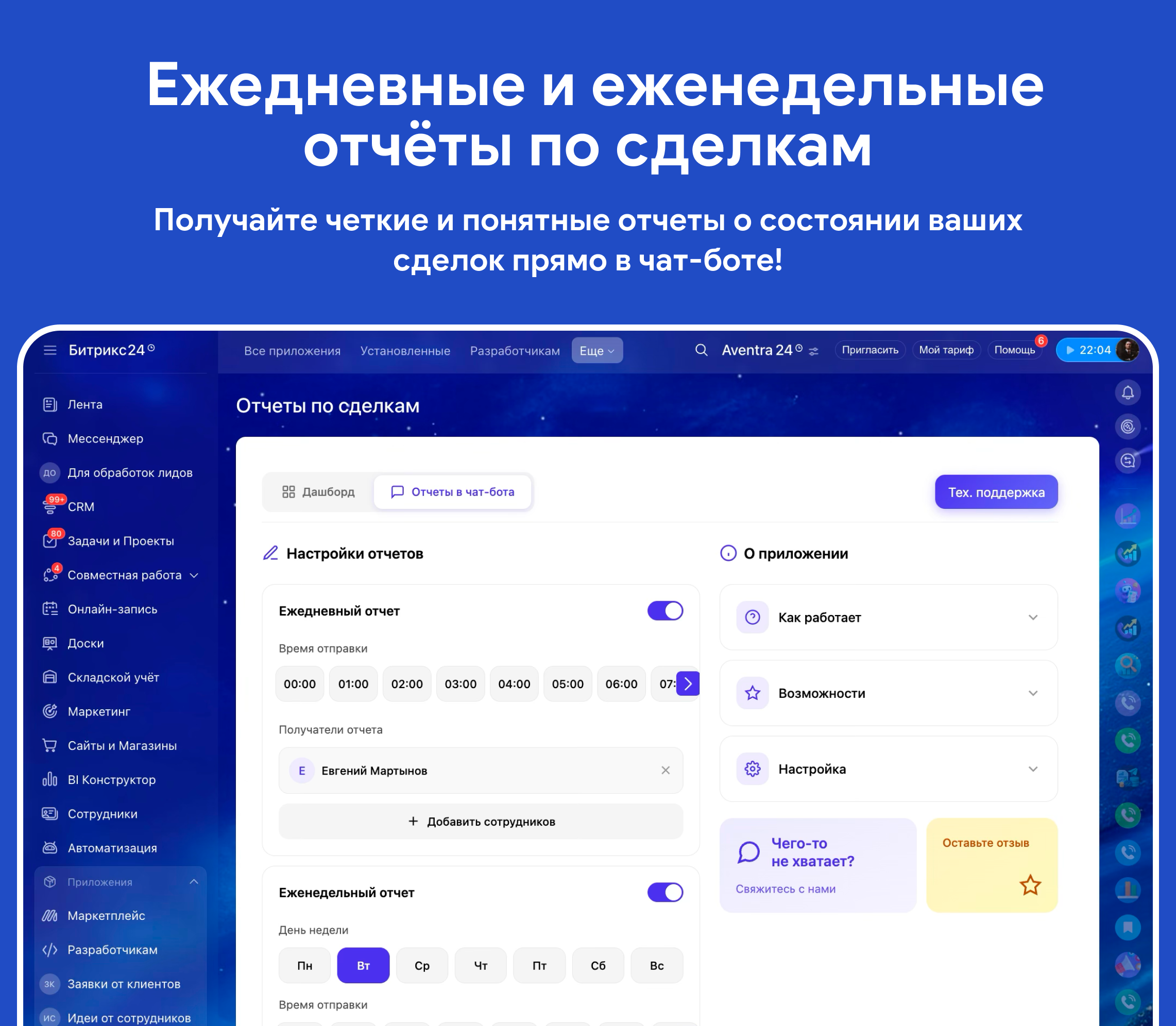 Ежедневные и еженедельные отчёты по ключевым показателям прямо в чат: не нужно заходить в CRM, чтобы оставаться в курсе.
