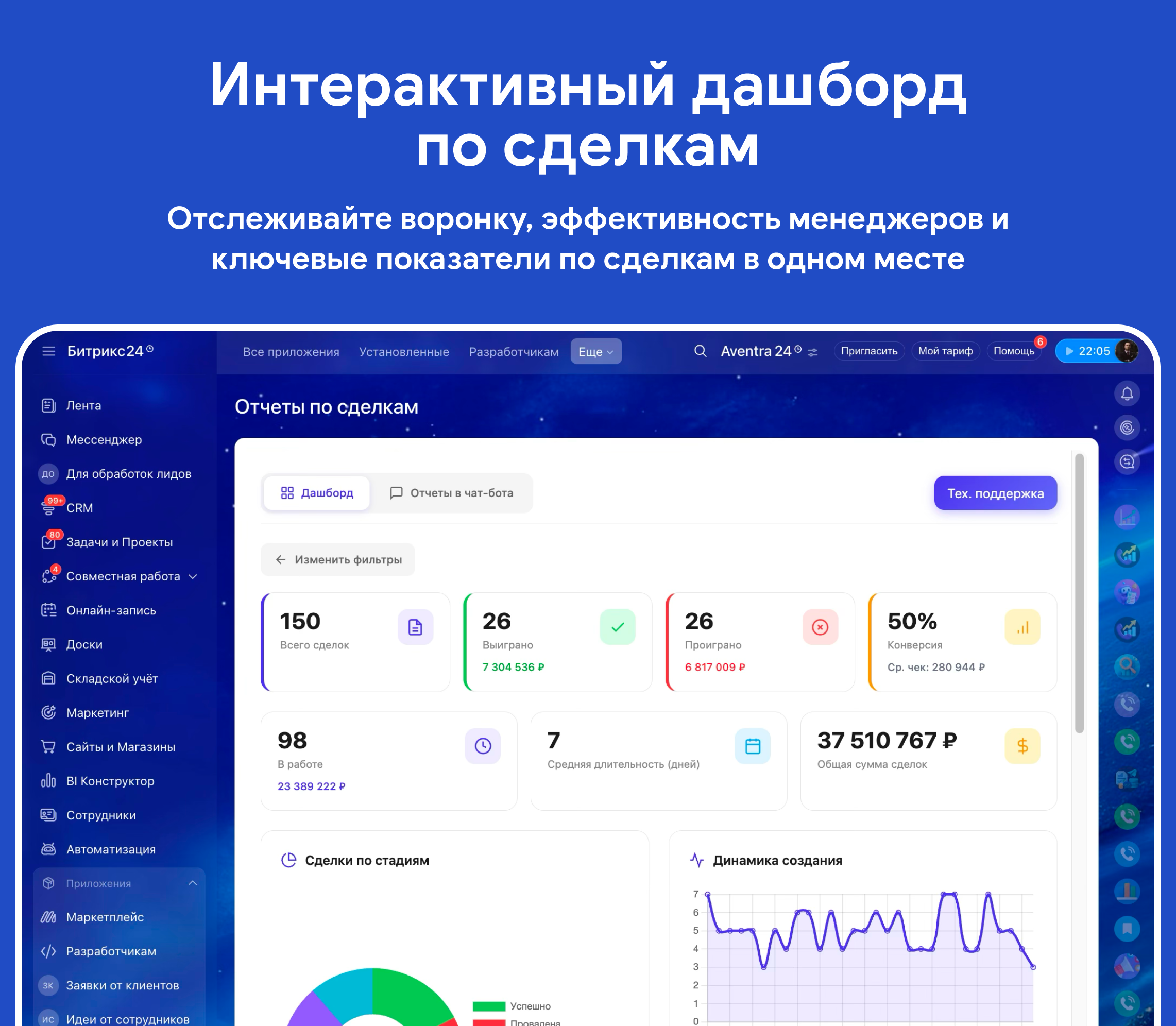 количество сделок, суммы, выигранные/проигранные, в работе, конверсия, средний чек, средняя длительность сделки и многое другое.