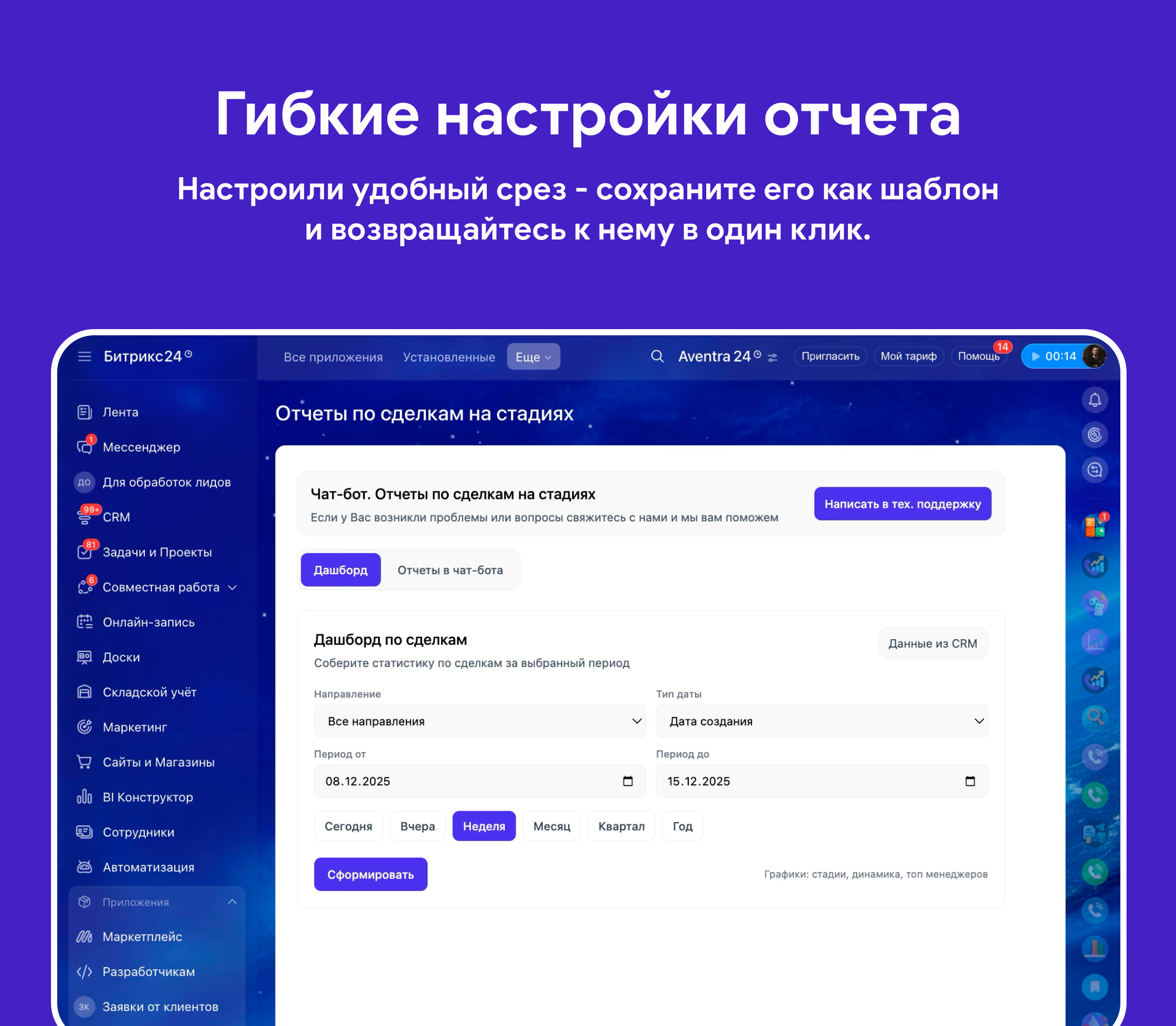 Отчеты по сделках на стадиях в чат-боте или дашборде