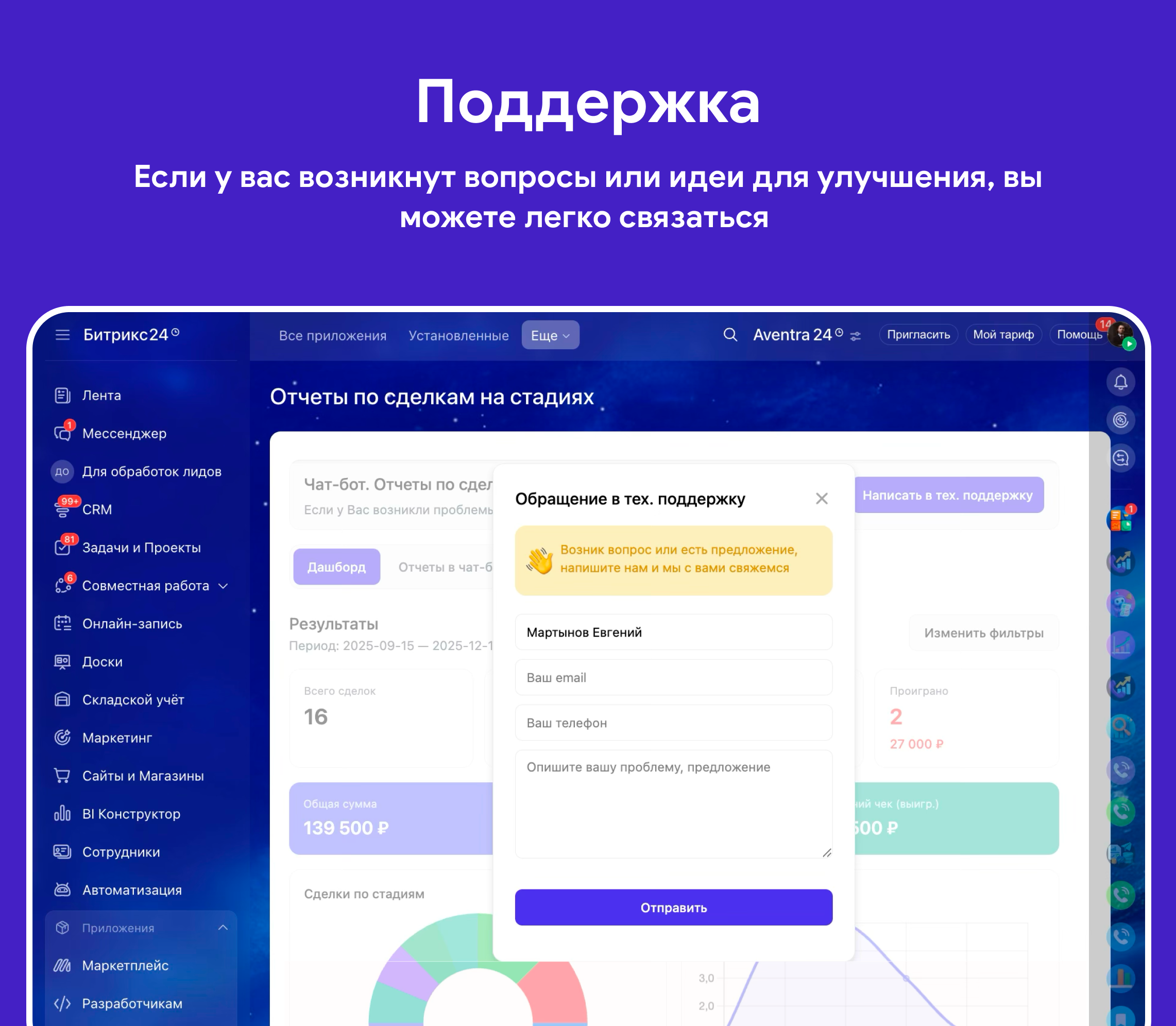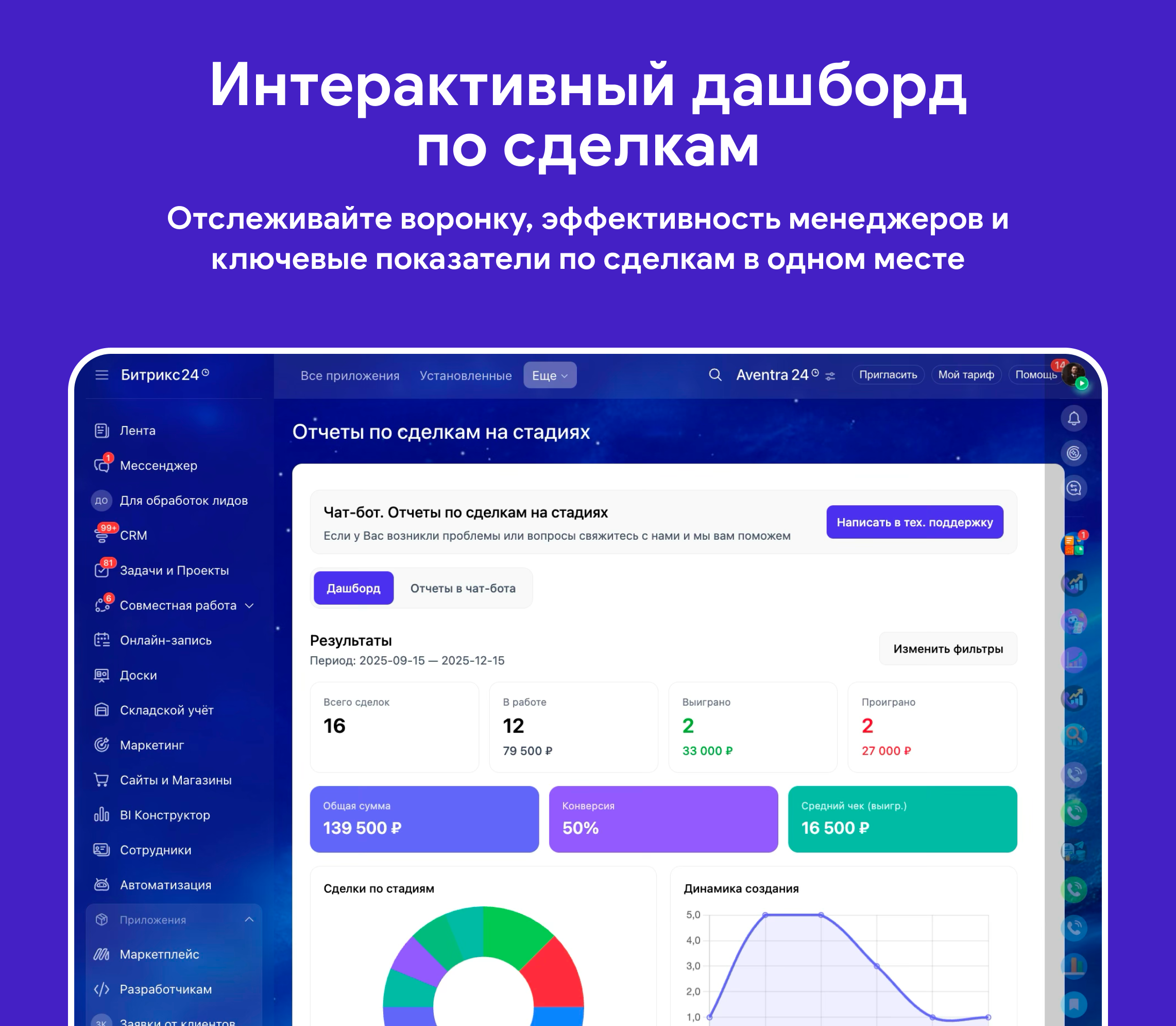 количество сделок, суммы, выигранные/проигранные, в работе, конверсия, средний чек, средняя длительность сделки и многое другое.