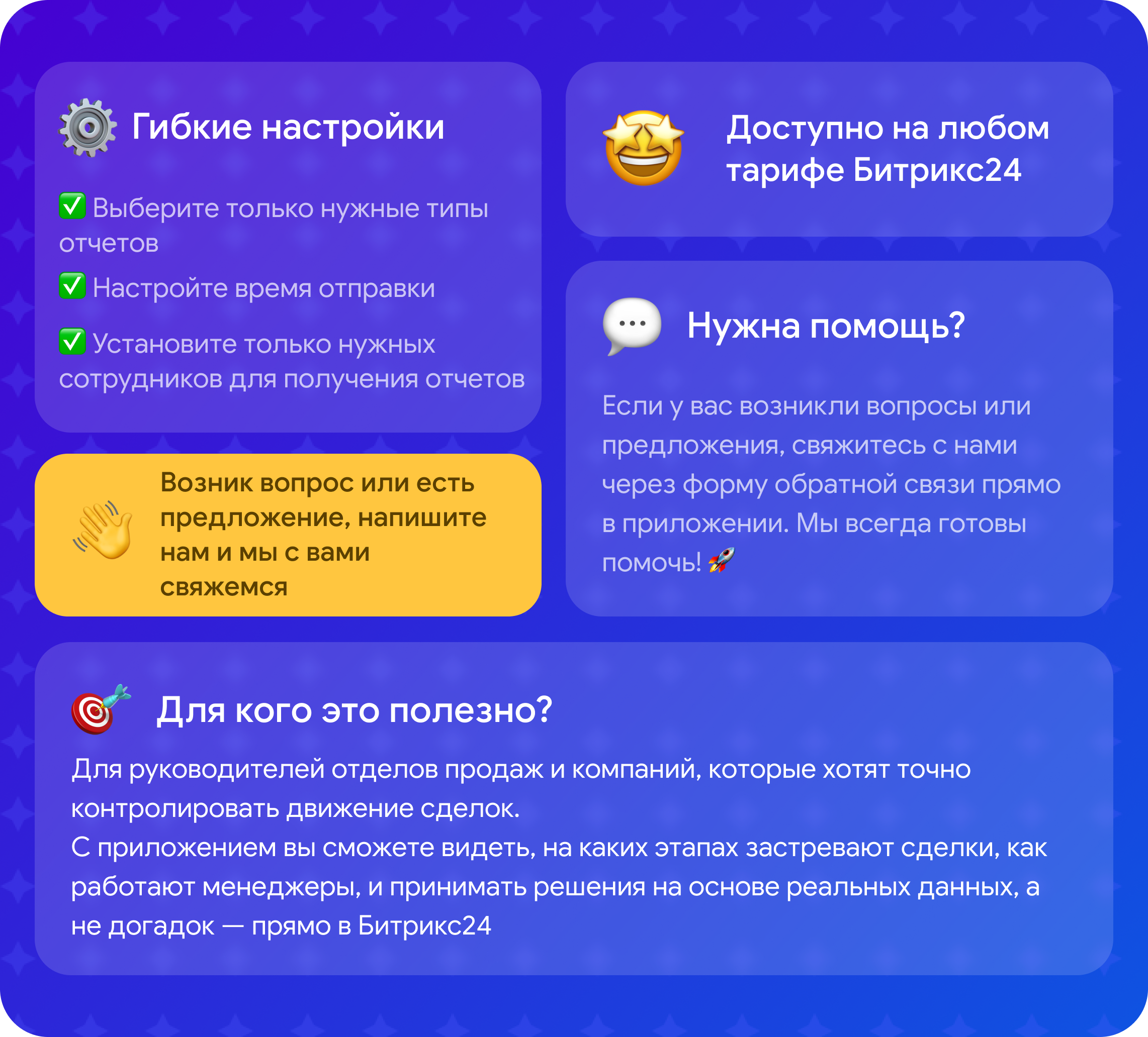 Отслеживайте воронку, эффективность менеджеров и ключевые показатели по сделкам в одном месте - в дашборде приложения и удобных отчётах прямо в чат-боте.