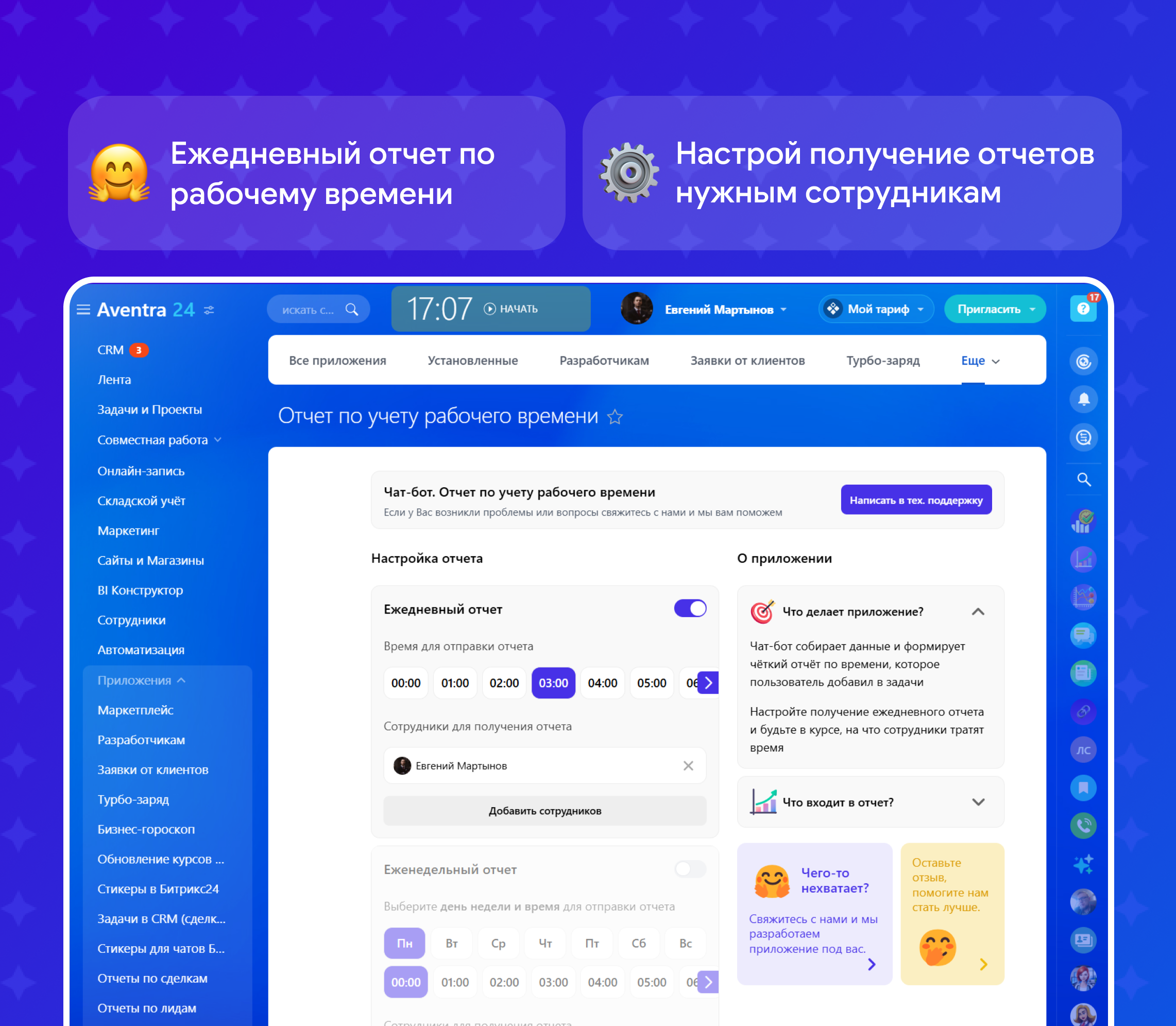 Настройка не требуется — приложение само устанавливает чат-бота. После установки вы будете регулярно получать отчёты в удобное время, не тратя время на сбор данных вручную.