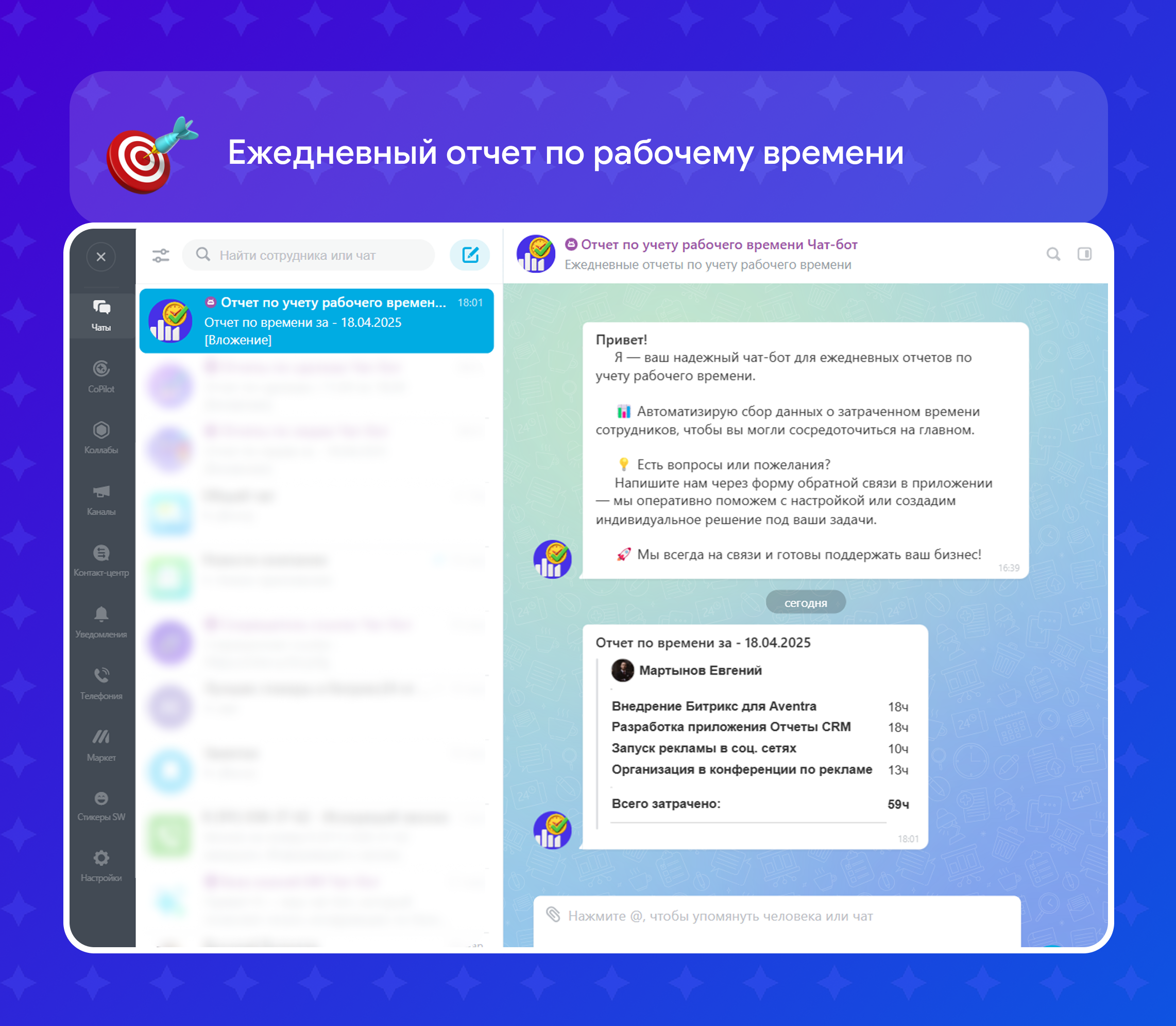 Получайте чёткие и понятные отчёты о том, как сотрудники тратят своё рабочее время — прямо в чат-боте! Отчет формируется по времени, внесенному пользователями за предыдущий день