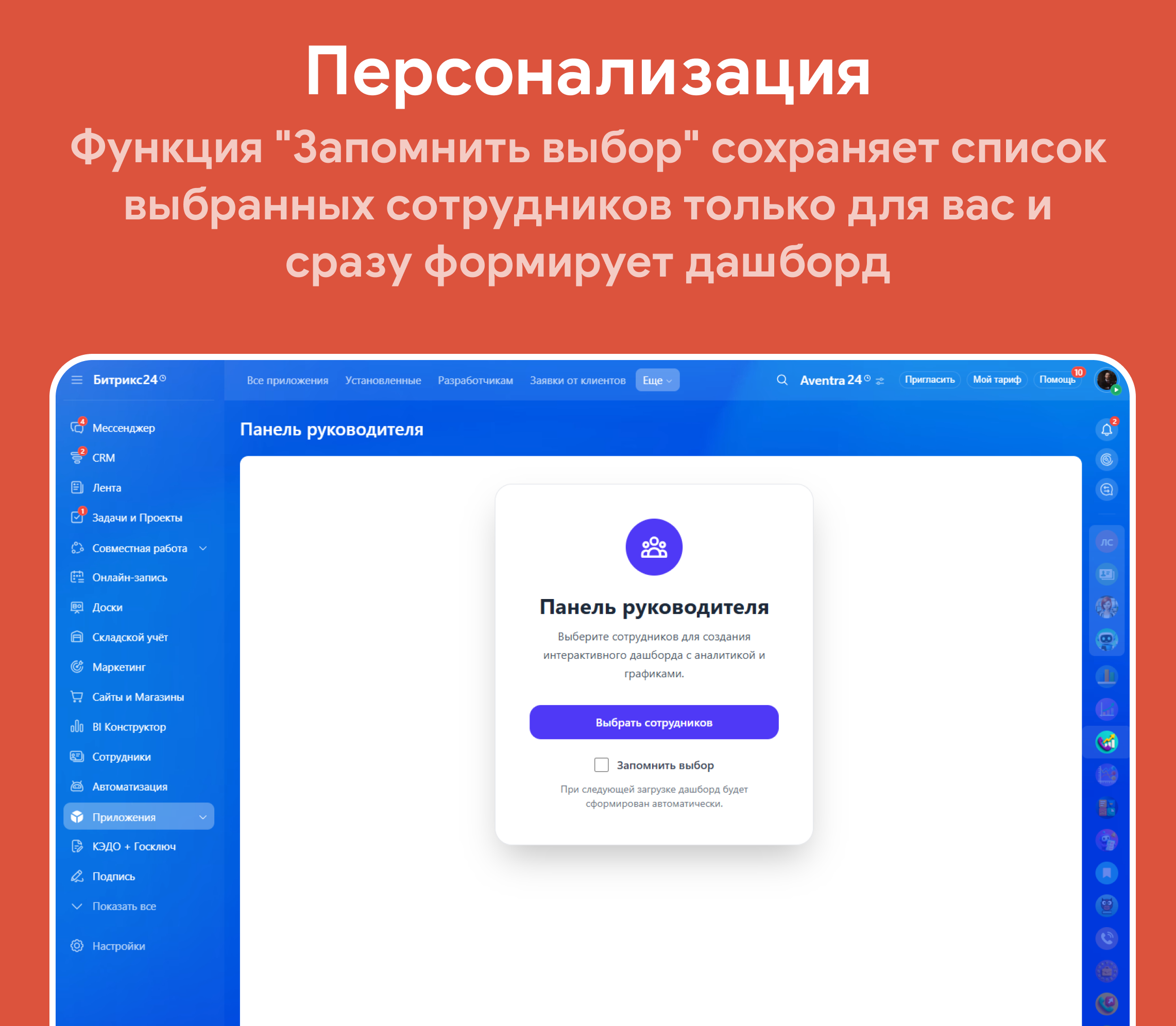 • Выбор сотрудников: Формируйте дашборд для всей команды, отдела или проектной группы, просто выбрав нужных пользователей из списка.