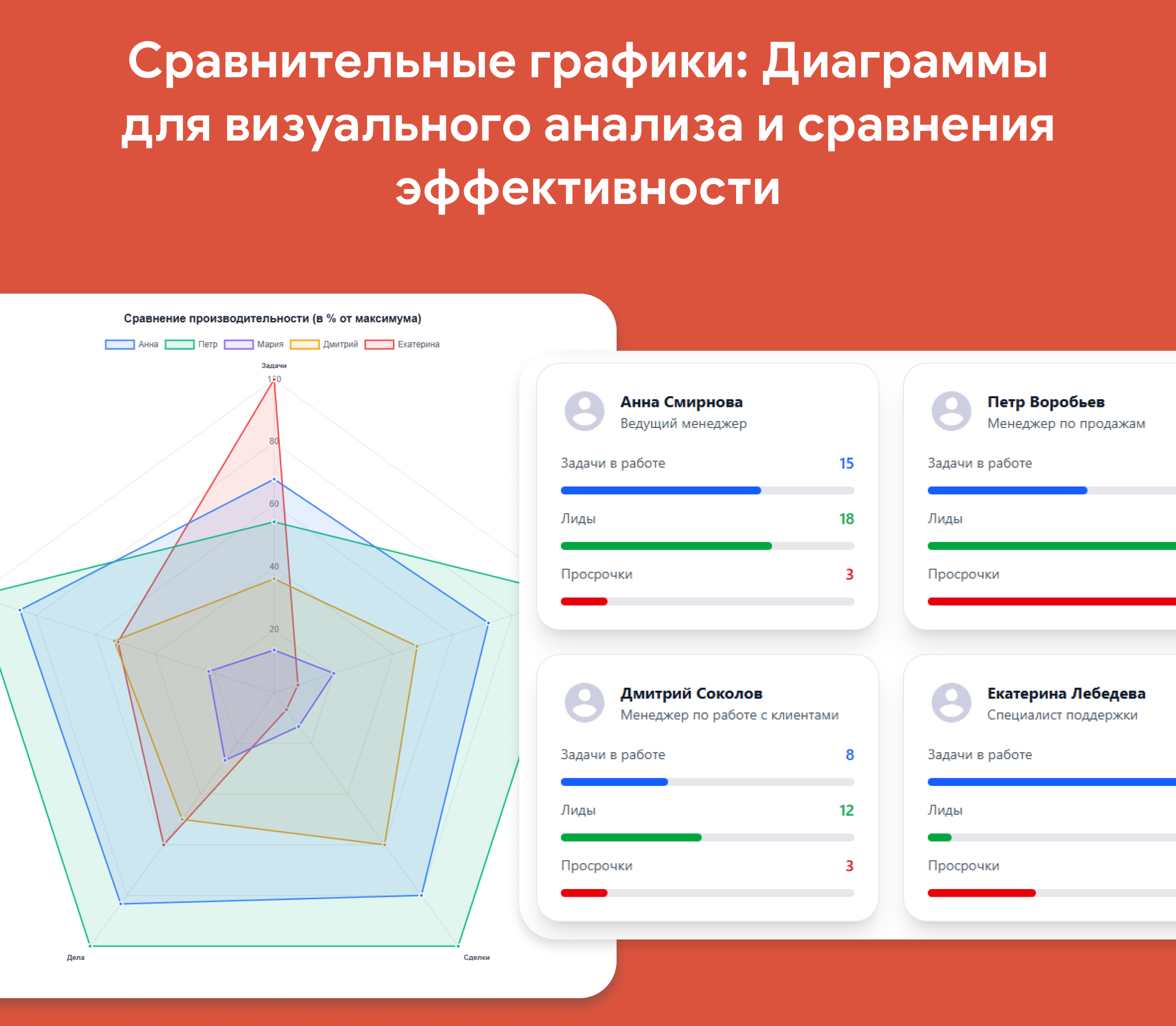 • Обеспечивает наглядное сравнение производительности: Легко сравнивайте показатели сотрудников между собой, чтобы принимать взвешенные решения о распределении нагрузки и поощрении.