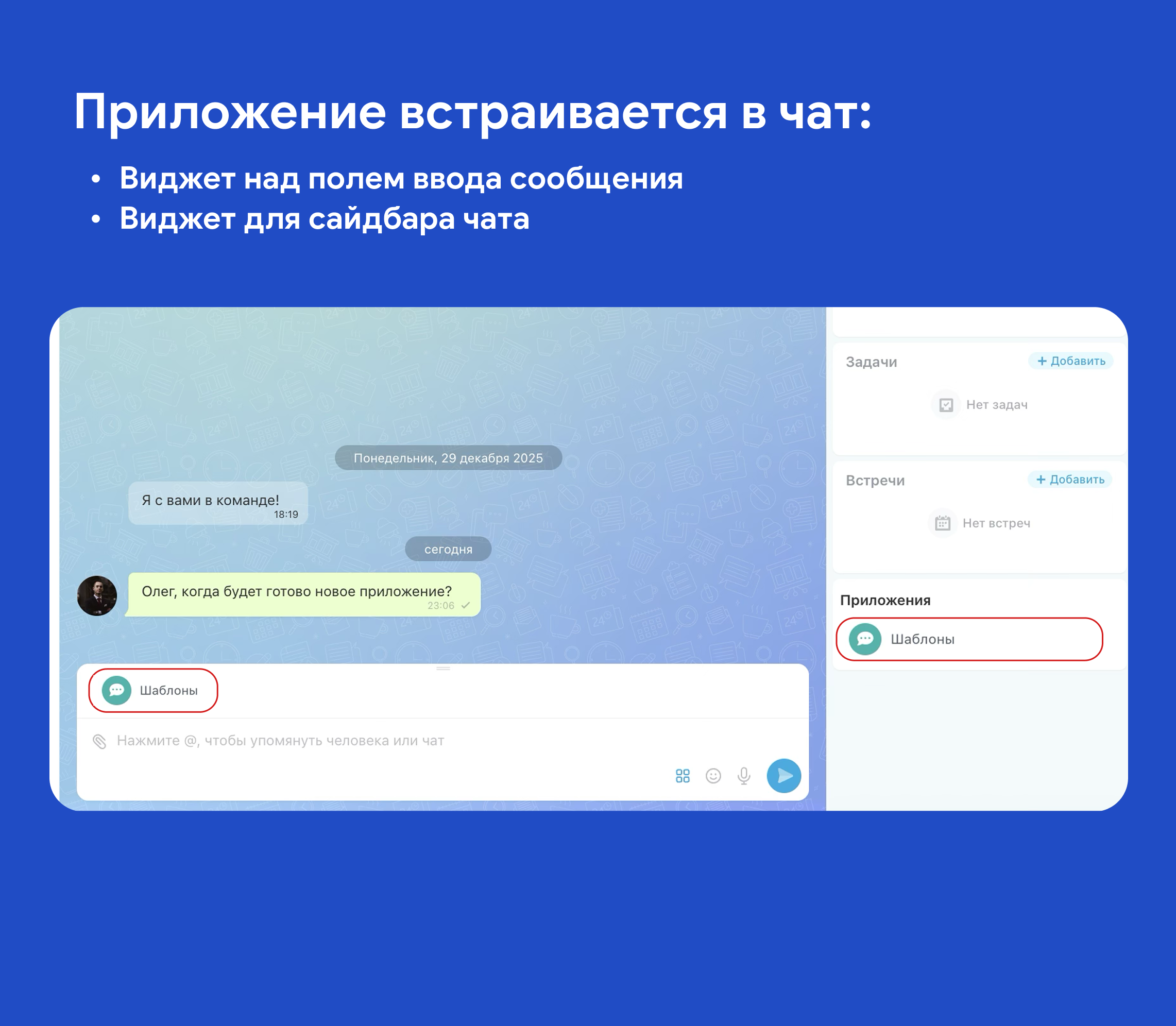Приложение предназначено для ускорения переписки в рабочих чатах. Оно встраивается в интерфейс чата и позволяет выбирать готовые шаблоны ответов, редактировать текст перед отправкой, сразу отправлять сообщение в диалог и сохранять новые удачные формулировки в личную библиотеку.
