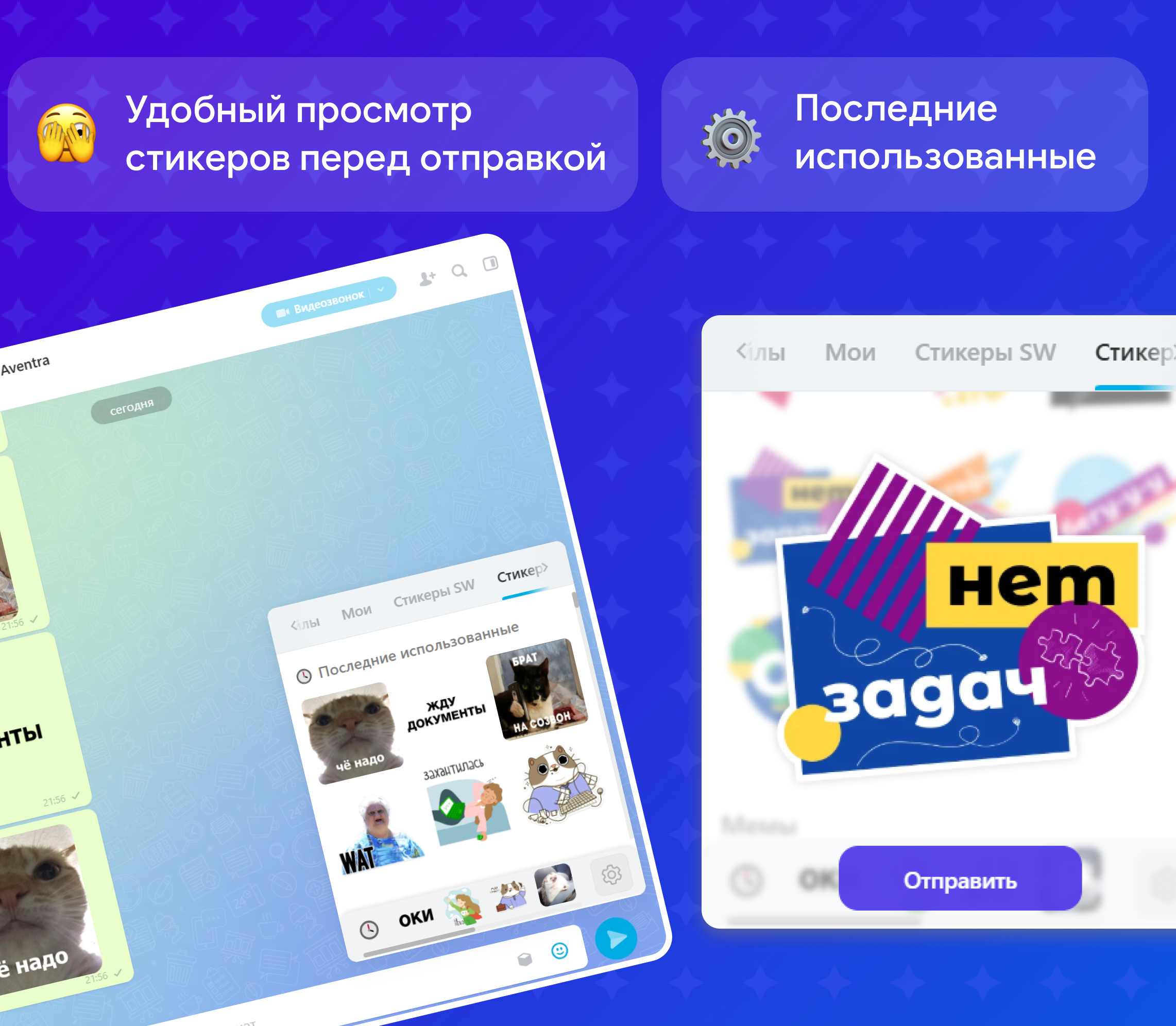 Сделай общение в чата ярче с нашим стикерам! Более 20 стикер-паков и +750 стикеров на любой случай, а если этого мало — добавь свои корпоративные стикеры.