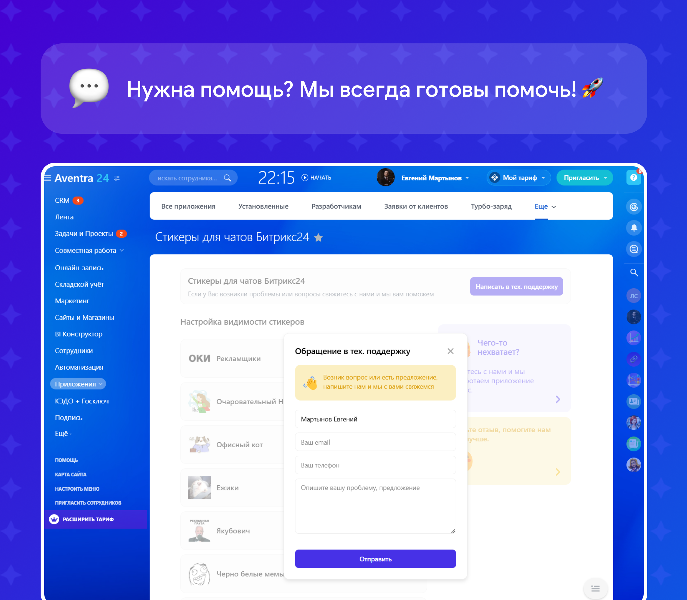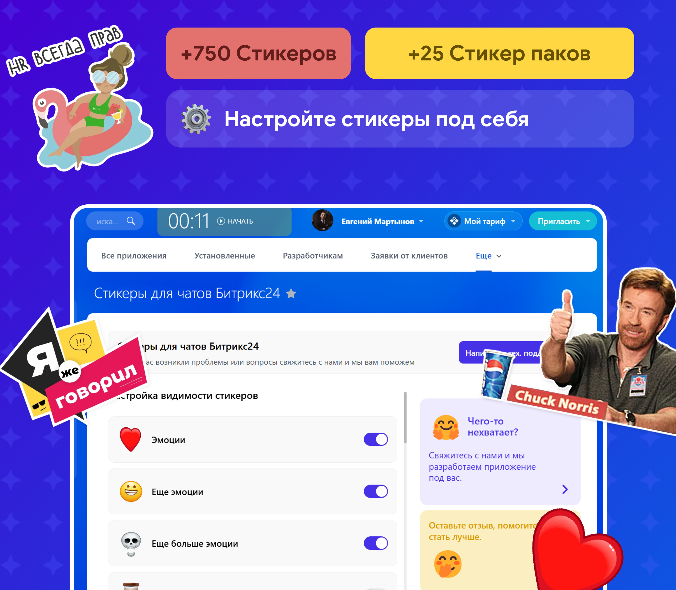 Приложение легко интегрируется в Битрикс24 и работает прямо в чатах без сложных настроек. Удобный выбор стикеров и моментальная отправка в сообщения помогут вам выразить мысли быстрее и креативнее.