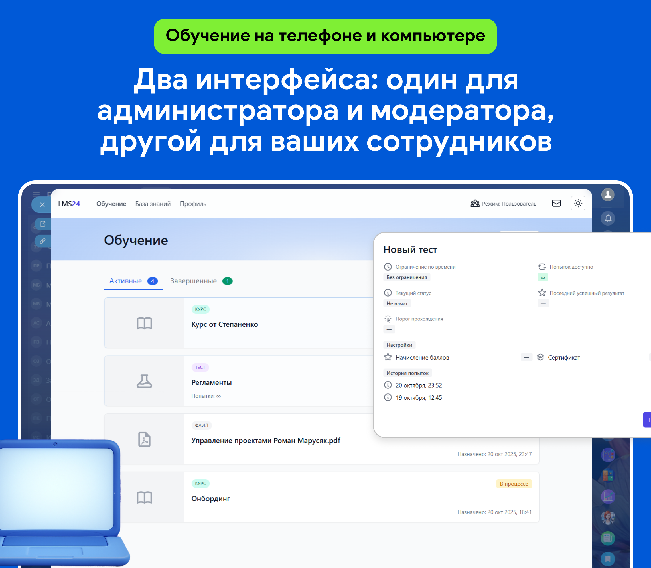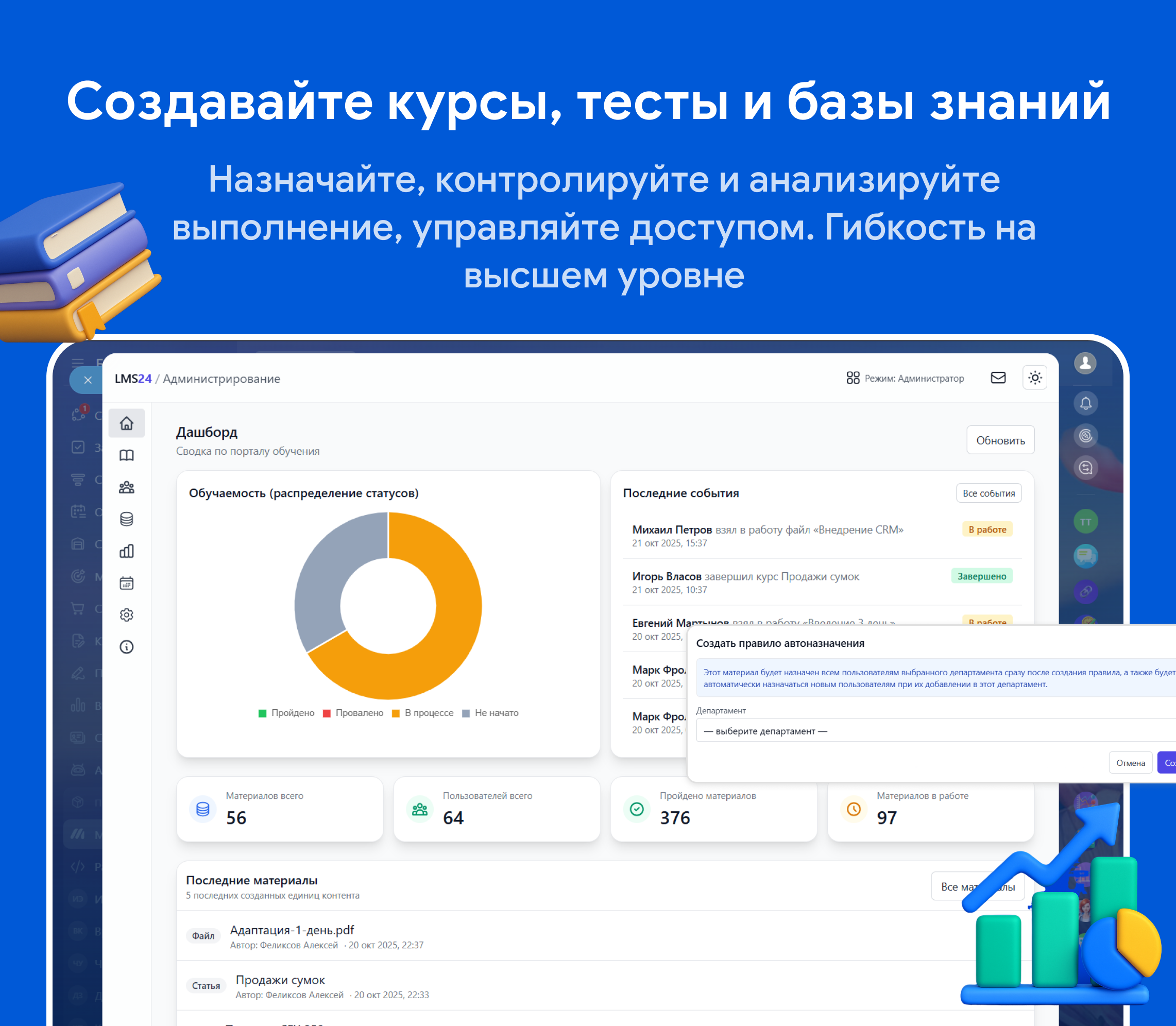 Запускайте курсы, контролируйте прогресс, защищённо делитесь документами и выдавайте сертификаты. Система может автоматически назначать материалы по отделам, присылать напоминания и собирать метрики эффективности — от прохождения уроков до результатов тестов. Админ видит всю картину, сотрудник — только то, что ему нужно пройти.