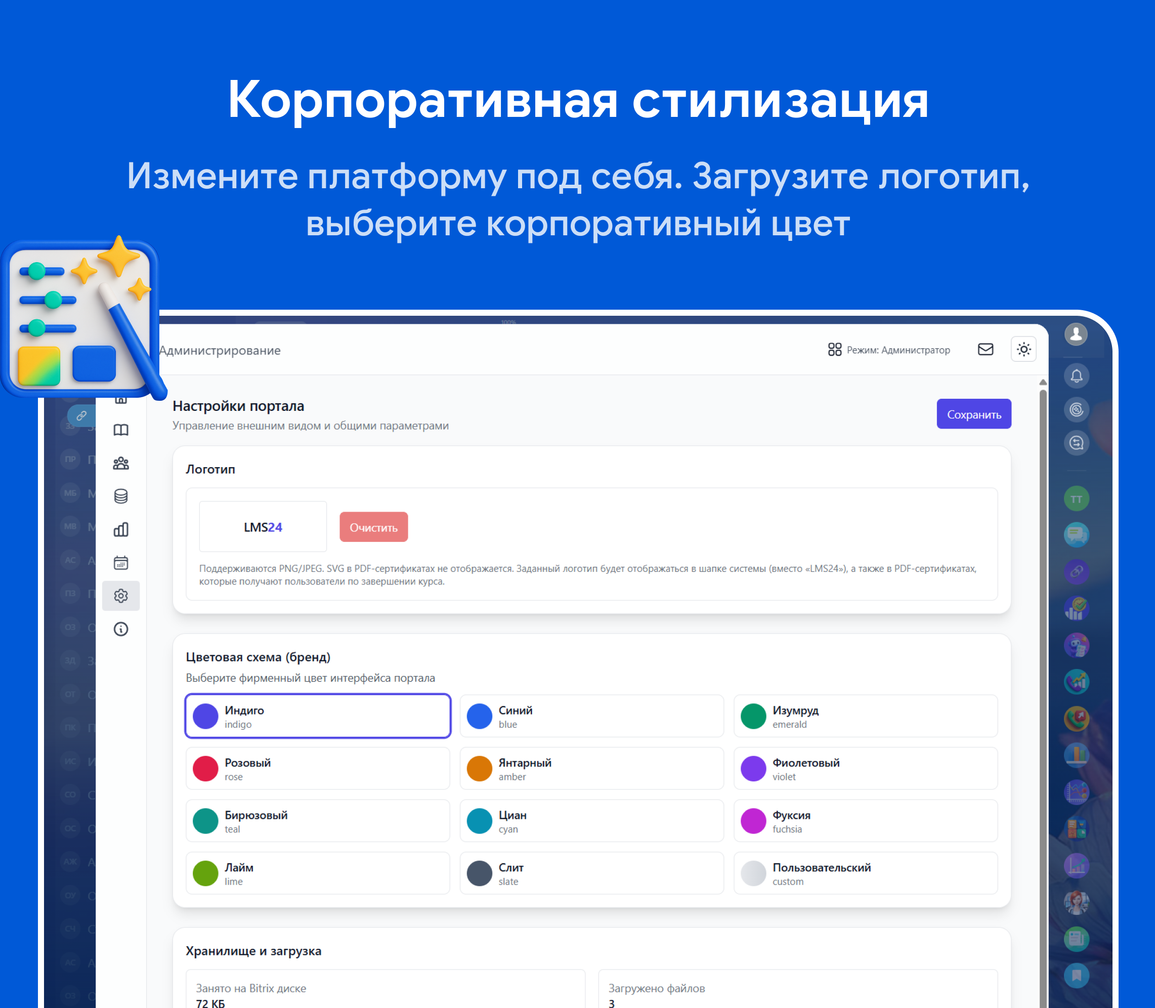 Брендинг под вашу компанию: логотип, фирменный цвет, оформление сертификатов и интерфейса.