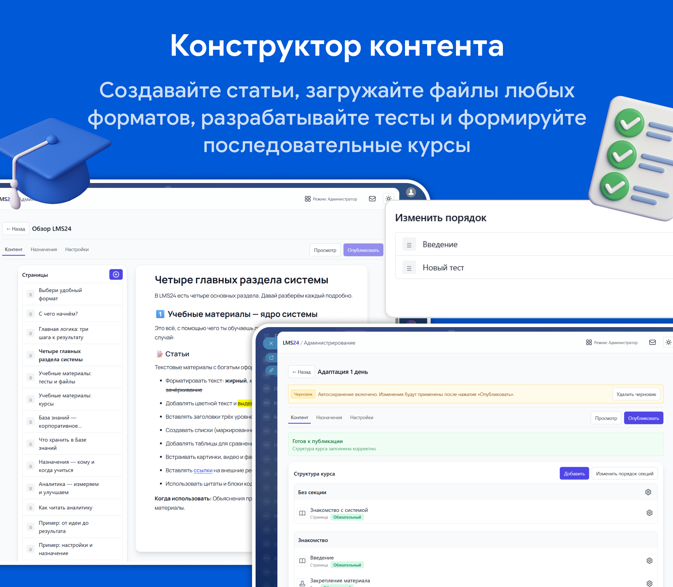 Конструктор материалов: статьи, файлы, тесты, последовательные курсы.