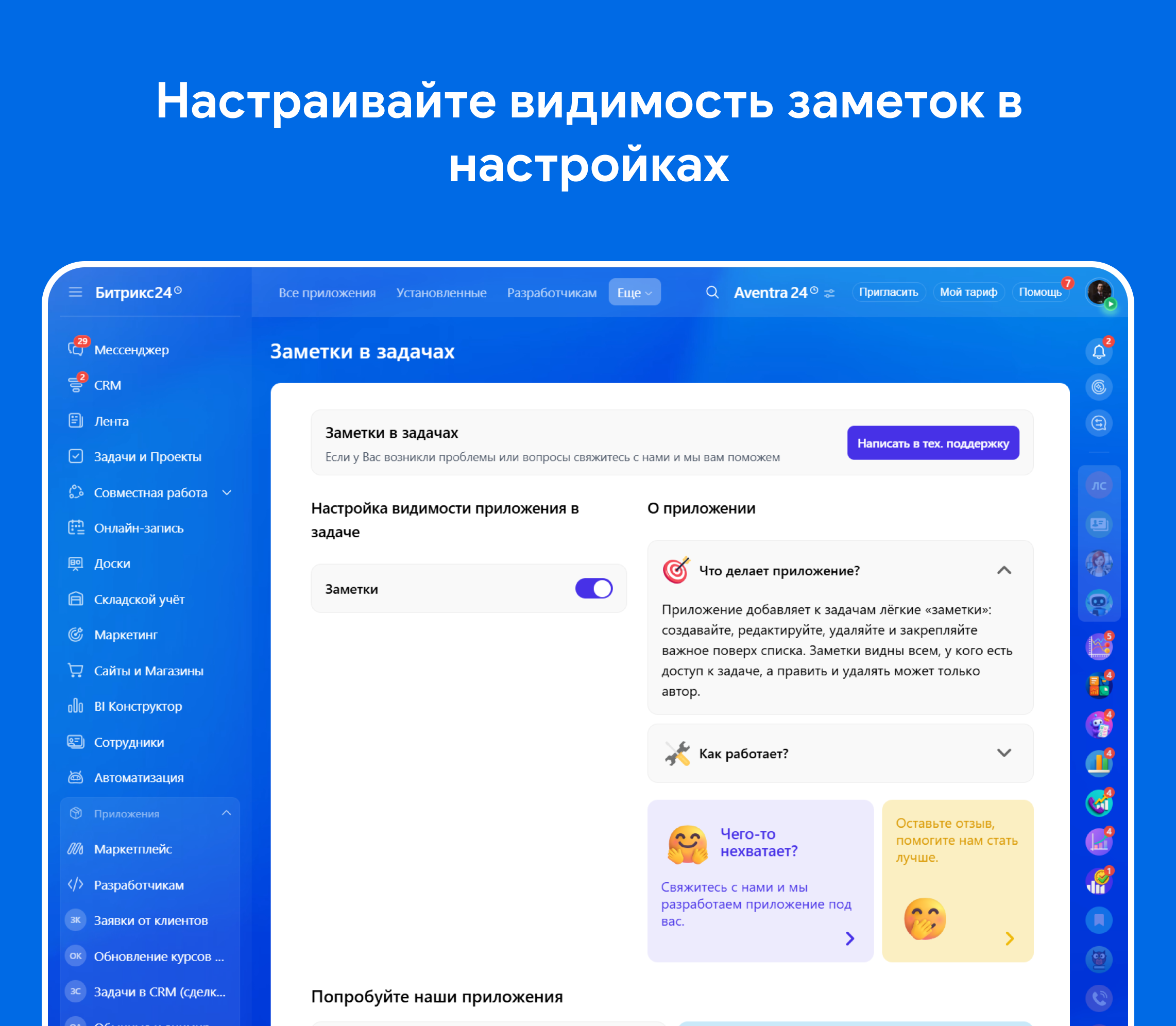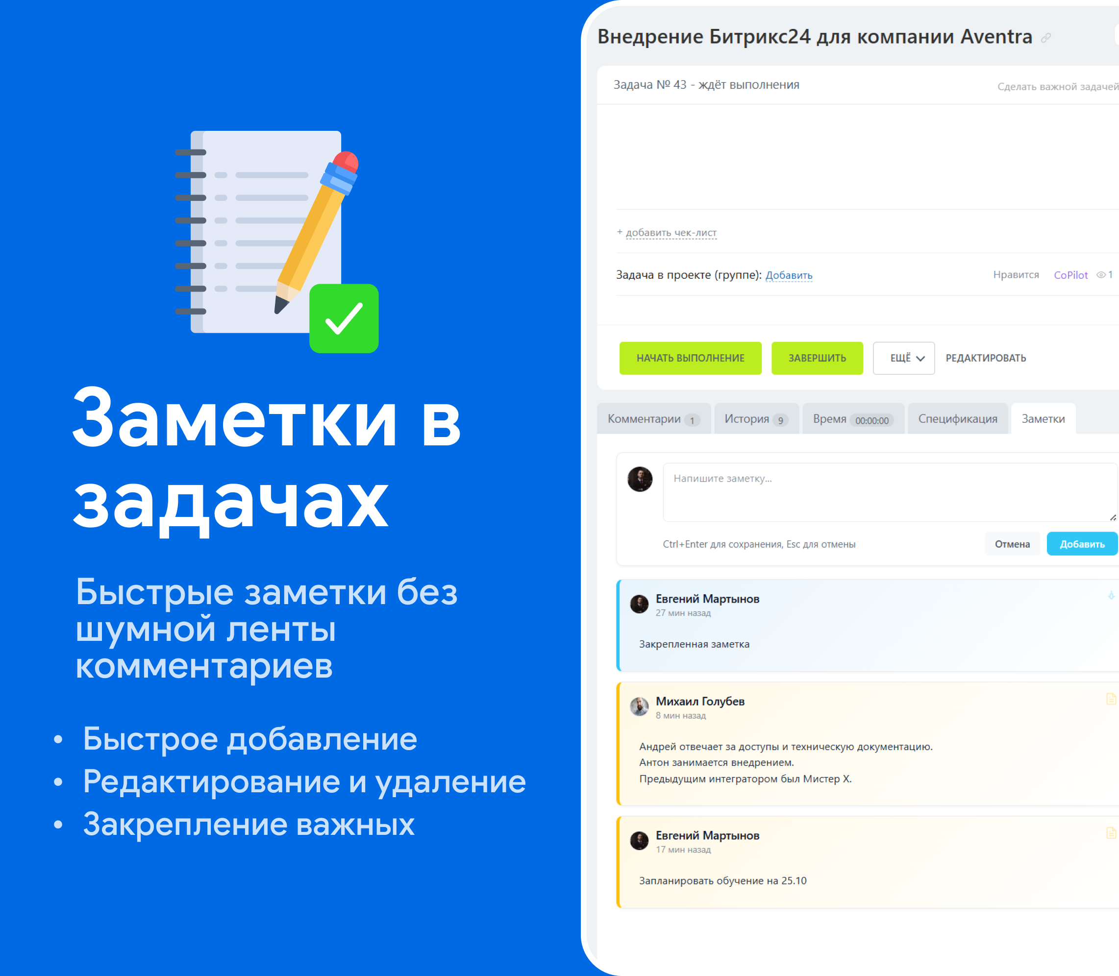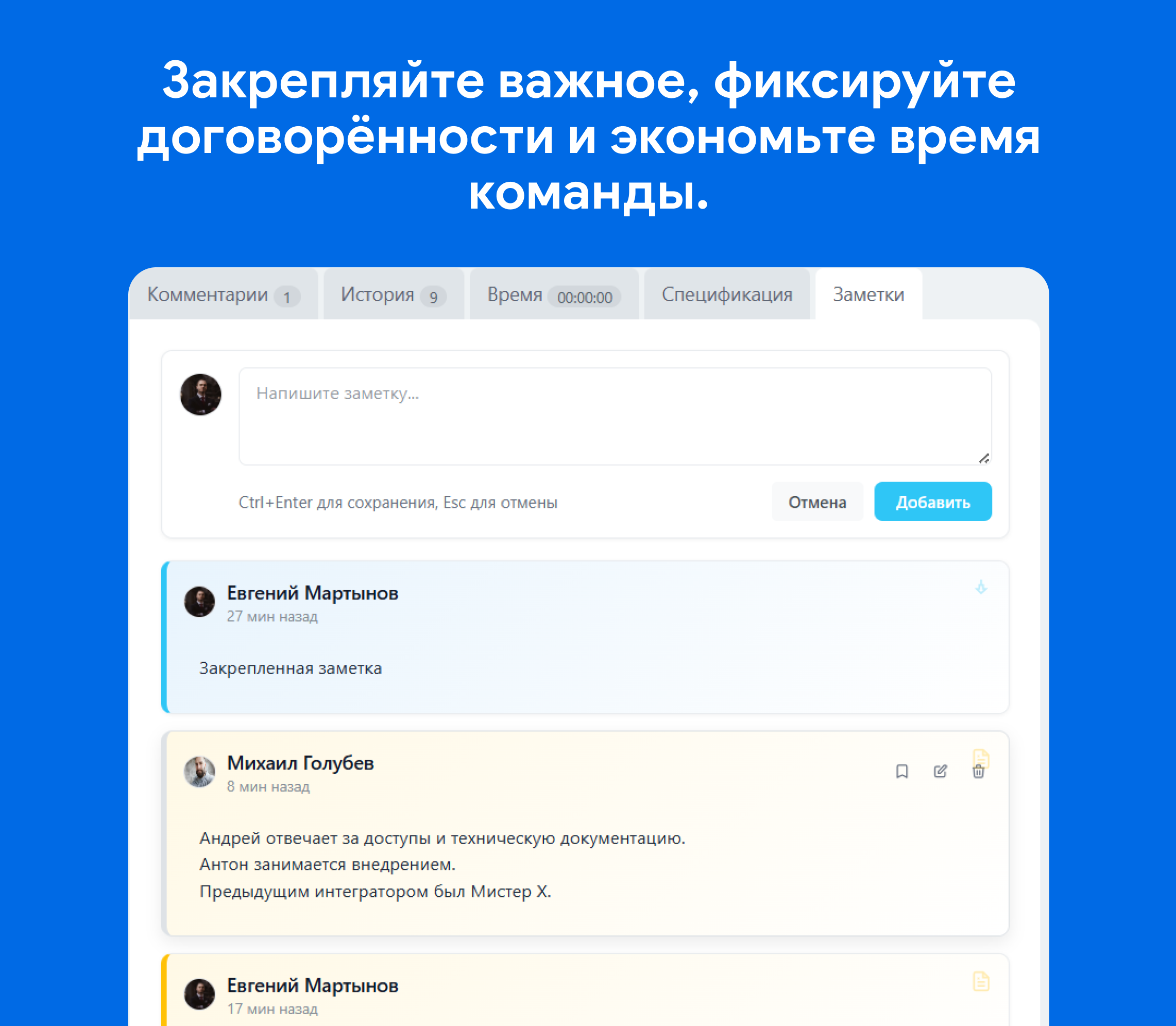 «Быстрые заметки прямо в задаче - без шумной ленты комментариев.» Закрепляйте важное, фиксируйте договорённости и экономьте время команды.