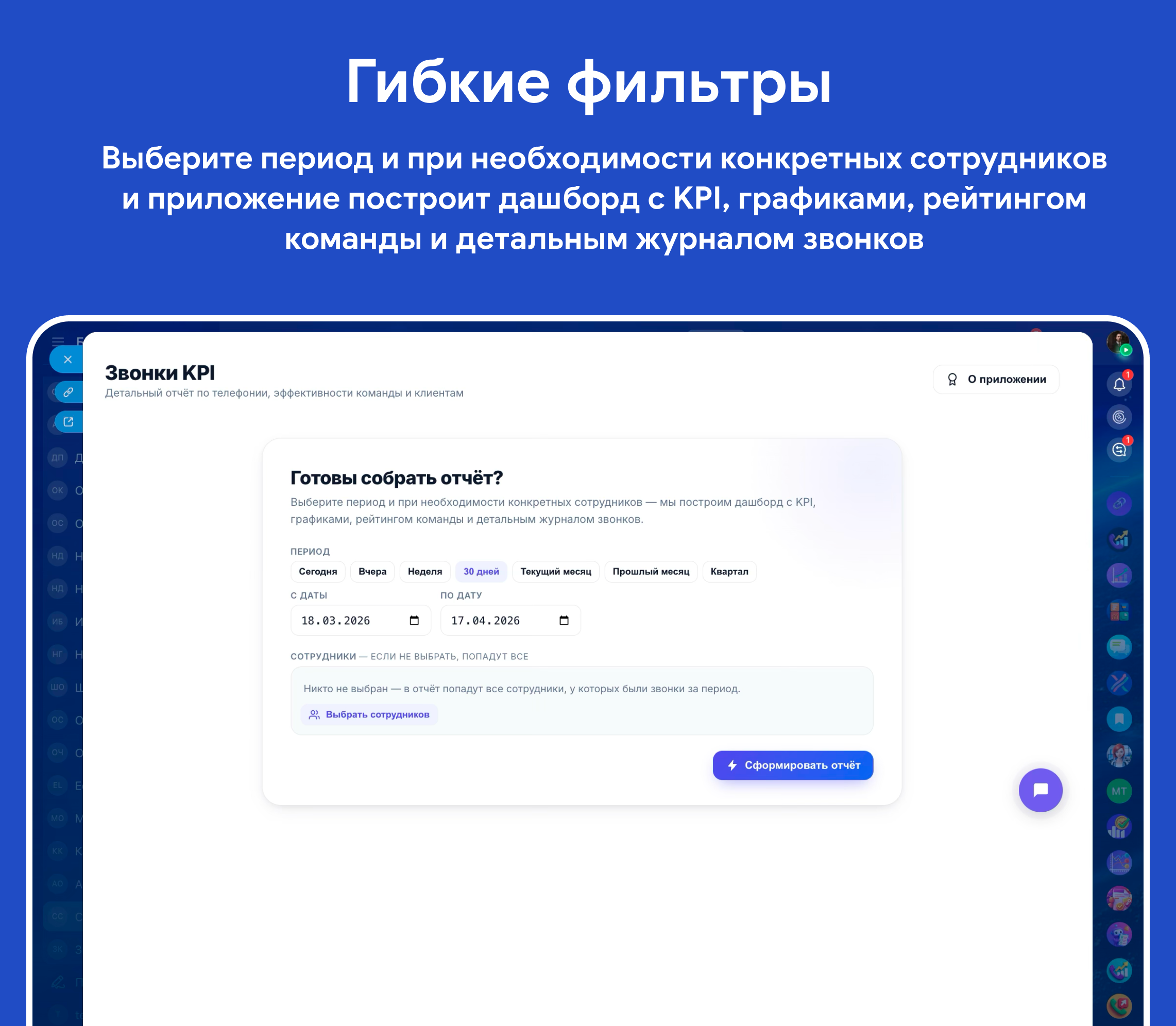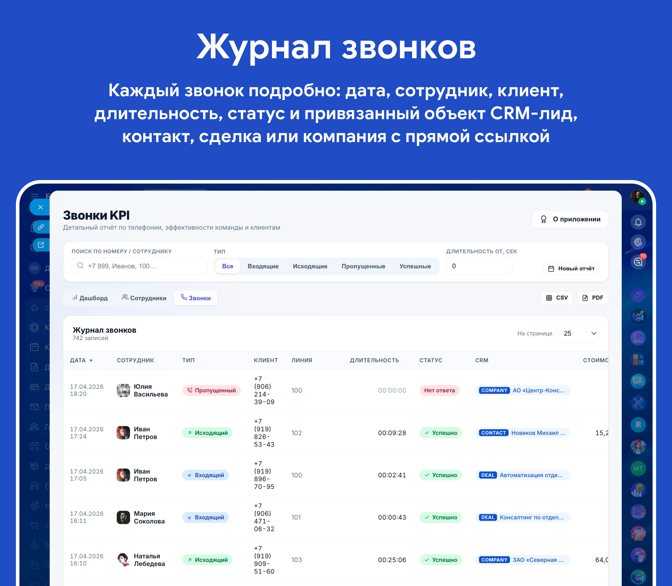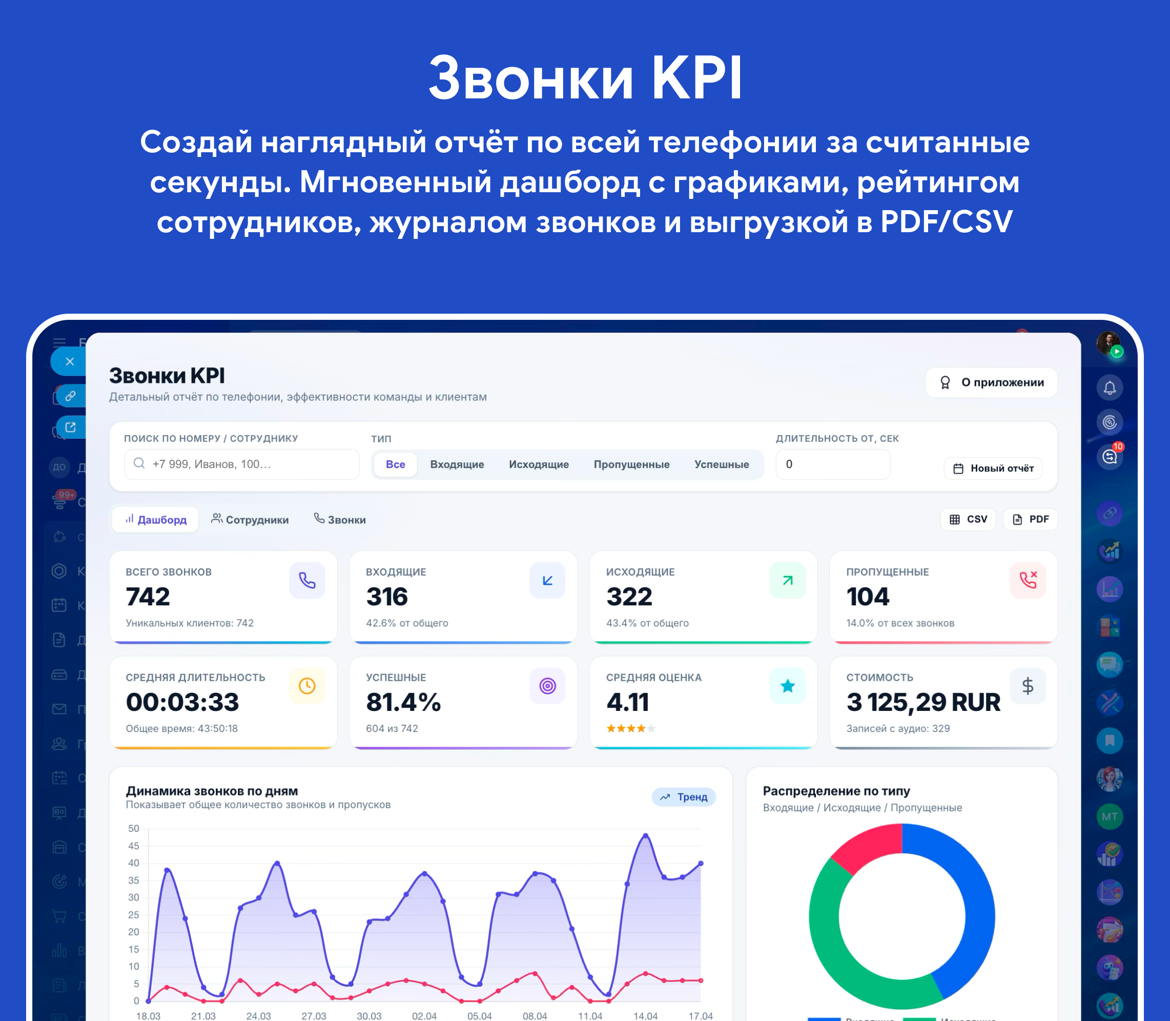 - Экспорт: многостраничный PDF-отчёт (hero-обложка, метрики, таблица сотрудников, журнал звонков) и CSV с полным набором полей.