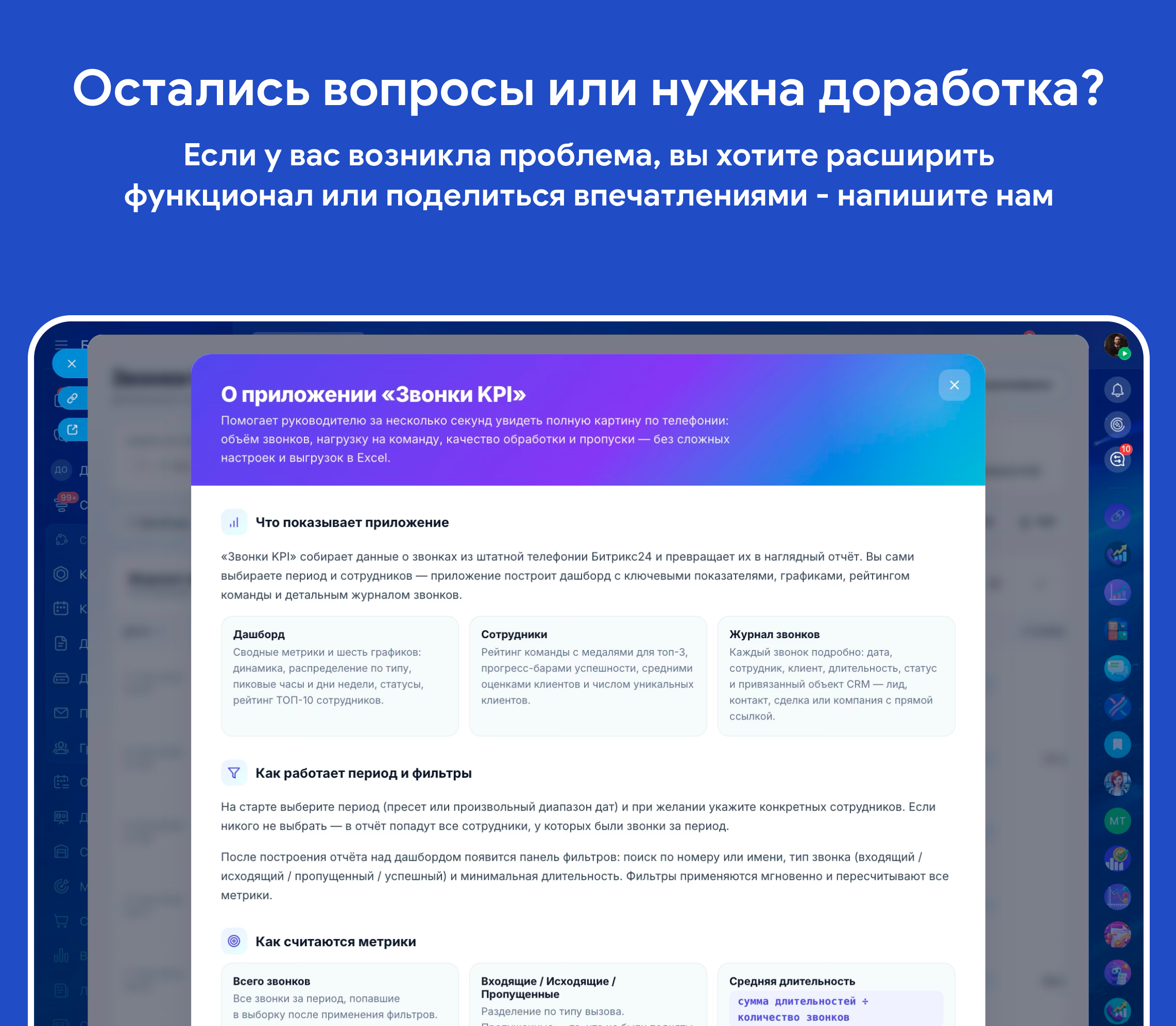 Важно знать:- Данные приходят из штатной телефонии Битрикс24 - приложение не хранит их у себя.