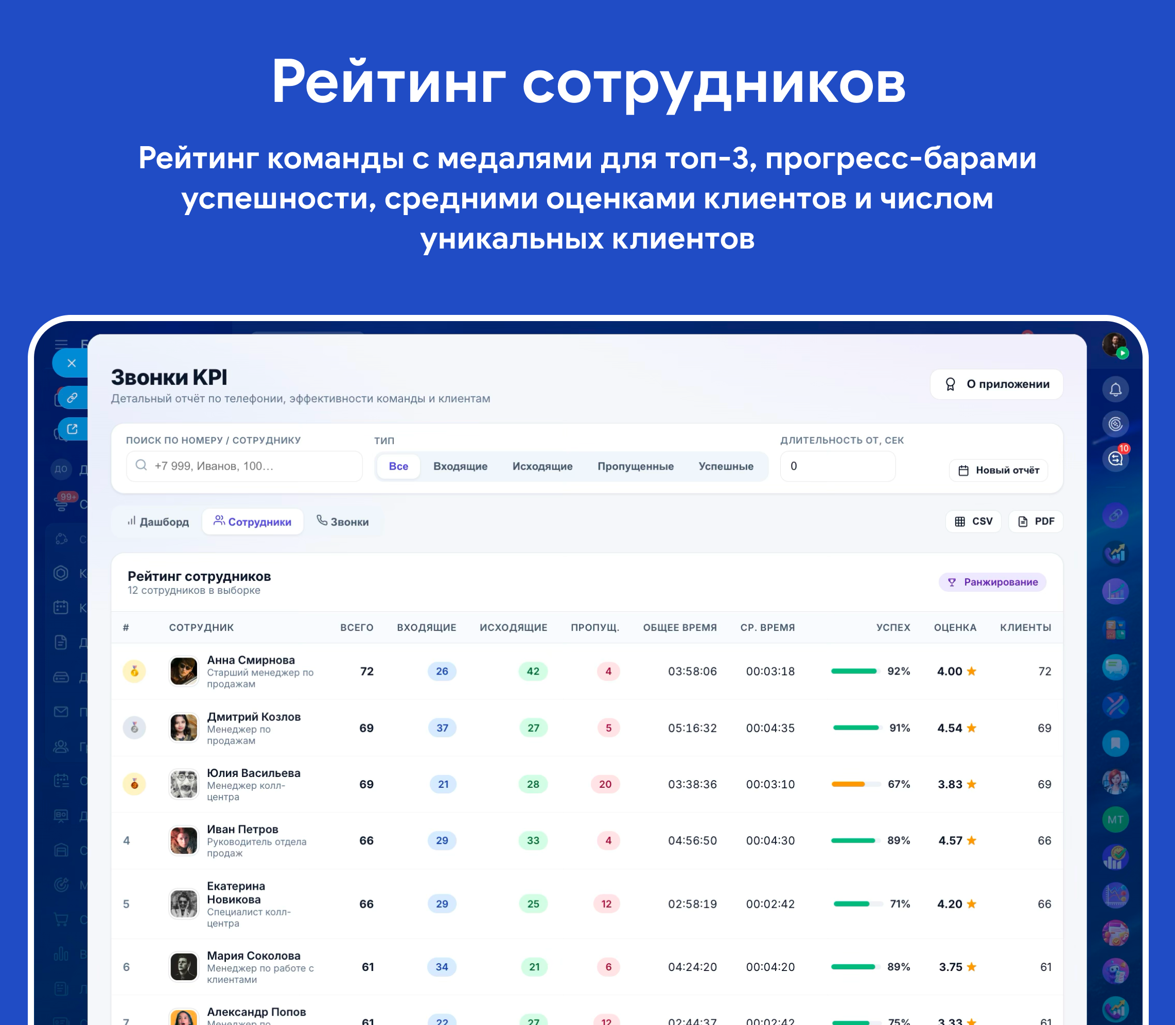 - Сотрудники: Рейтинг команды с медалями для топ-3, прогресс-барами успешности, средними оценками клиентов и числом уникальных клиентов.