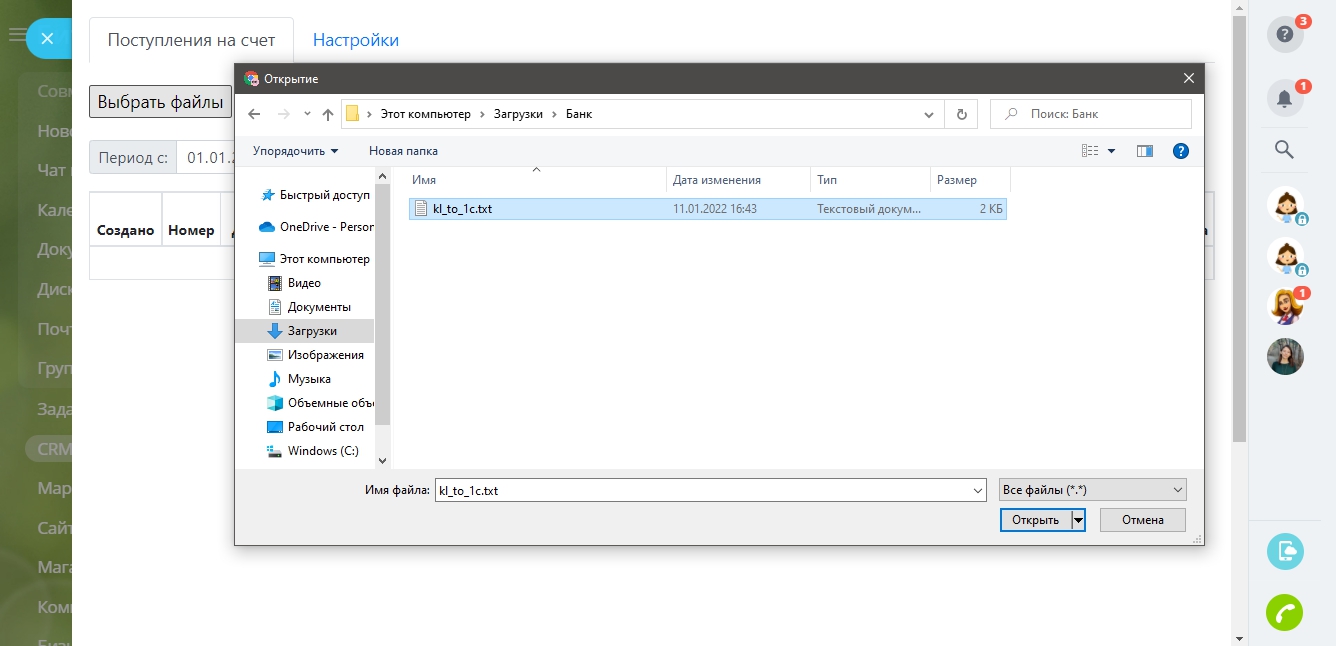 Если документы загрузились, но без связи с Счетом, проверьте, что в CRM есть счет с таким же номером, как и в назначении платежа.