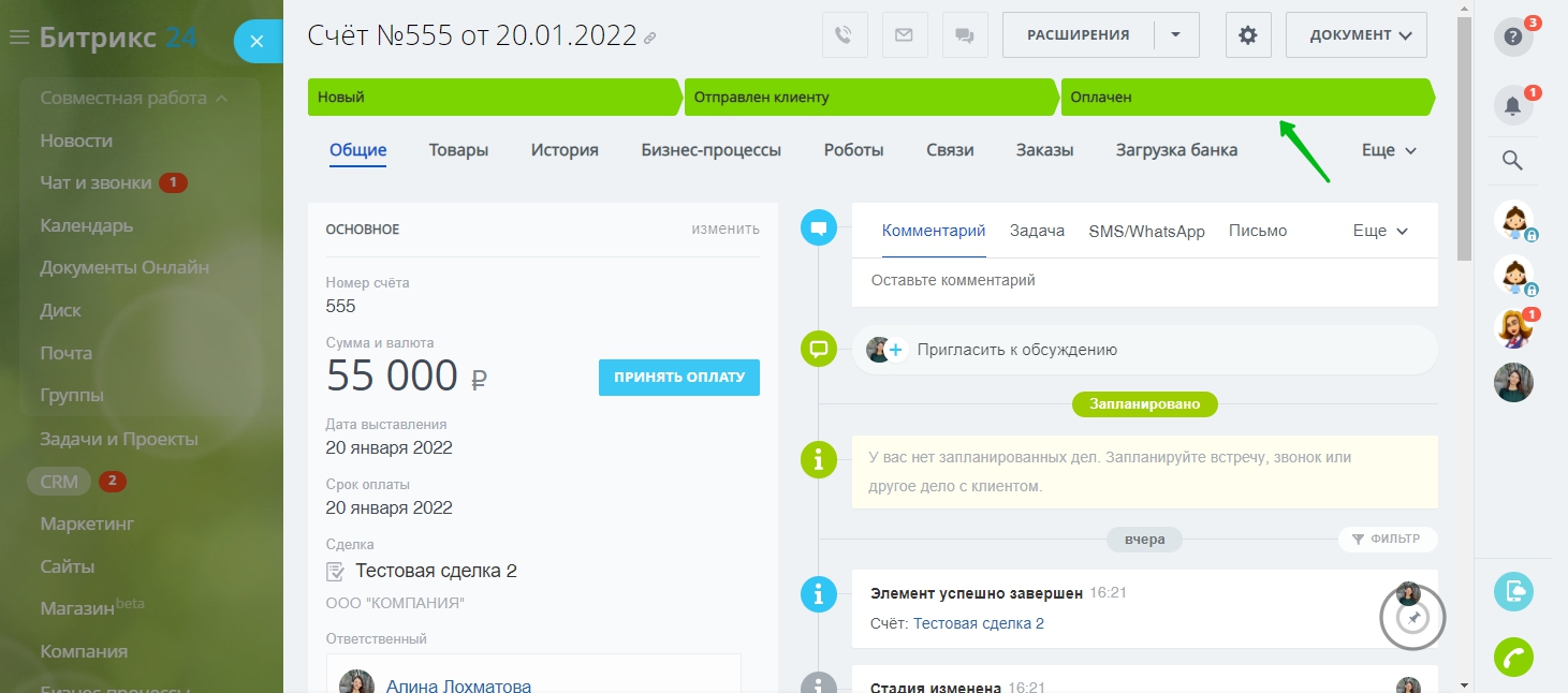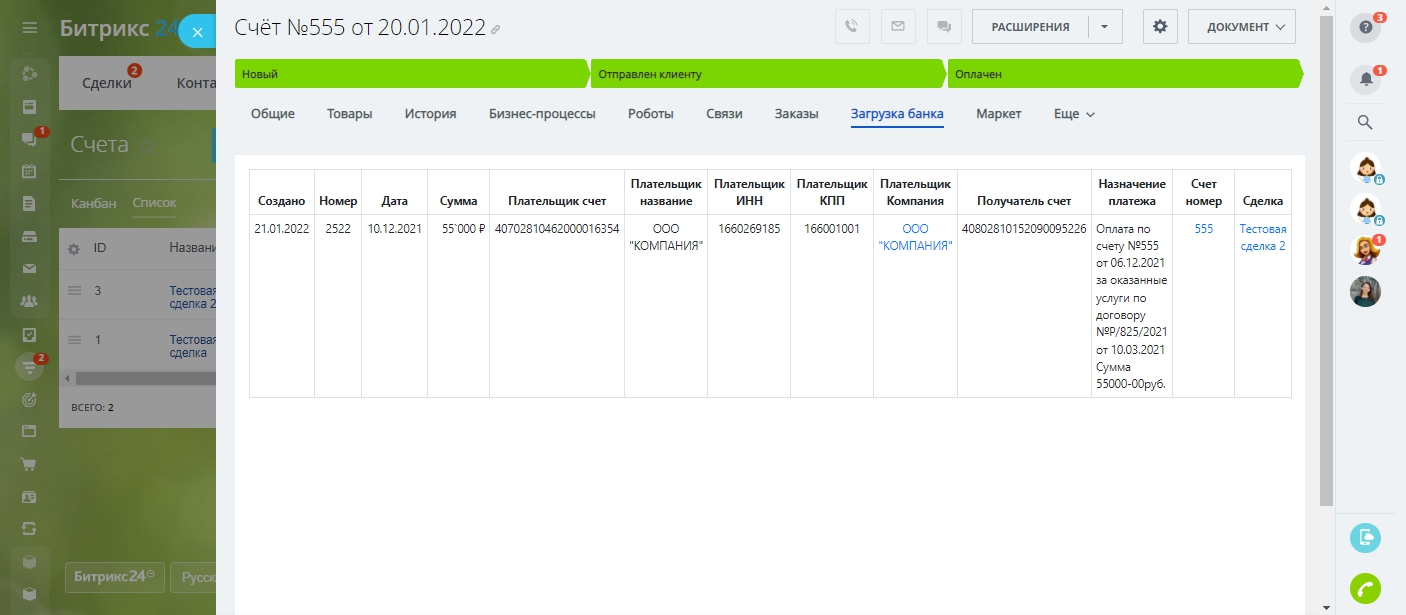 Загружайте выписку банка в Битрикс24. Менеджеры мгновенно получат оповещения об оплатах, а статусы счетов автоматически изменятся на “Оплачен”.